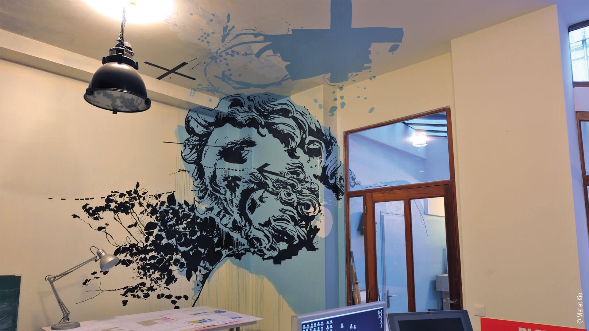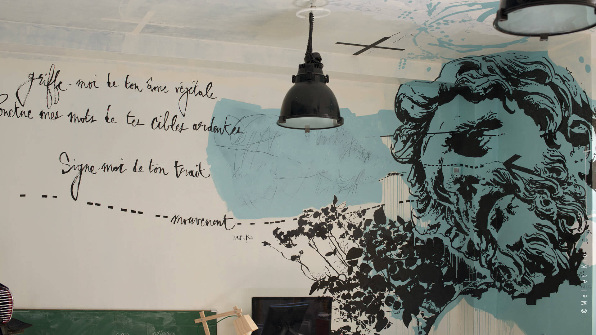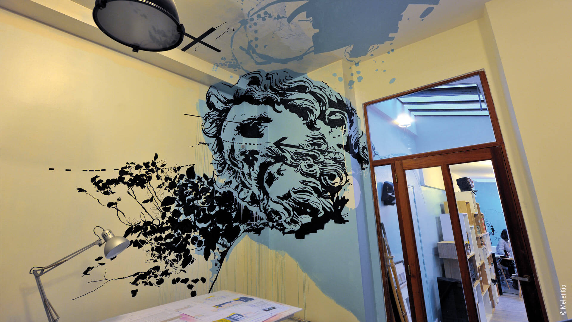 Oeuvre murale d’un portrait en anamorphose sur l’angle de mur de l’atelier du duo des wall artists, leur atelier du Marais est en constante évolution.