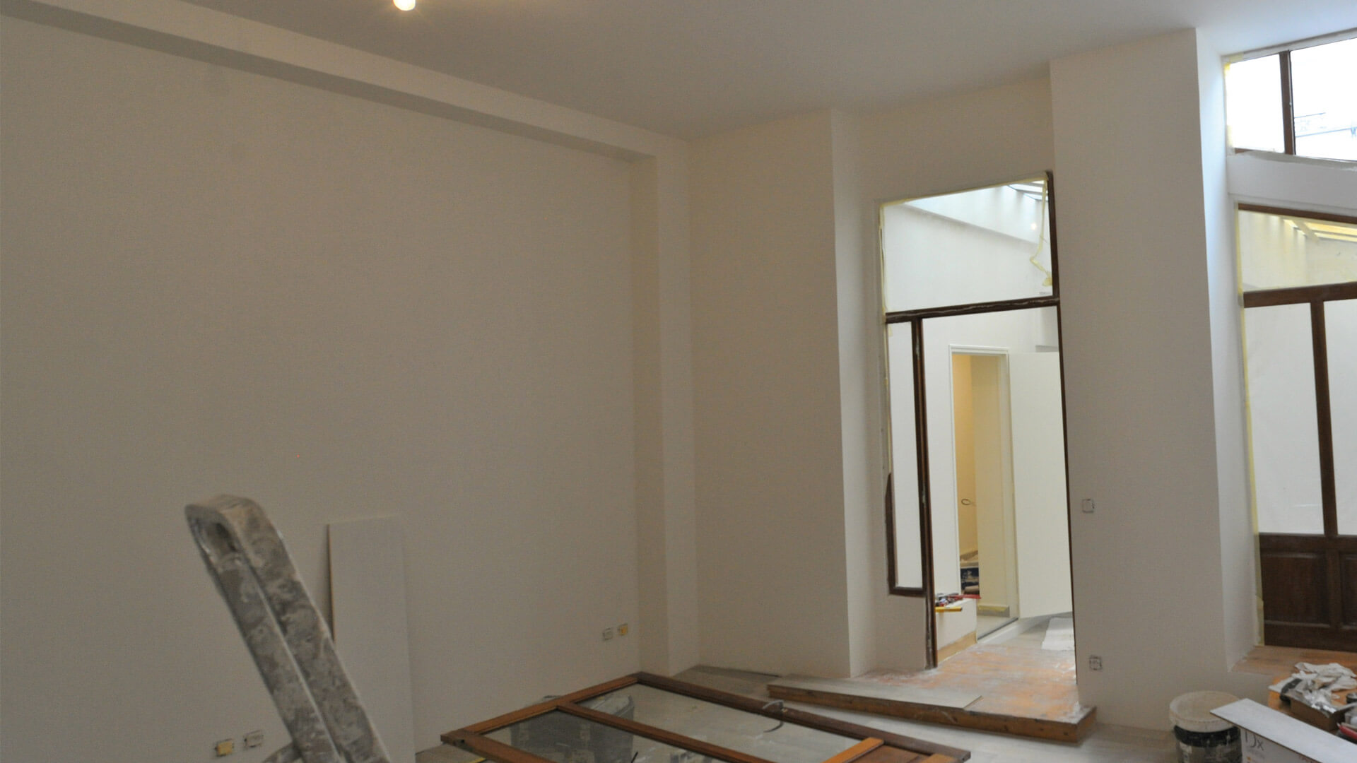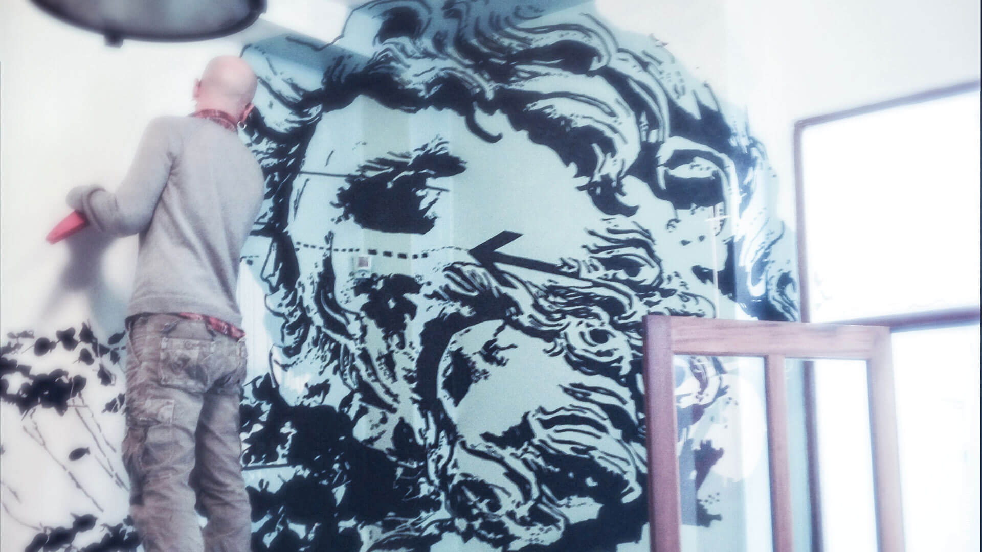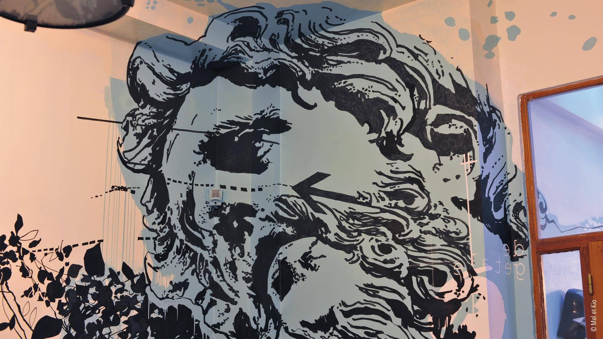 Oeuvre murale d’un portrait en anamorphose sur l’angle de mur de l’atelier du duo des wall artists, leur atelier du Marais est en constante évolution.