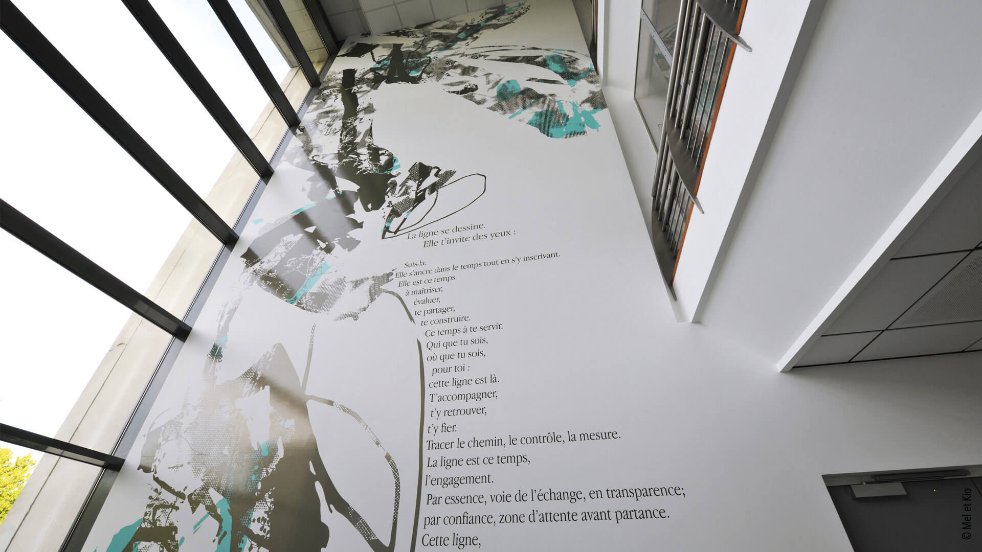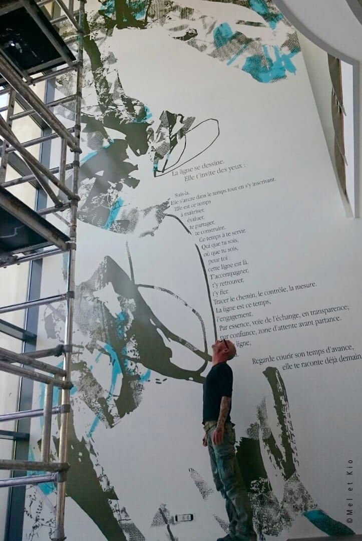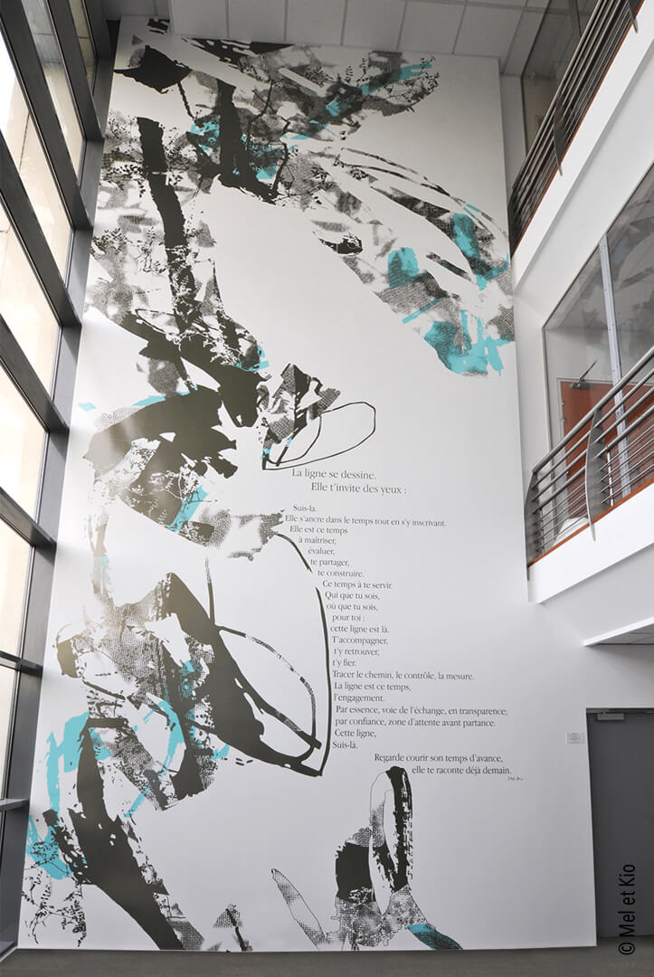 Design mural monumental dans l’entrée du siège social du groupe SED à Roissy-en-France. Œuvre murale originale sur mesure entièrement réalisé à la main. Les deux artistes spécialisés dans l’identité des lieux proposent dans l’entrée du siège d’entreprise une fresque monumentale qui traite du déplacent et du parcours spécialité du transporteur. La trace à l’encre de chine typique de la signature de Mel et Kio cours dans l’entrée du siège des bureaux de l’entreprise de transport.