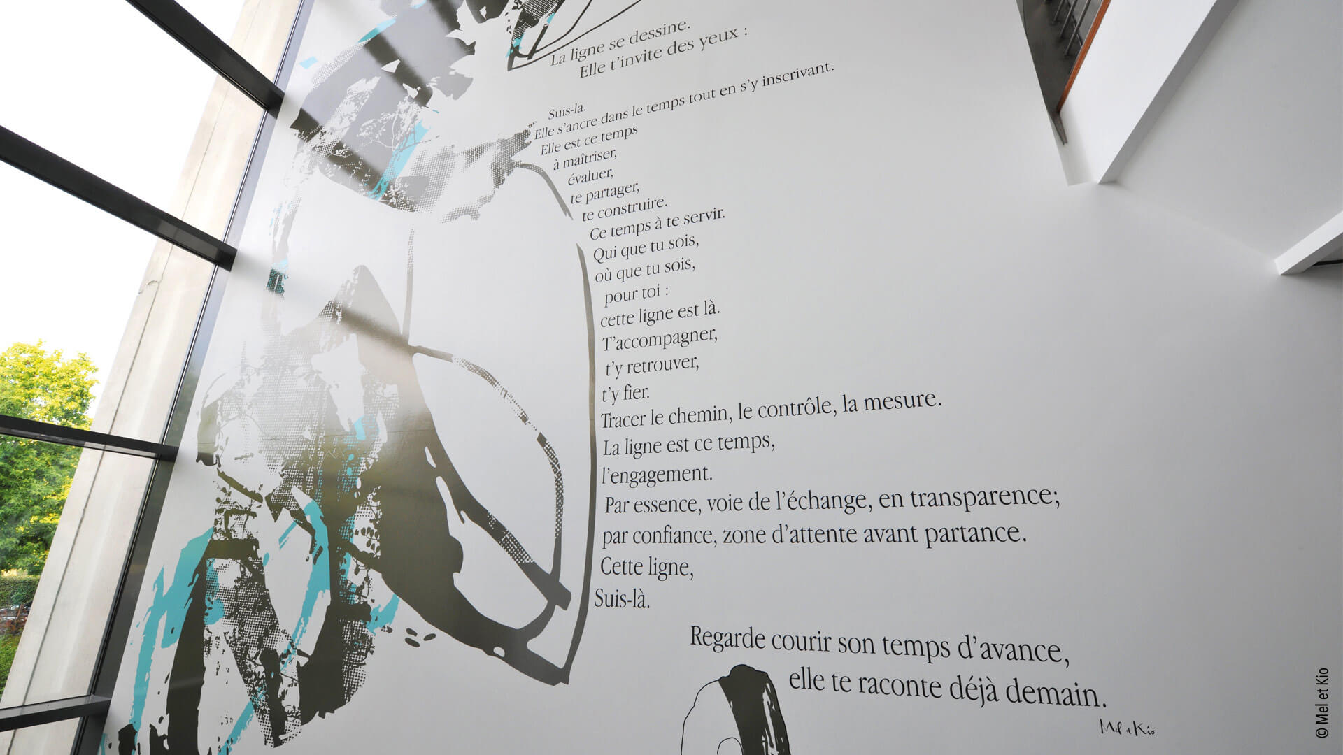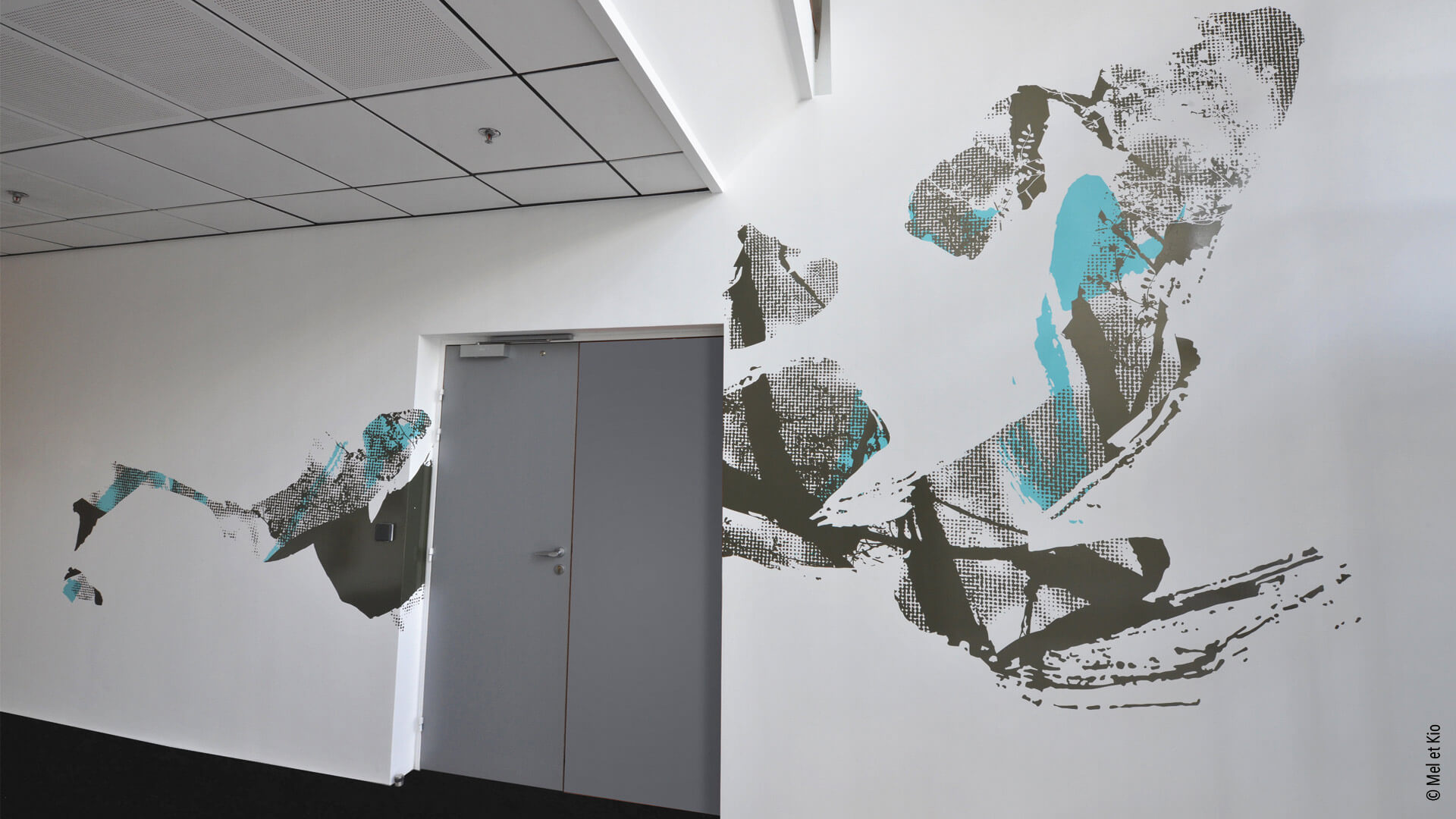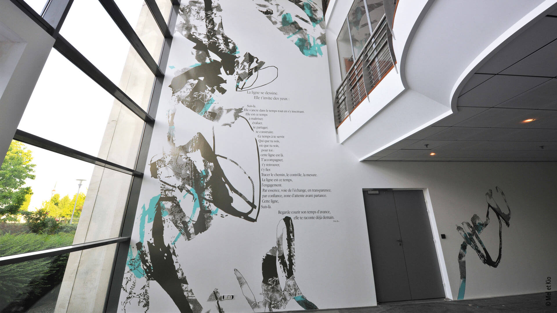 Design mural monumental dans l’entrée du siège social du groupe SED à Roissy-en-France. Œuvre murale originale sur mesure entièrement réalisé à la main. Les deux artistes spécialisés dans l’identité des lieux proposent dans l’entrée du siège d’entreprise une fresque monumentale qui traite du déplacent et du parcours spécialité du transporteur. La trace à l’encre de chine typique de la signature de Mel et Kio cours dans l’entrée du siège des bureaux de l’entreprise de transport.