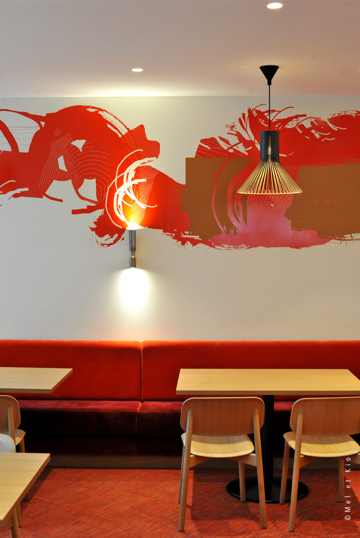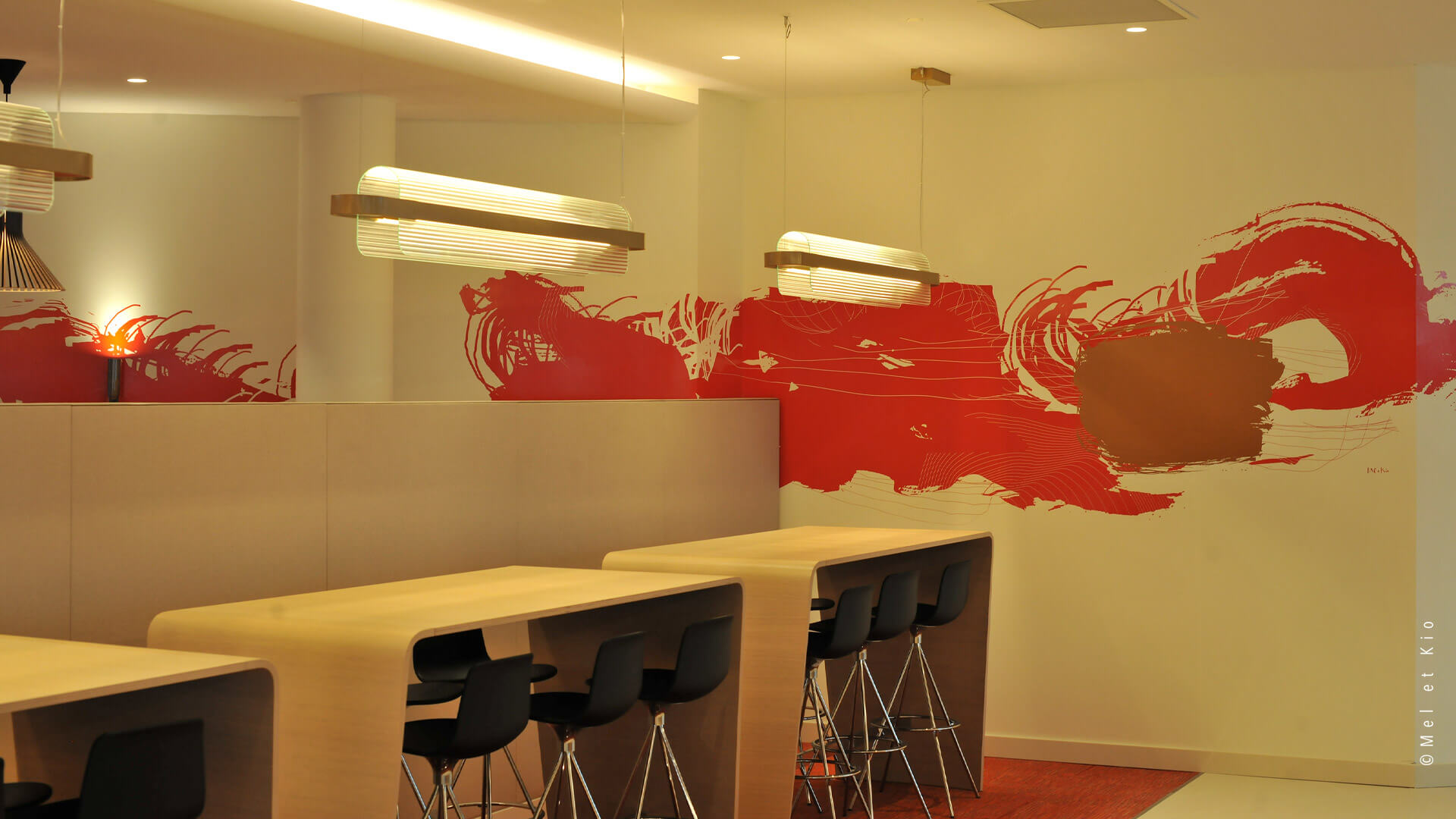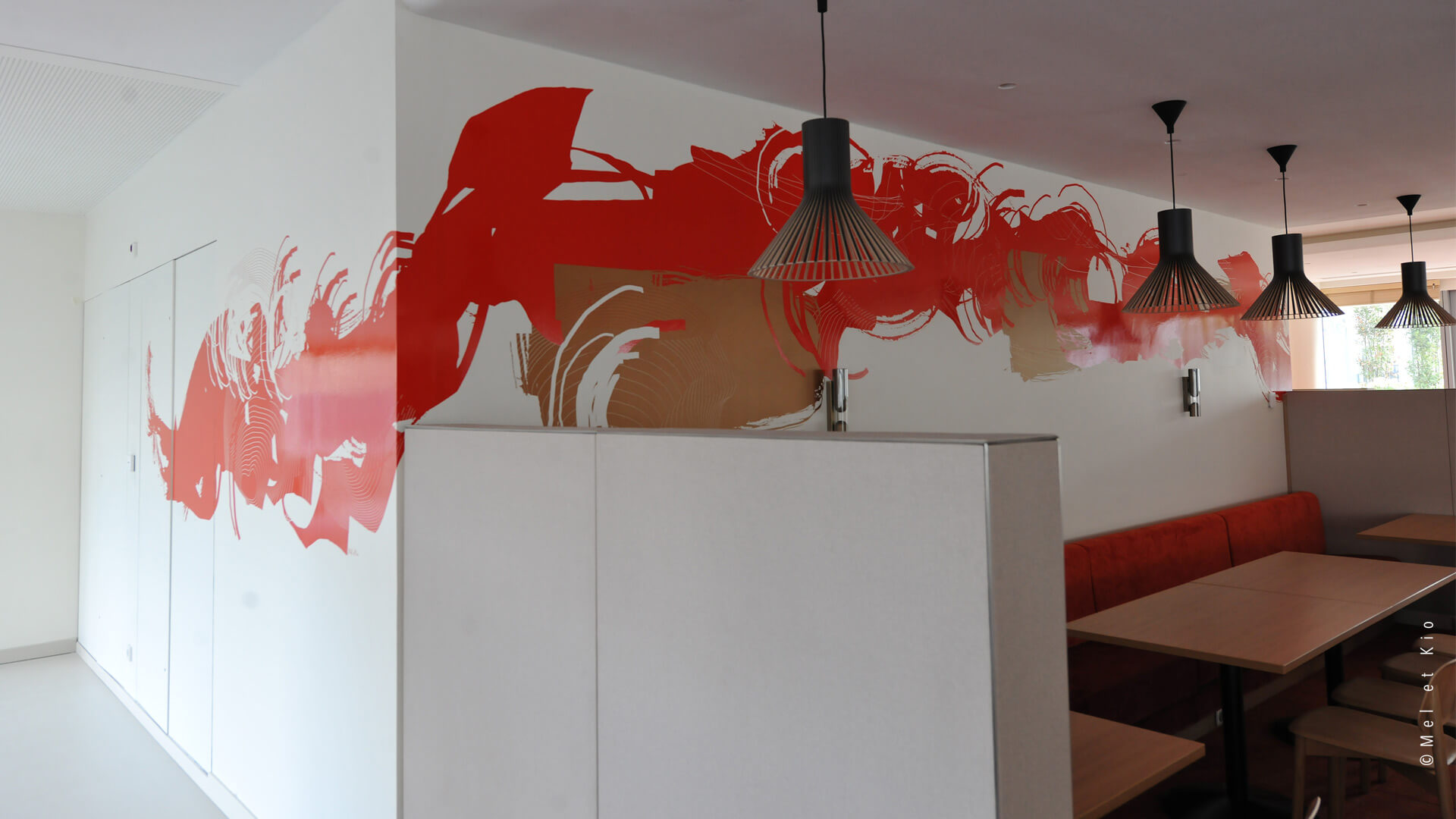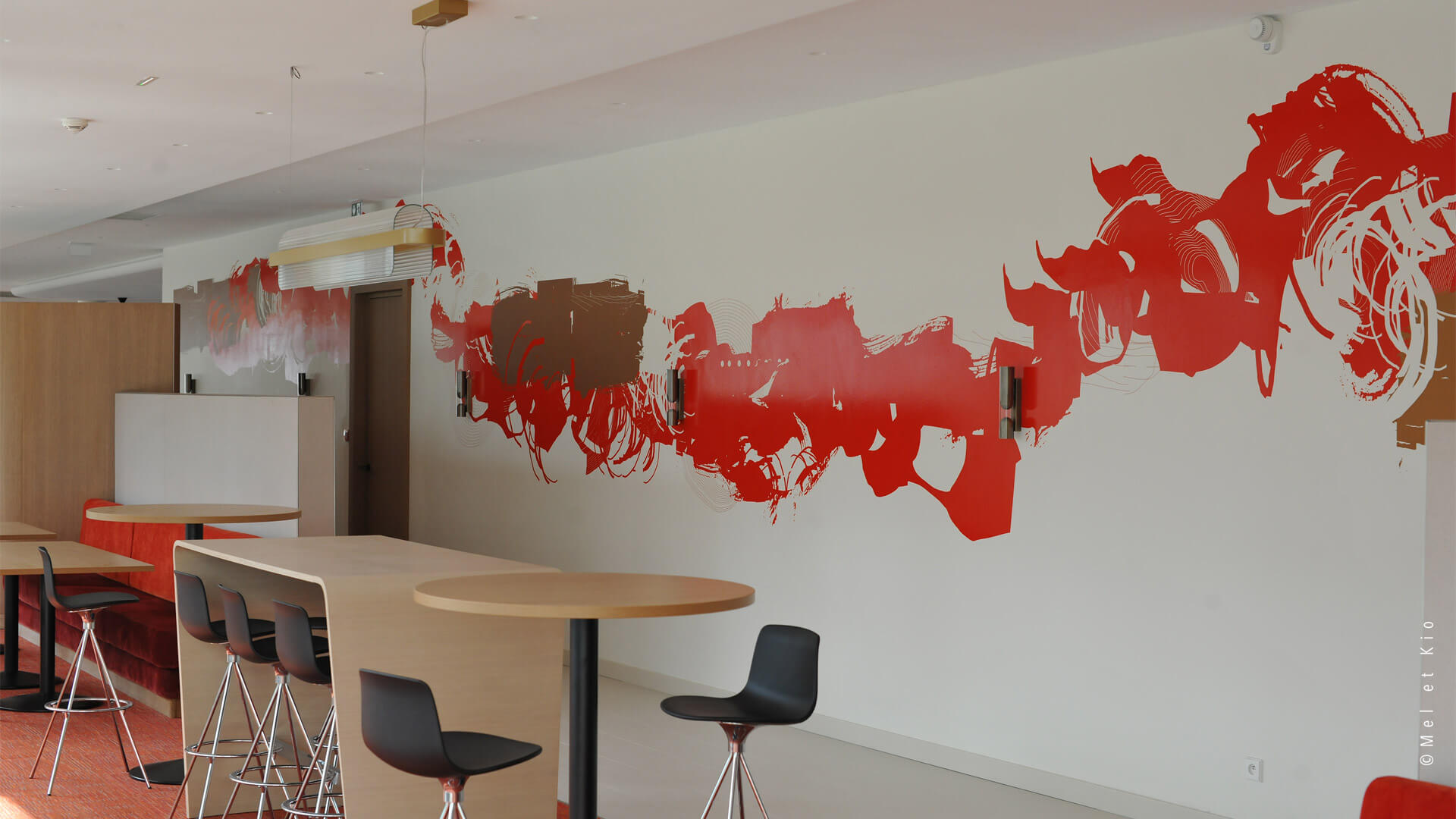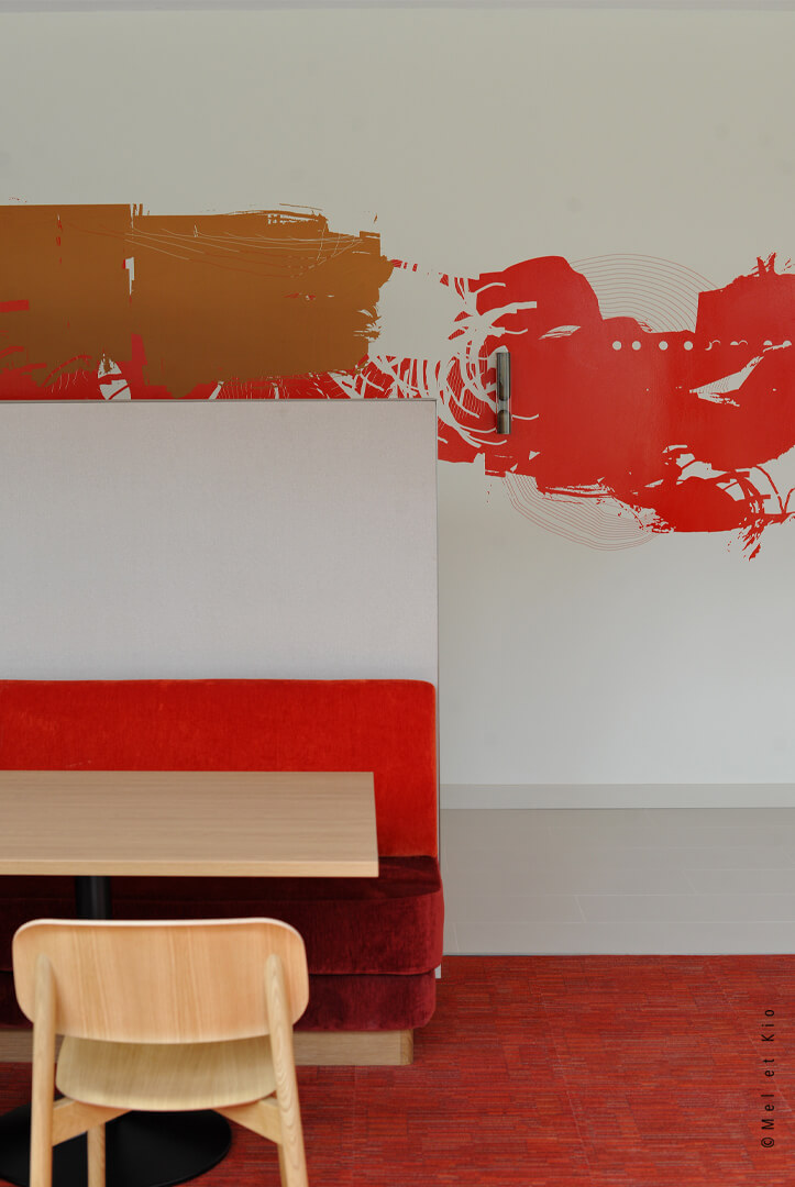Mel et Kio ont été sollicités pour conseiller, créer et mettre en oeuvre leur art mural sur les circulations du tout nouveau complexe d’immeubles à Bagneux. Les espaces de restauration d’entreprise sont sublimés par cette trace qui danse dans le lieu et lui donne une identité murale toute particulière.
