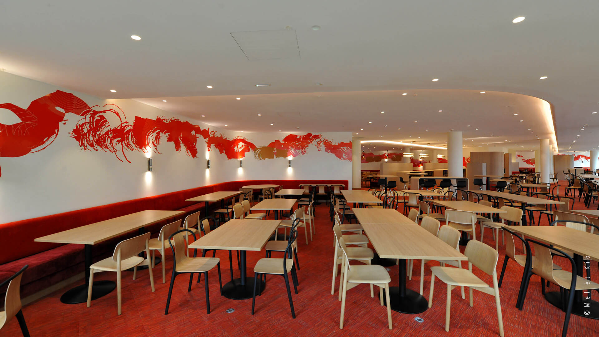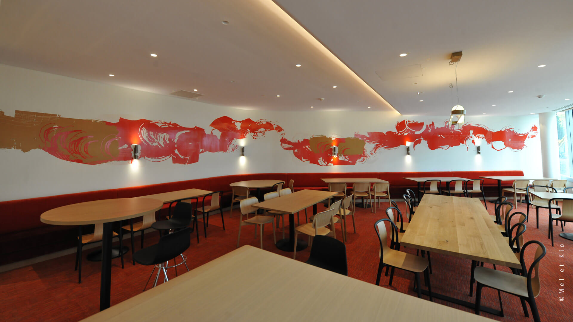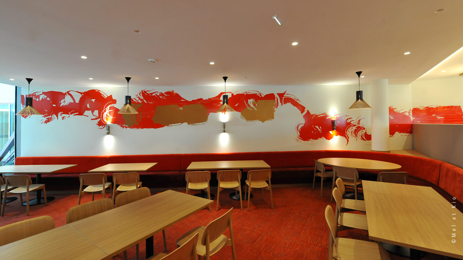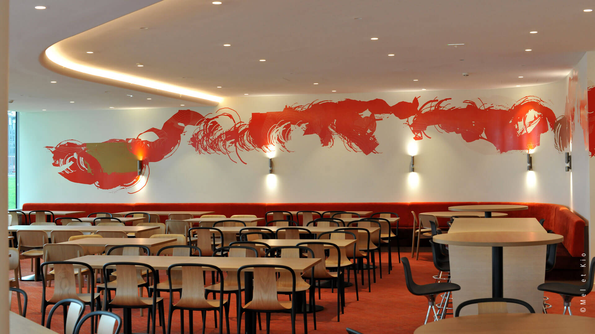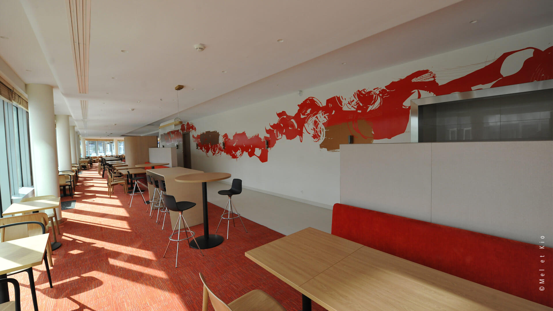 Mel et Kio ont été sollicités pour conseiller, créer et mettre en oeuvre leur art mural sur les circulations du tout nouveau complexe d’immeubles à Bagneux. Les espaces de restauration d’entreprise sont sublimés par cette trace qui danse dans le lieu et lui donne une identité murale toute particulière.
