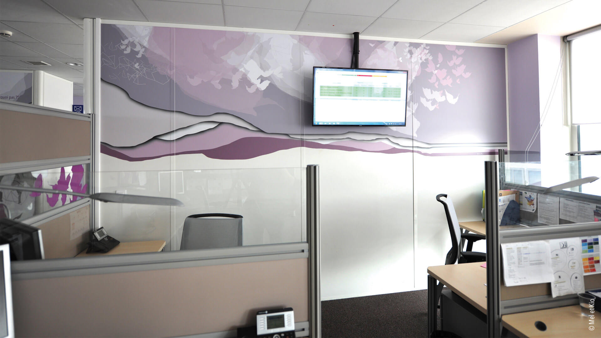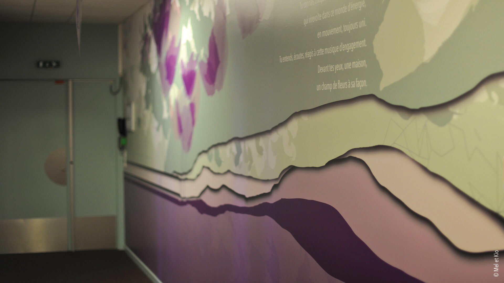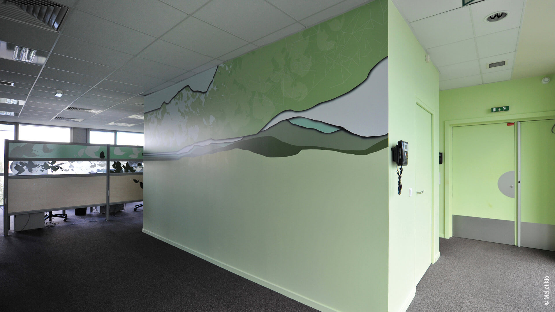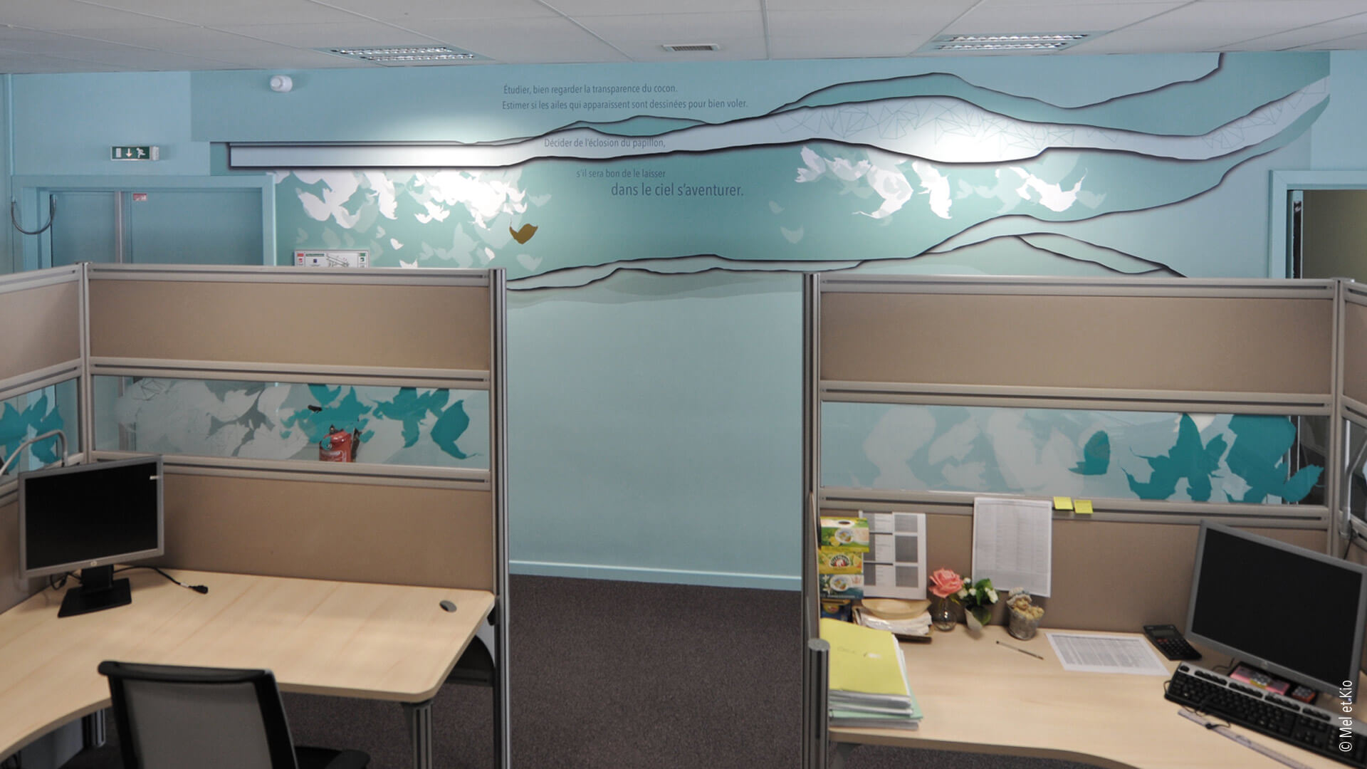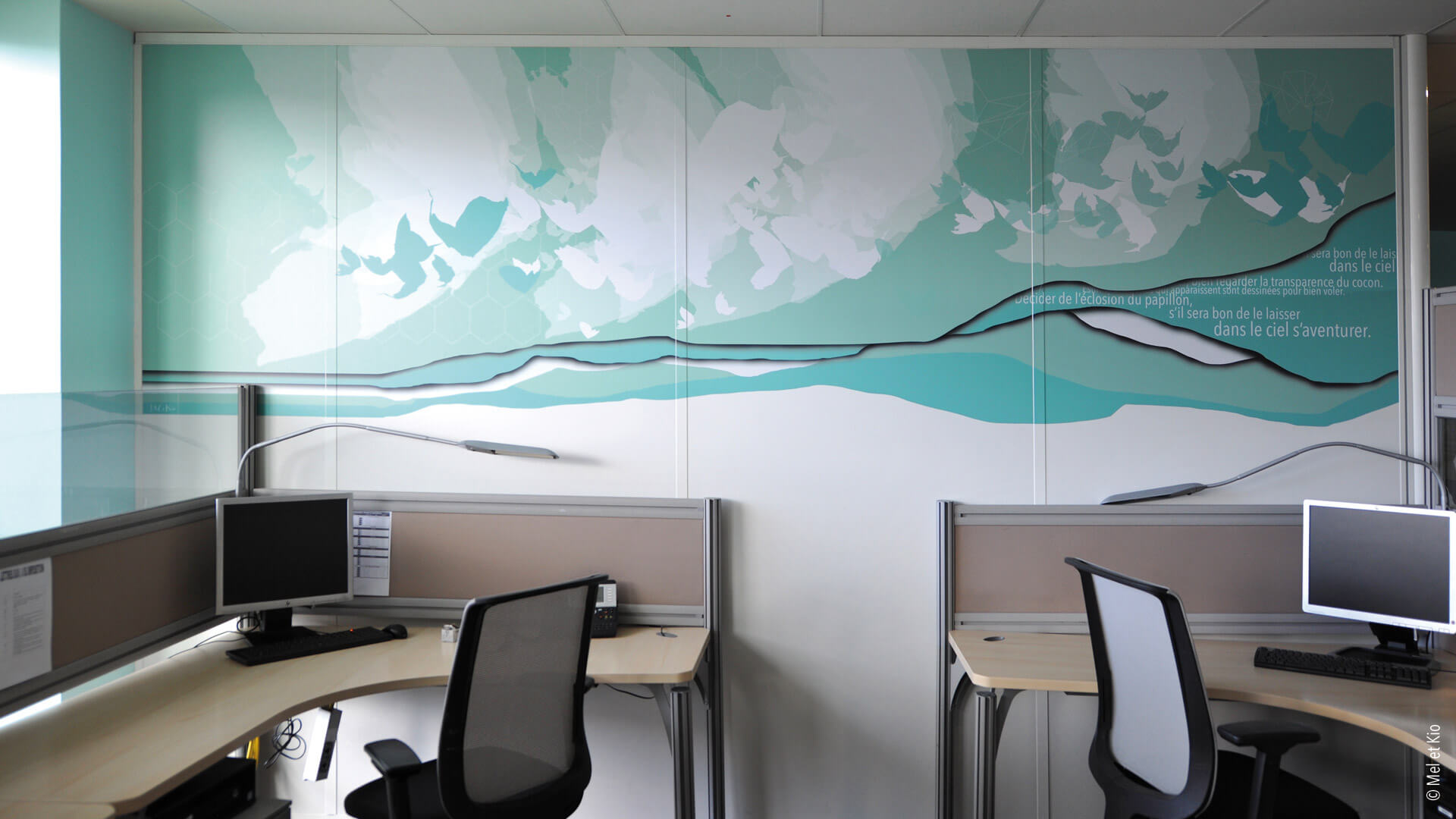 Le comité directoire  de l’entreprise à demandé à Mel et Kio de travailler à l’identité murale de leur lieu. Ces fresques murales sur mesure proposent une identité forte au siège de La Banque Postale Financement à Saint Denis