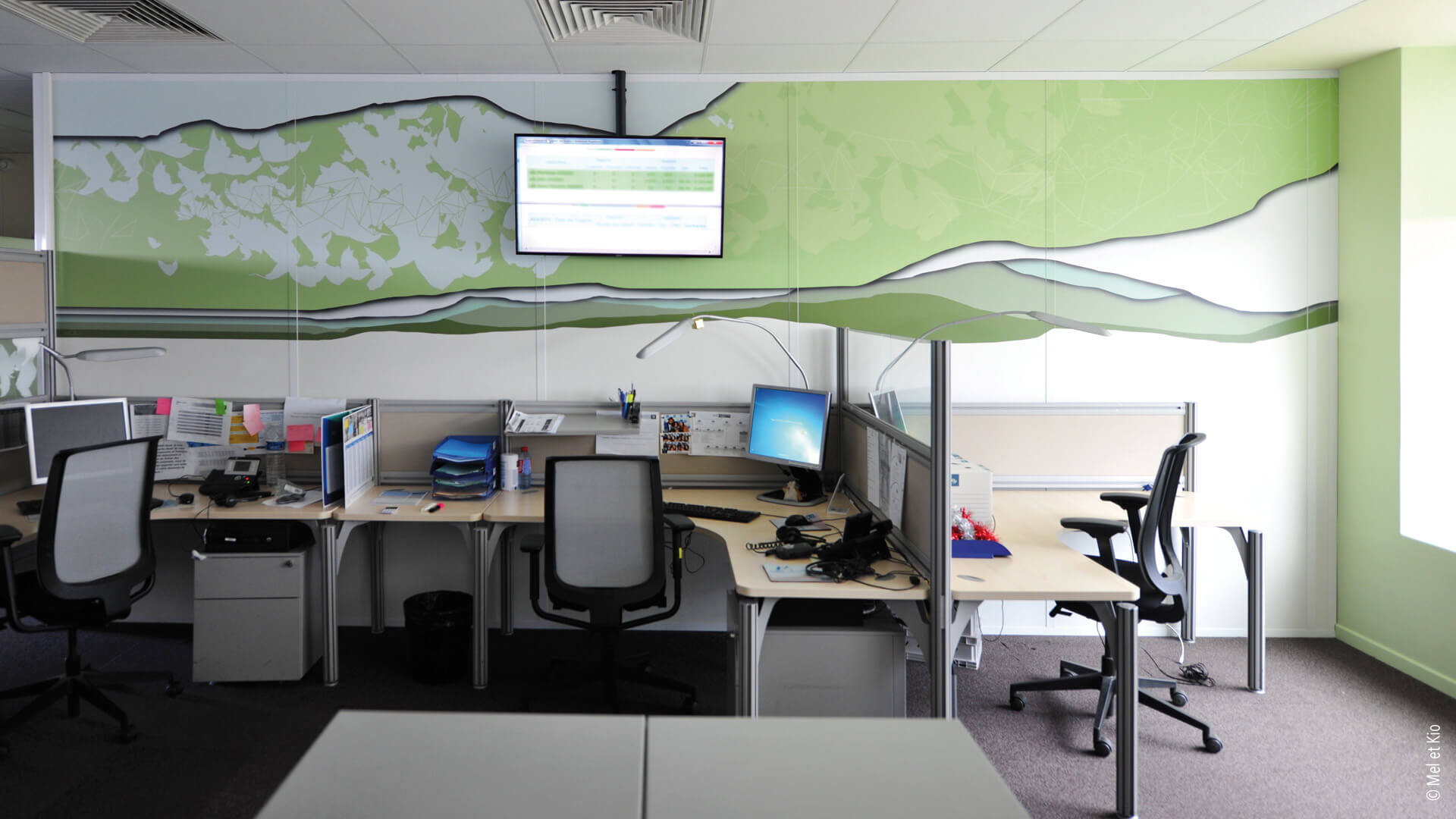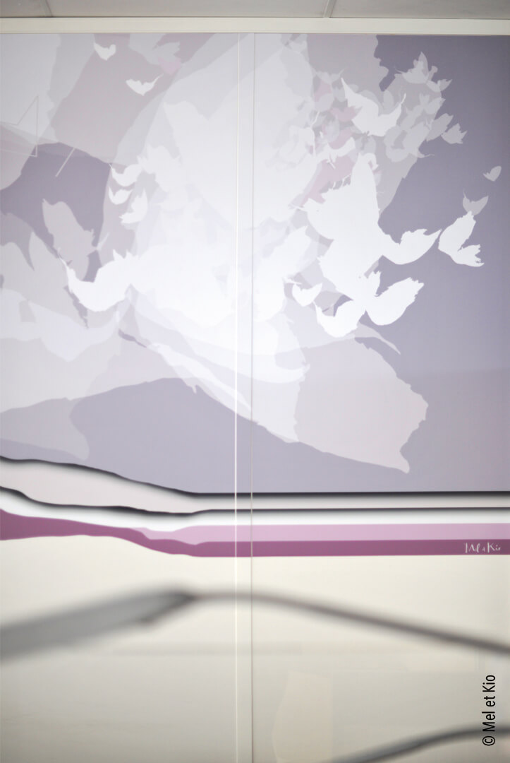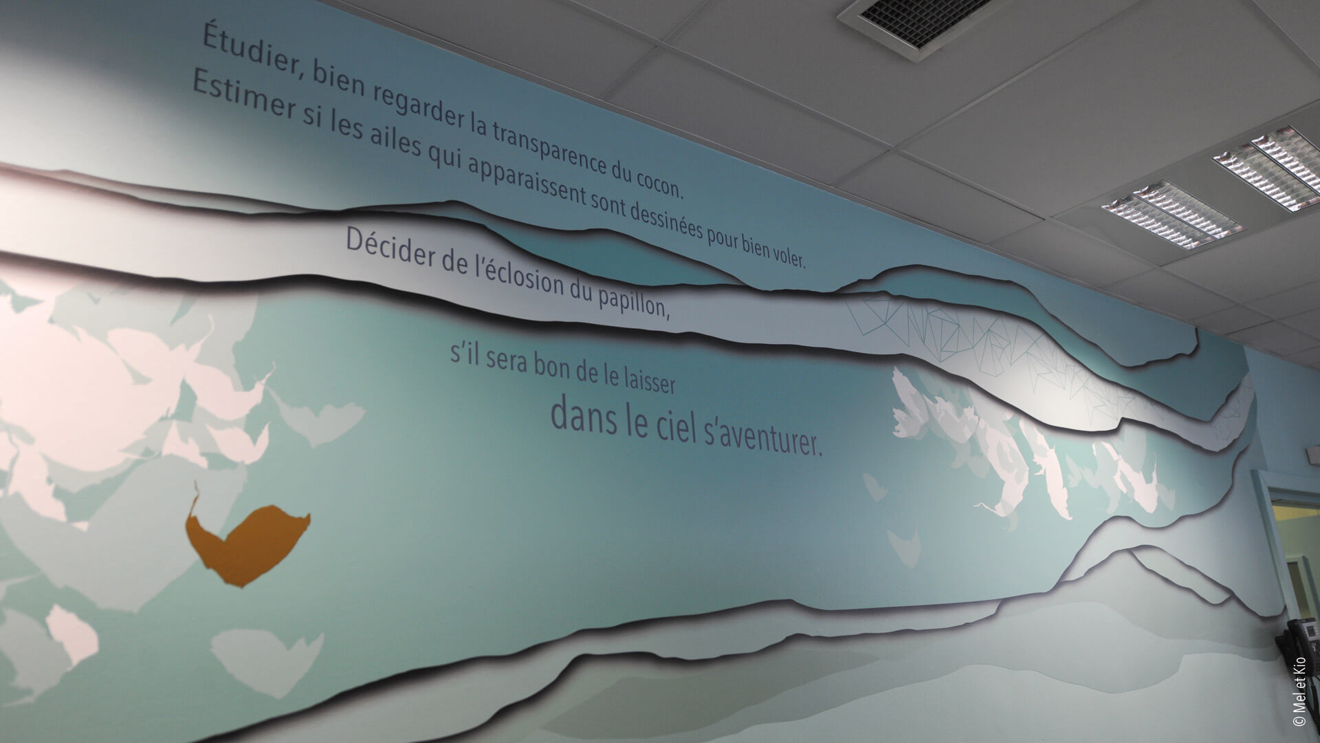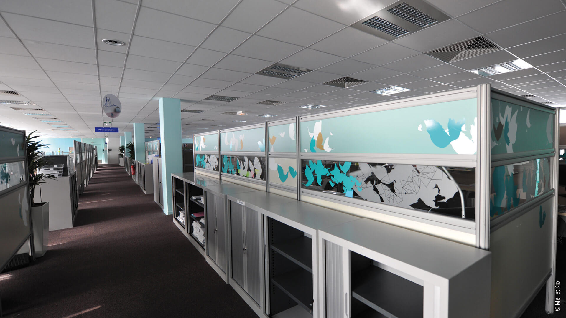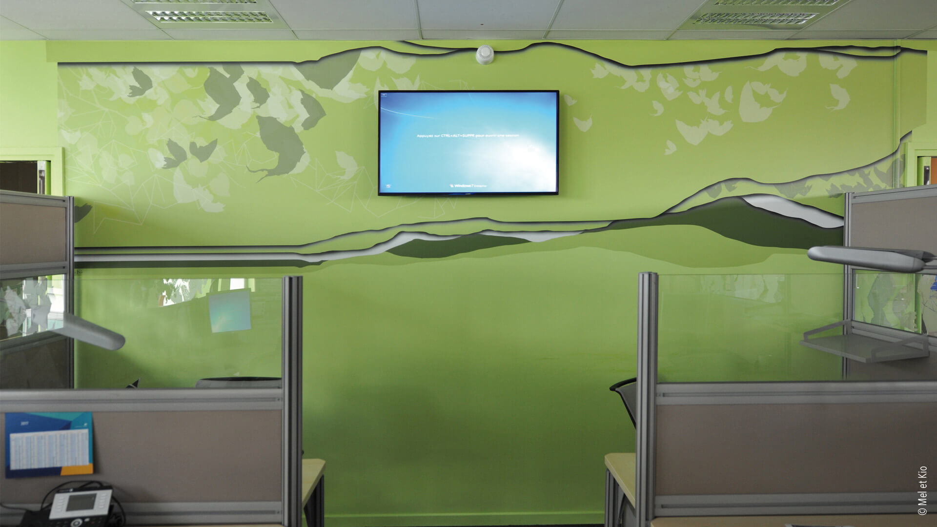 Le comité directoire  de l’entreprise à demandé à Mel et Kio de travailler à l’identité murale de leur lieu. Ces fresques murales sur mesure proposent une identité forte au siège de La Banque Postale Financement à Saint Denis