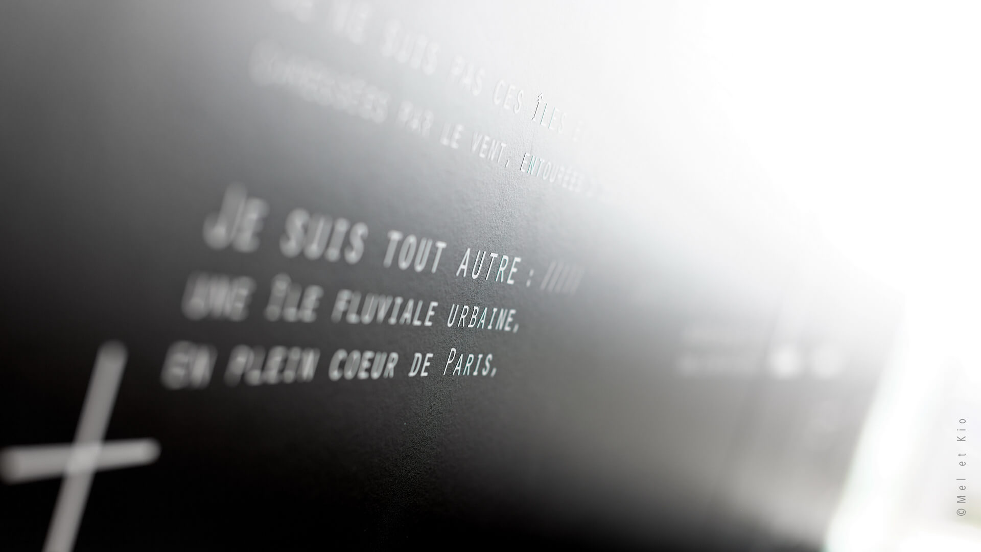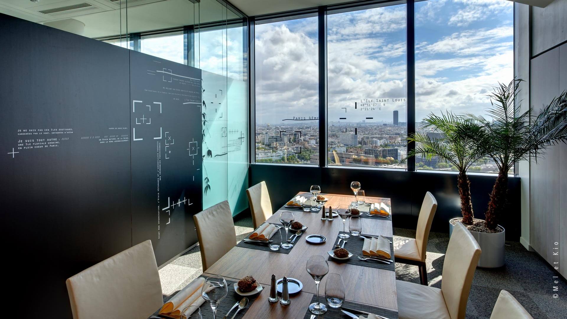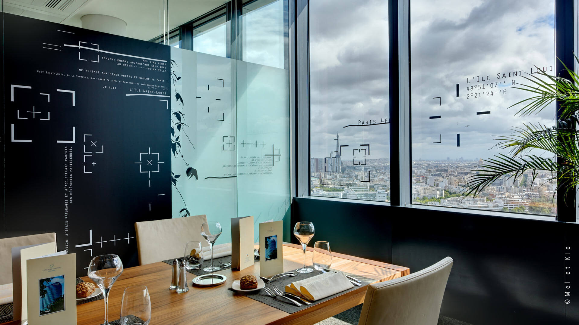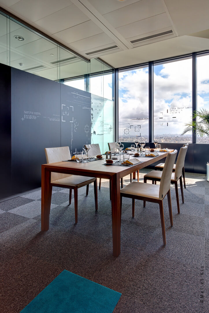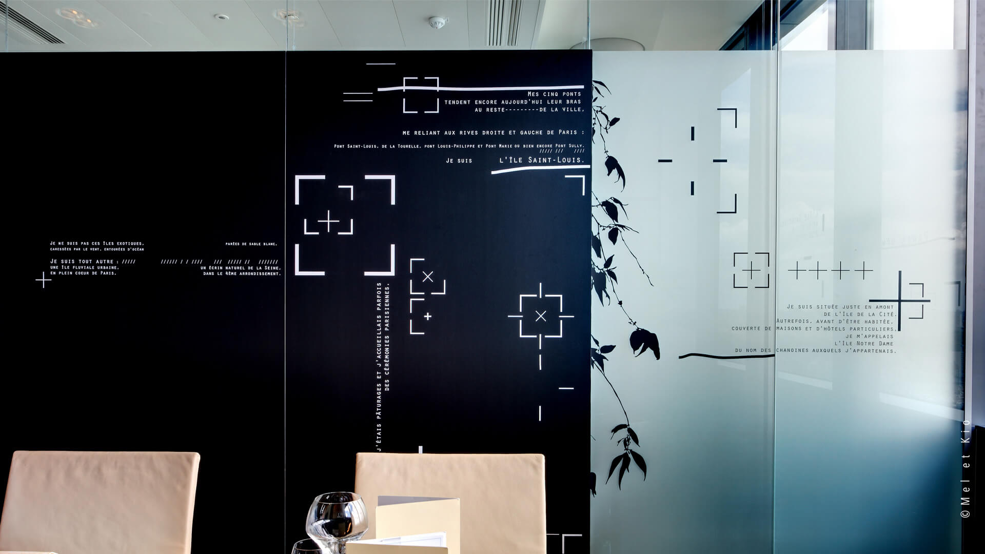 Le concept de design mural pour ce salon privé de restauration au sein du siège de bureaux de Bouygues Telecom, consiste à placer une personne à un emplacement précis pour que tous les textes désignent des points de vues.