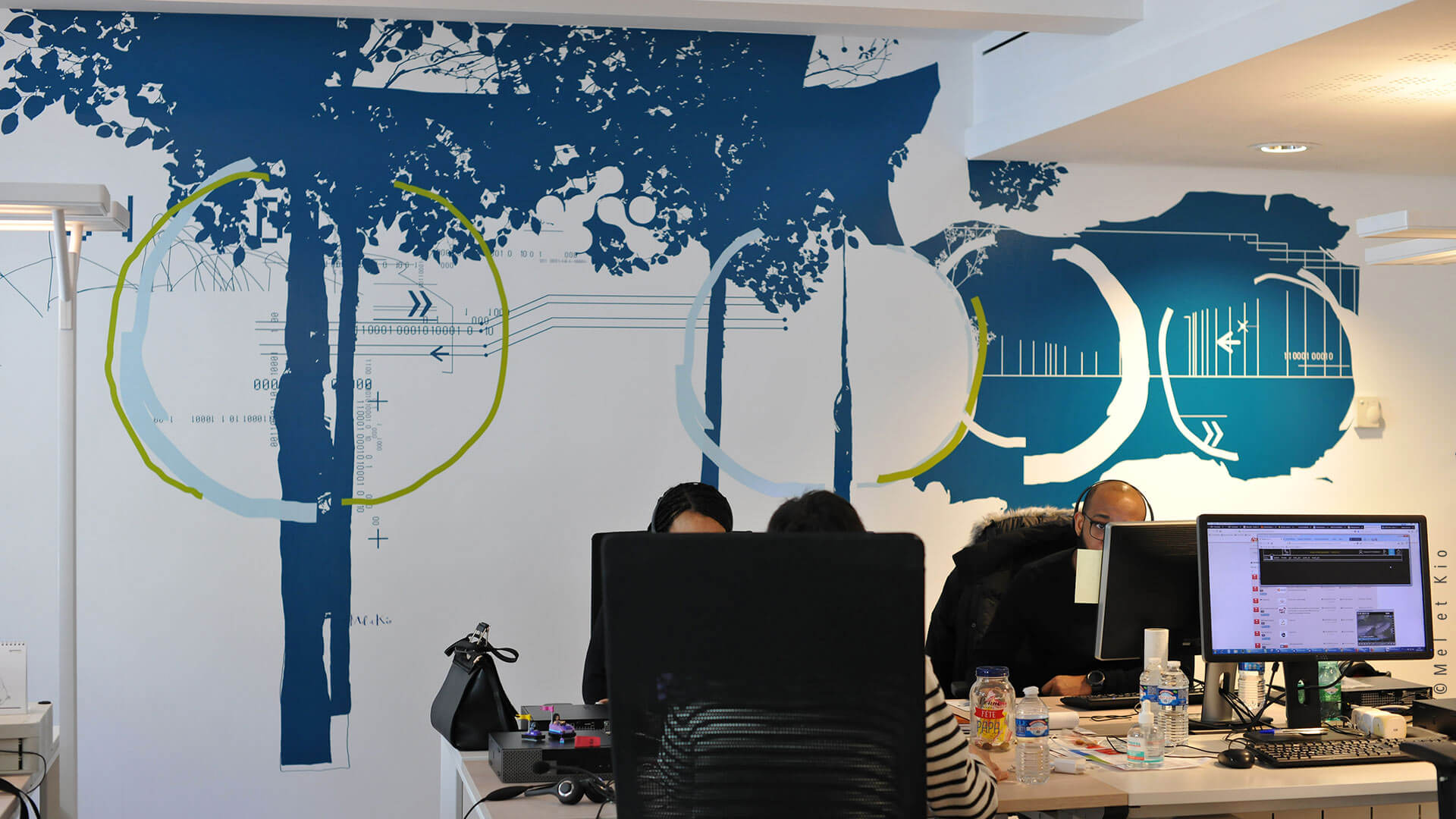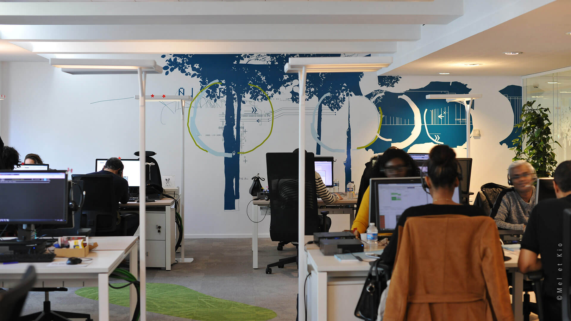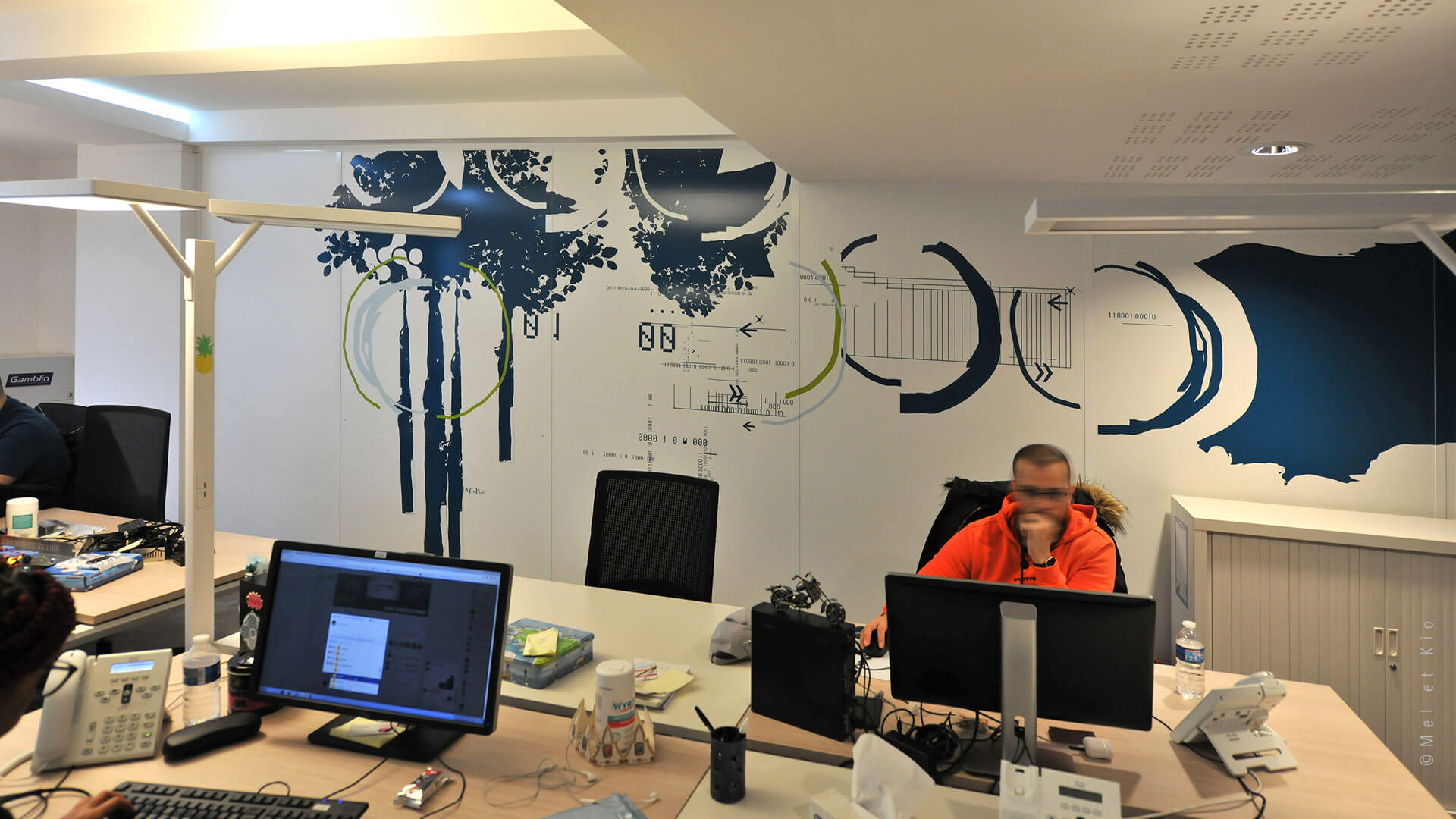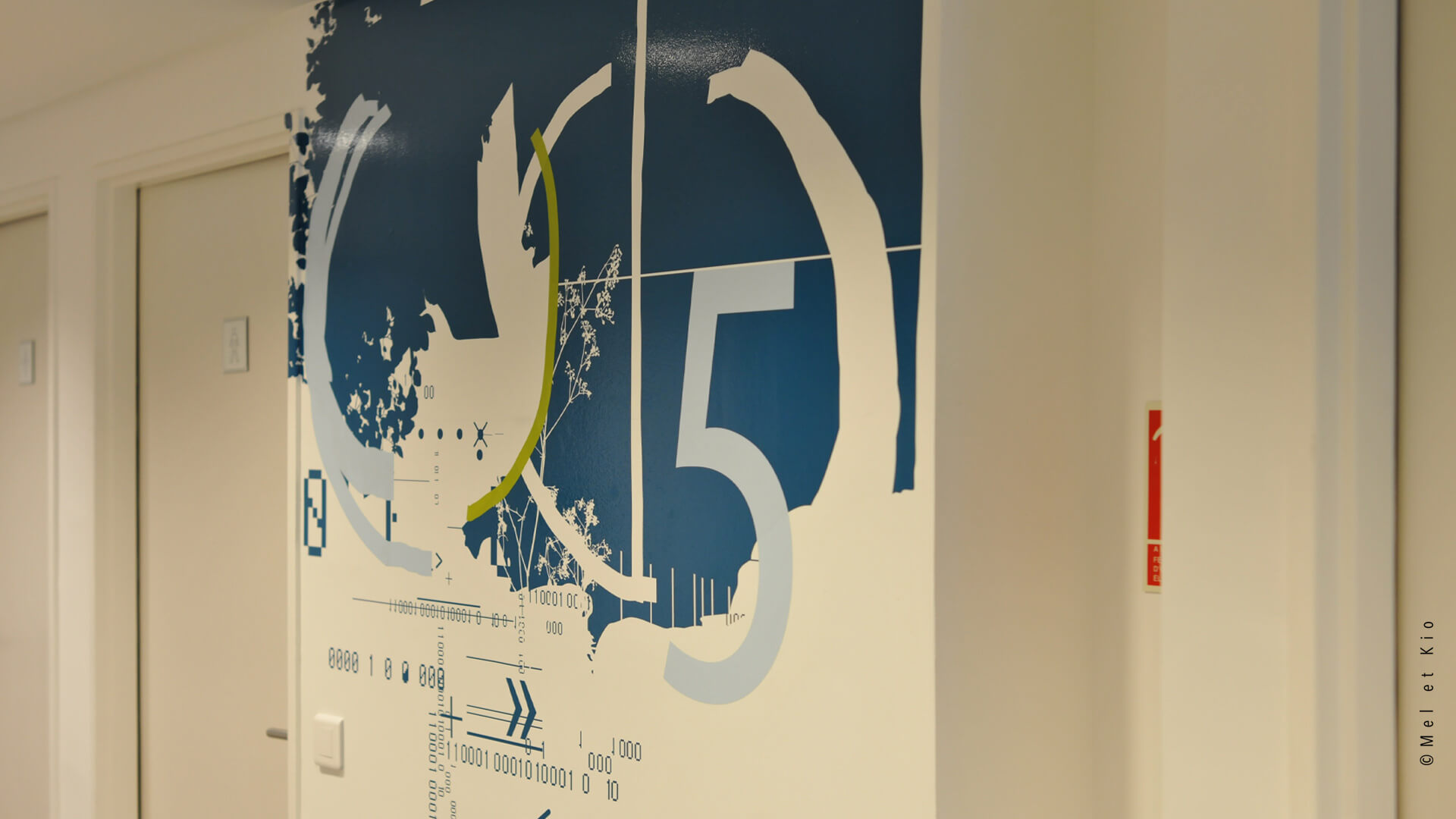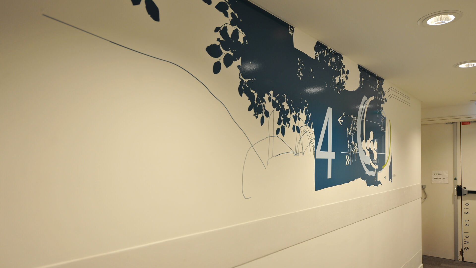 Identité murale et signalétique palières sur mesure pour les circulations des bureaux d’entreprise.