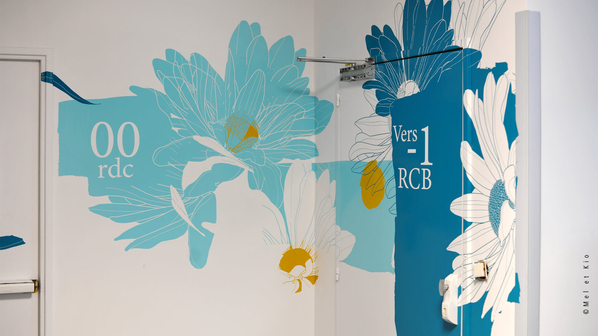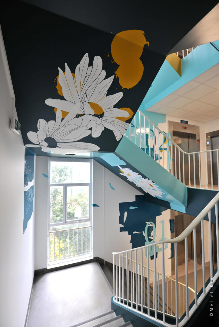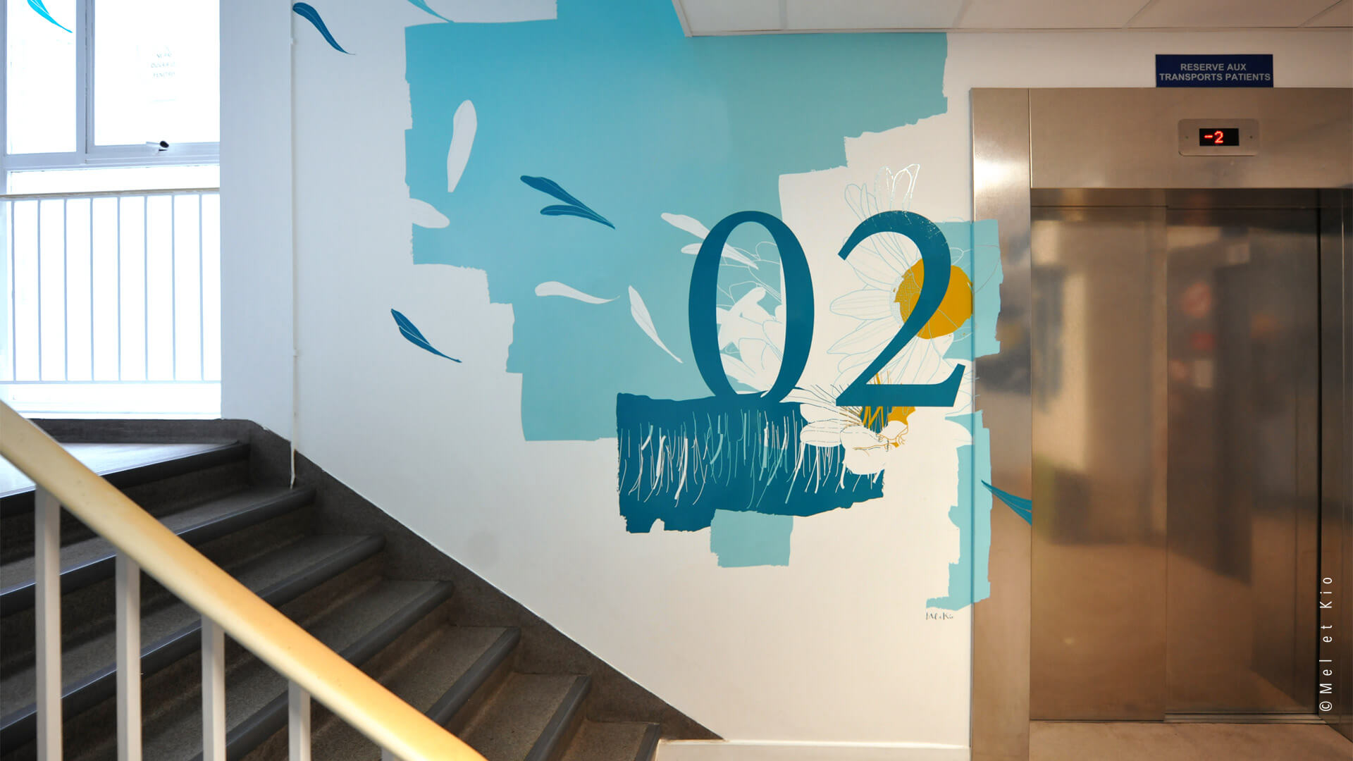 Le design mural typique de la signature des artistes ré-enchante l’escalier et propose une décoration murale de l’hopital ainsi qu’une signalétique qui permet de mieux lire l’espace. Cet art mural particulier marque la collaboration durable entre L’APHP et Mel et Kio