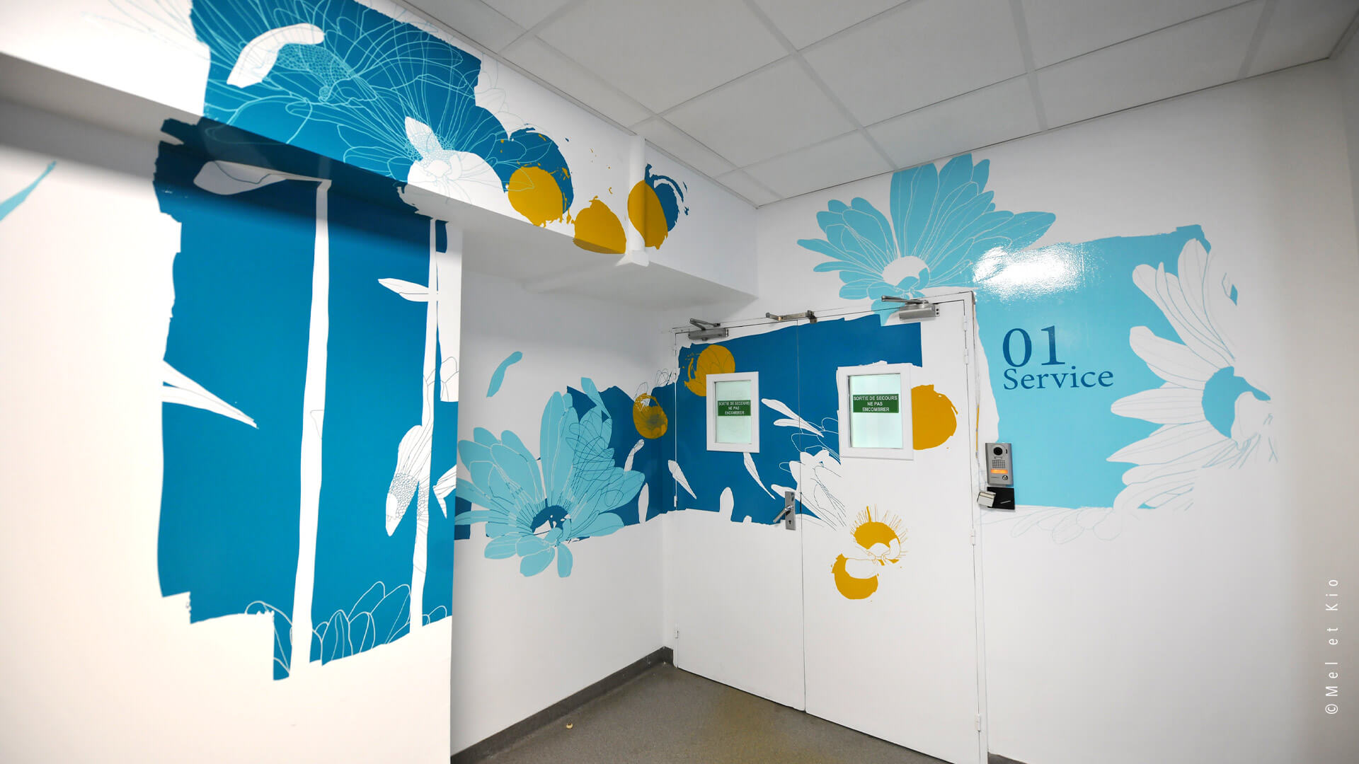 Les décorations murales sur mesure courent sur les 6 niveaux du service pédiatrique de l’hôpital. Des fresques d’intérieures originales réalisées à  la main et signées du duo d’artistes Mel et Kio.