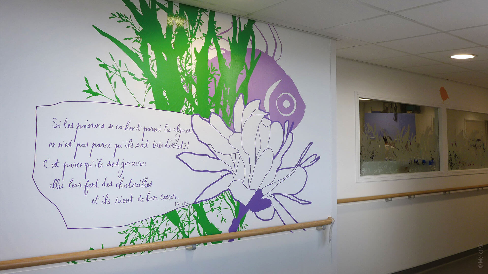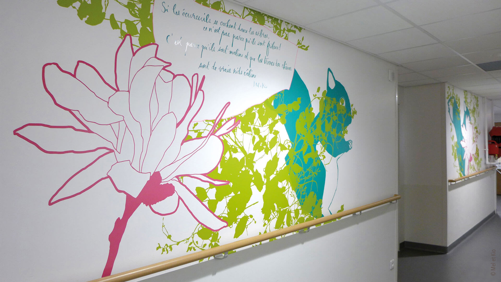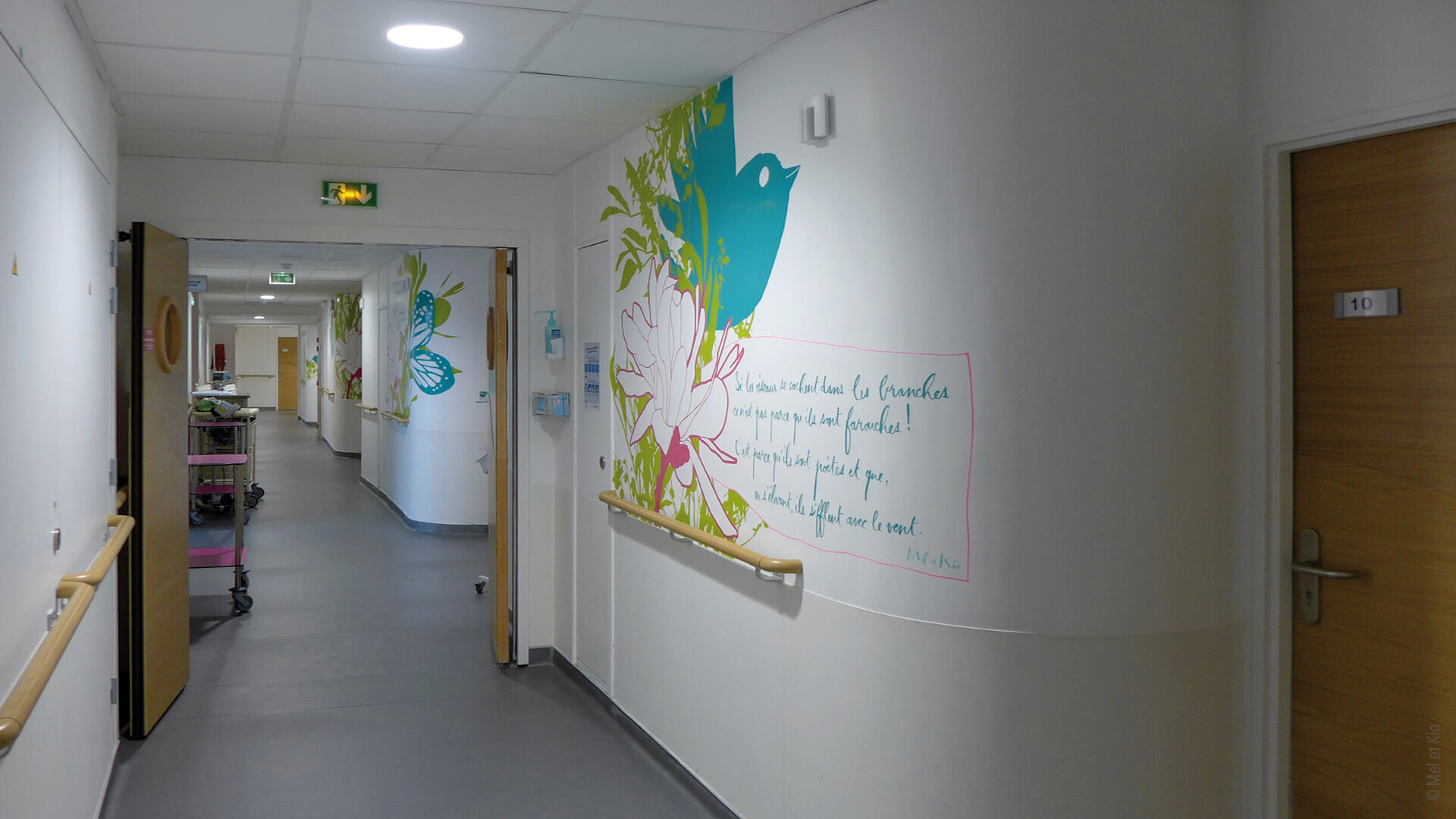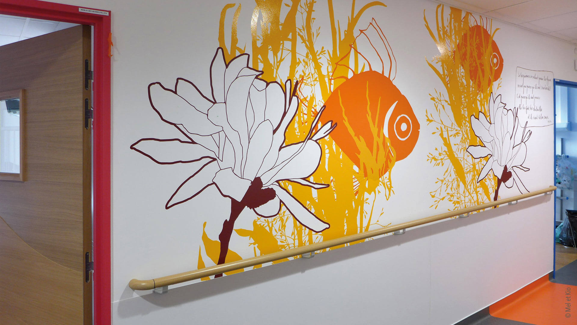 Ces décoration murales de l’hopital sont sur mesure et particulière du style des deux artistes Mel et Kio.