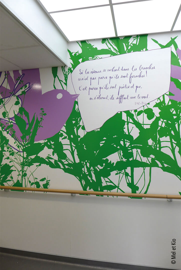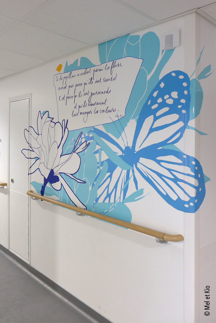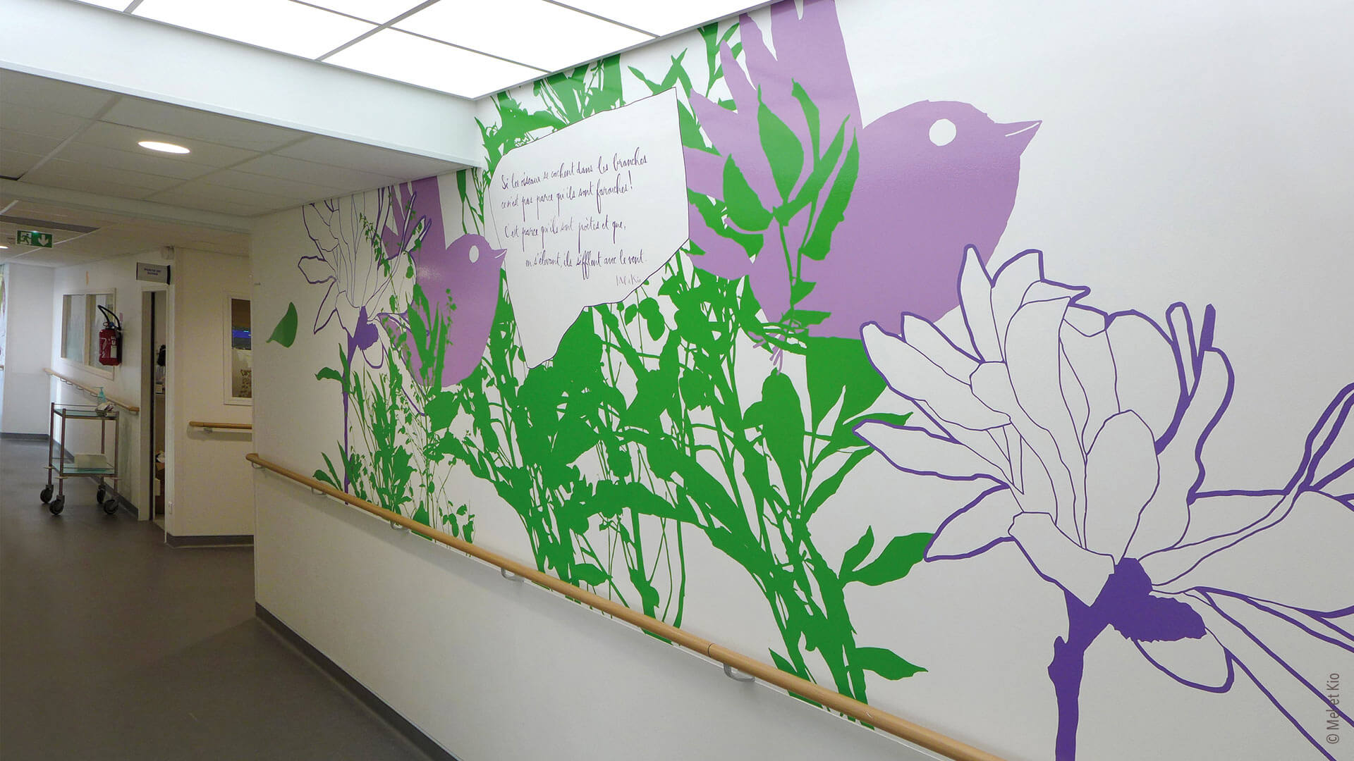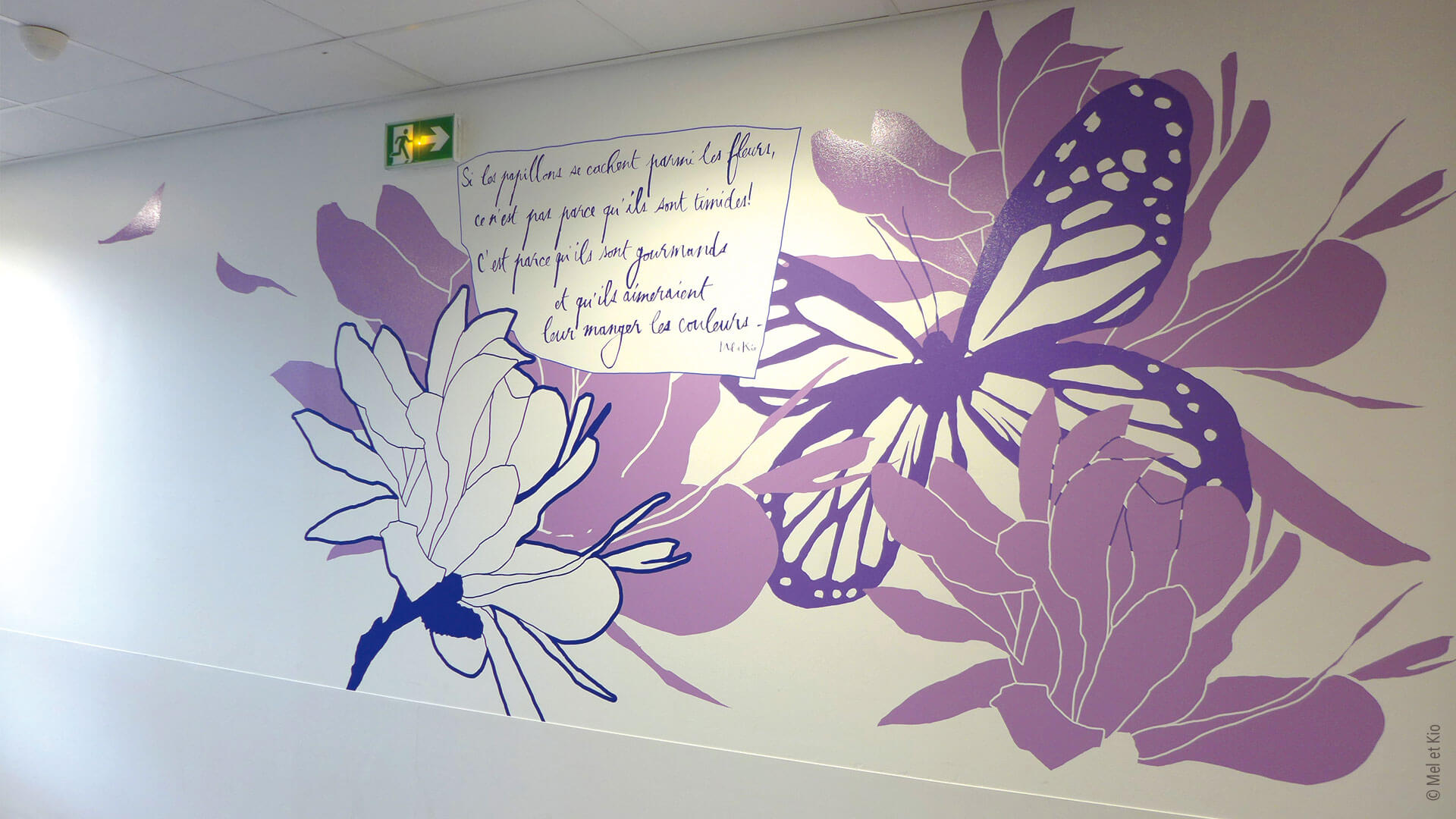 Ces décoration murales de l’hopital sont sur mesure et particulière du style des deux artistes Mel et Kio.