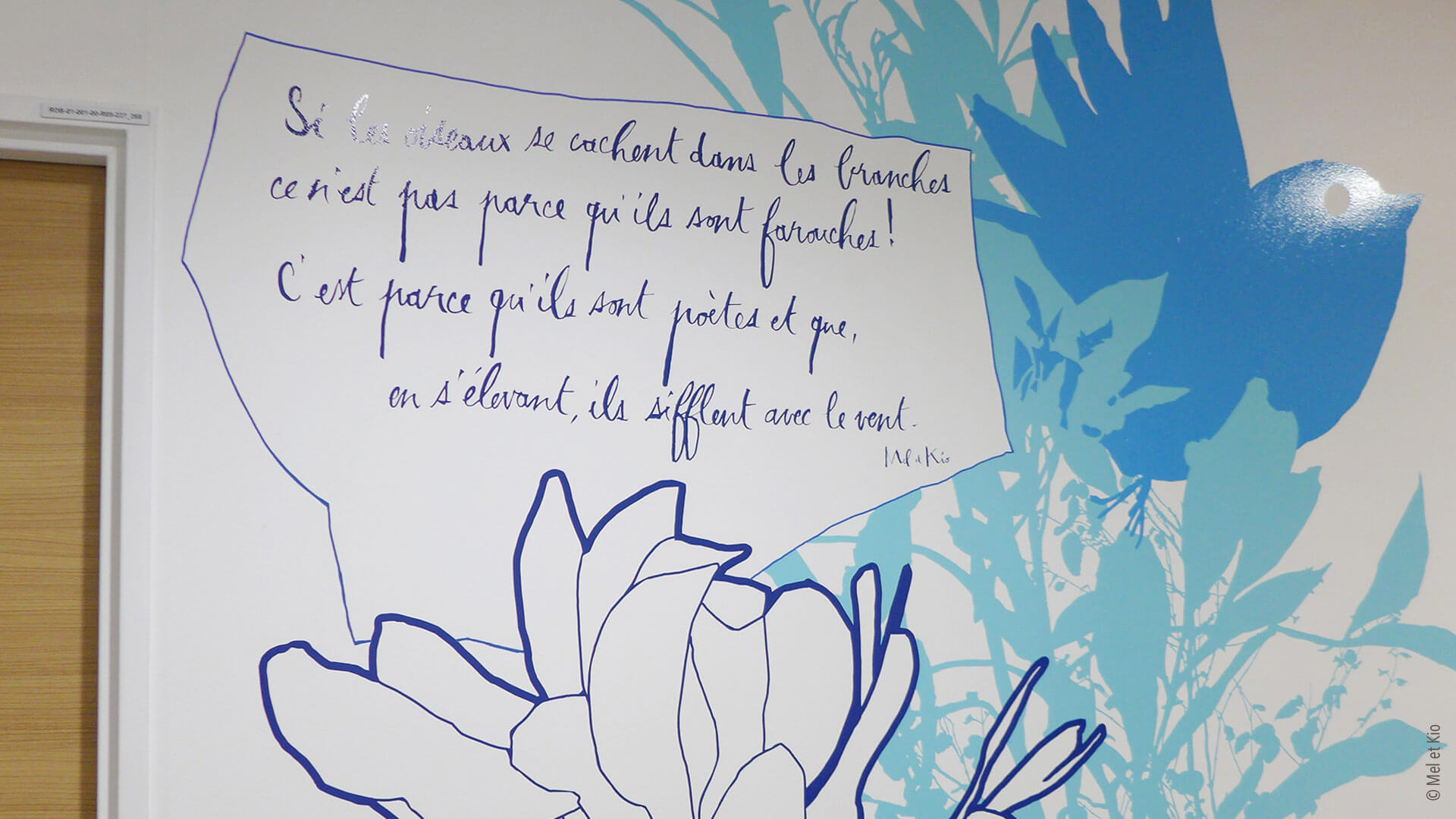 Décorations des murs des 3 étages du Pôle chirurgie pédiatrique. Ces dessins sur murs sont des réalisations sur mesure de fresques originales pour l’hopital pédiatrique.. Mel et Kio à travers leur art mural donnent une identité forte au lieu. ils ré-enchantent ces services souvent perçus comme anxiogènes. Le service de pédiatrie parisien propose une nouvelle lecture et scénographie murale du service hospitalier.