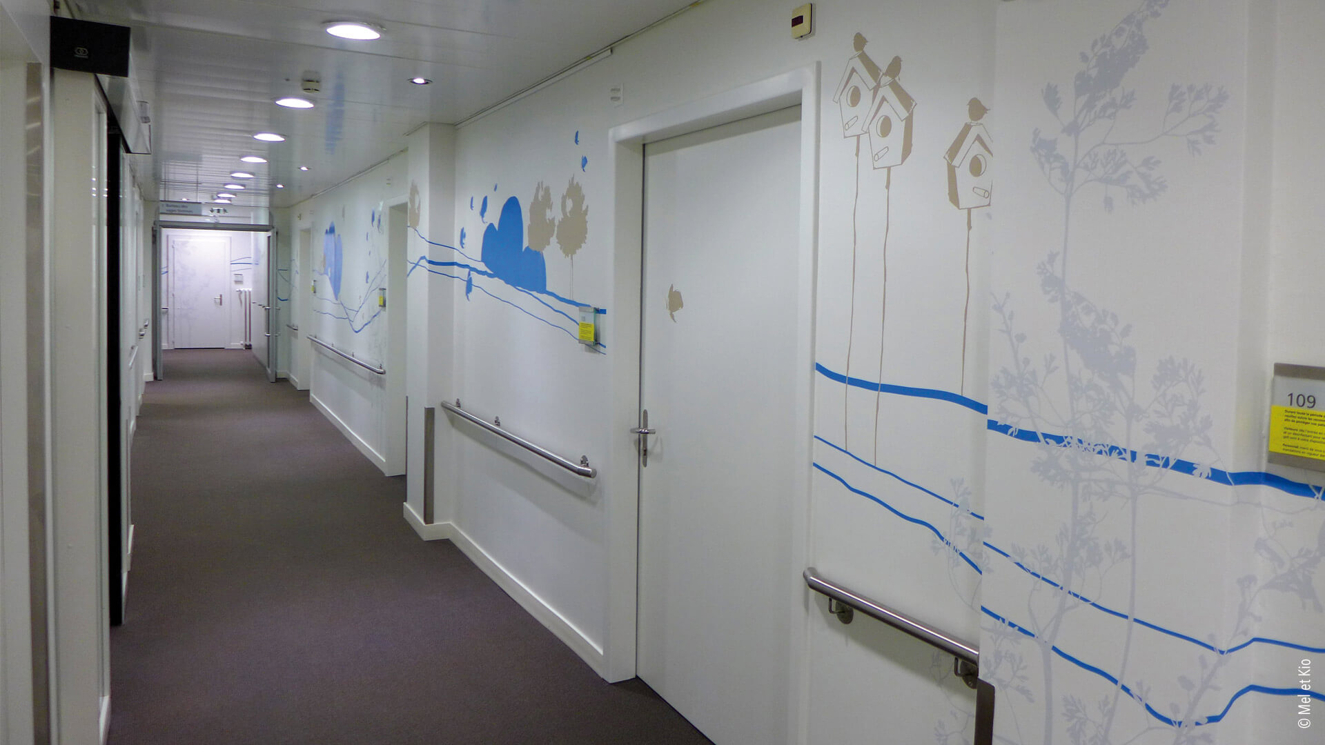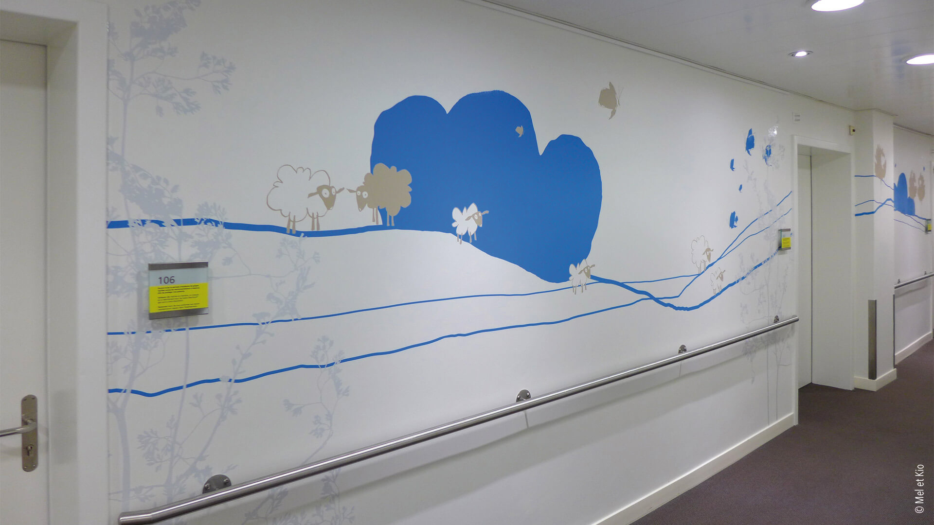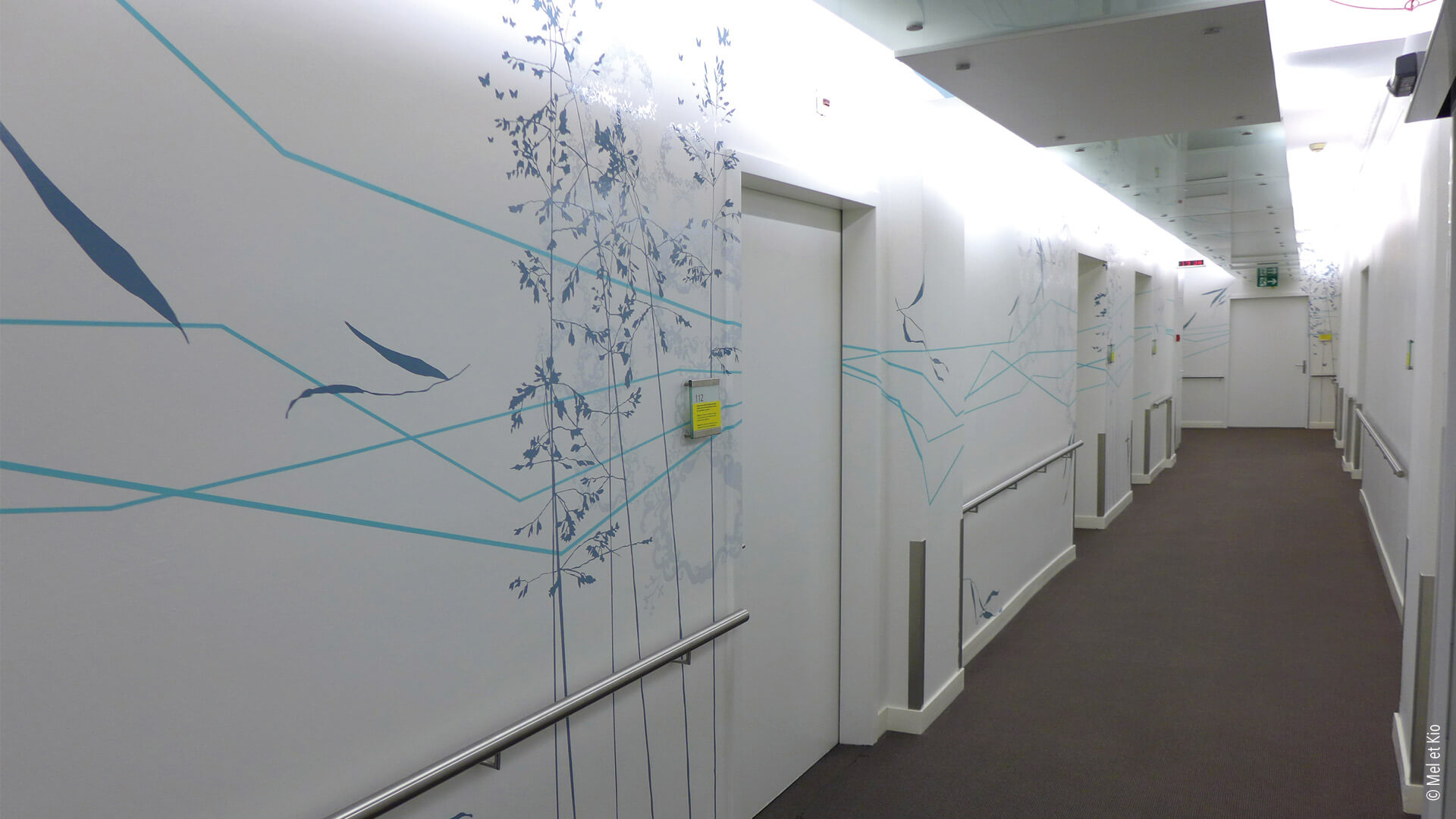 Le design mural de Mel et Kio permet de différencier les deux services de la maternité et de la Chirurgies se trouvant au même niveau de la clinique.