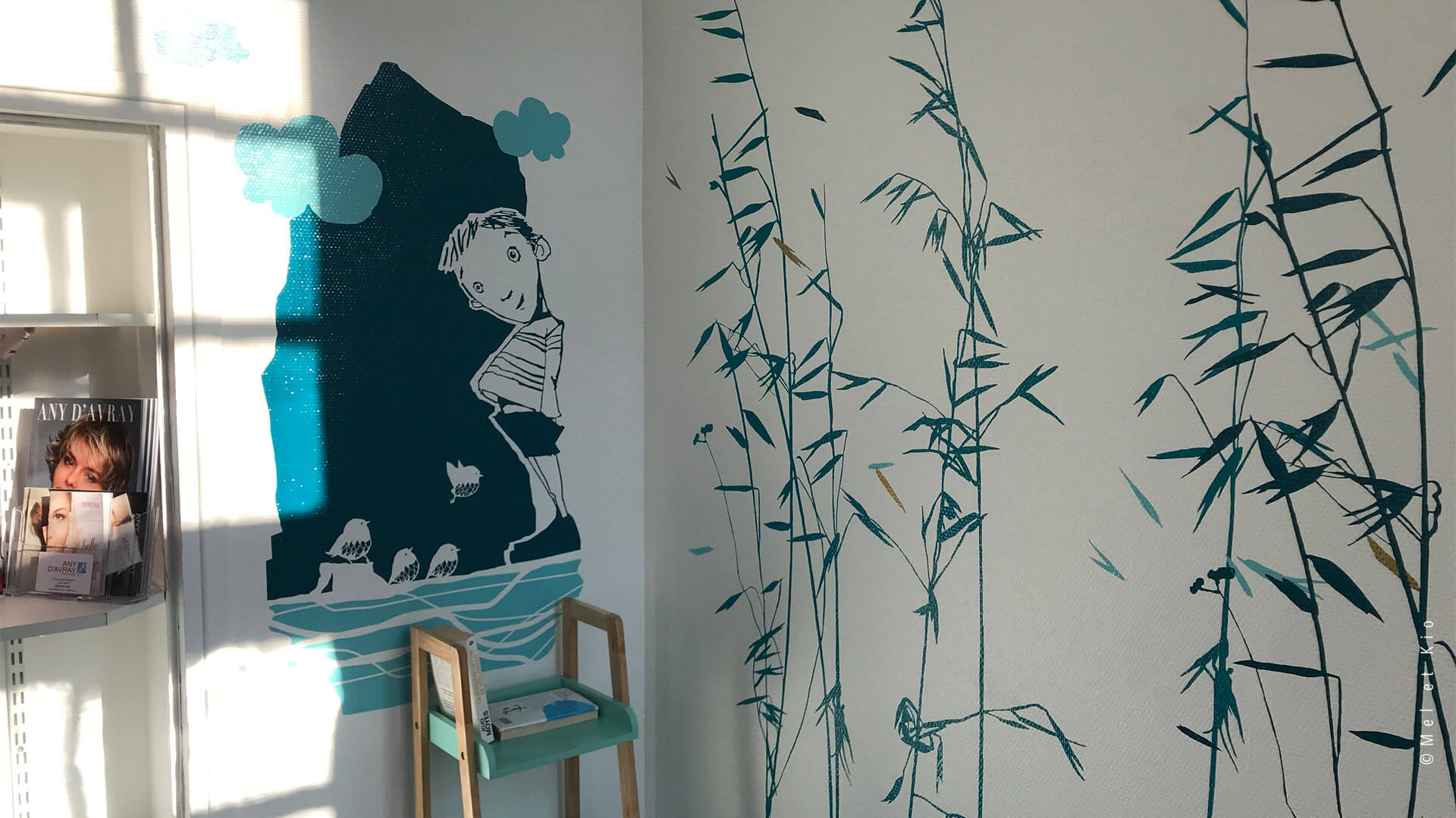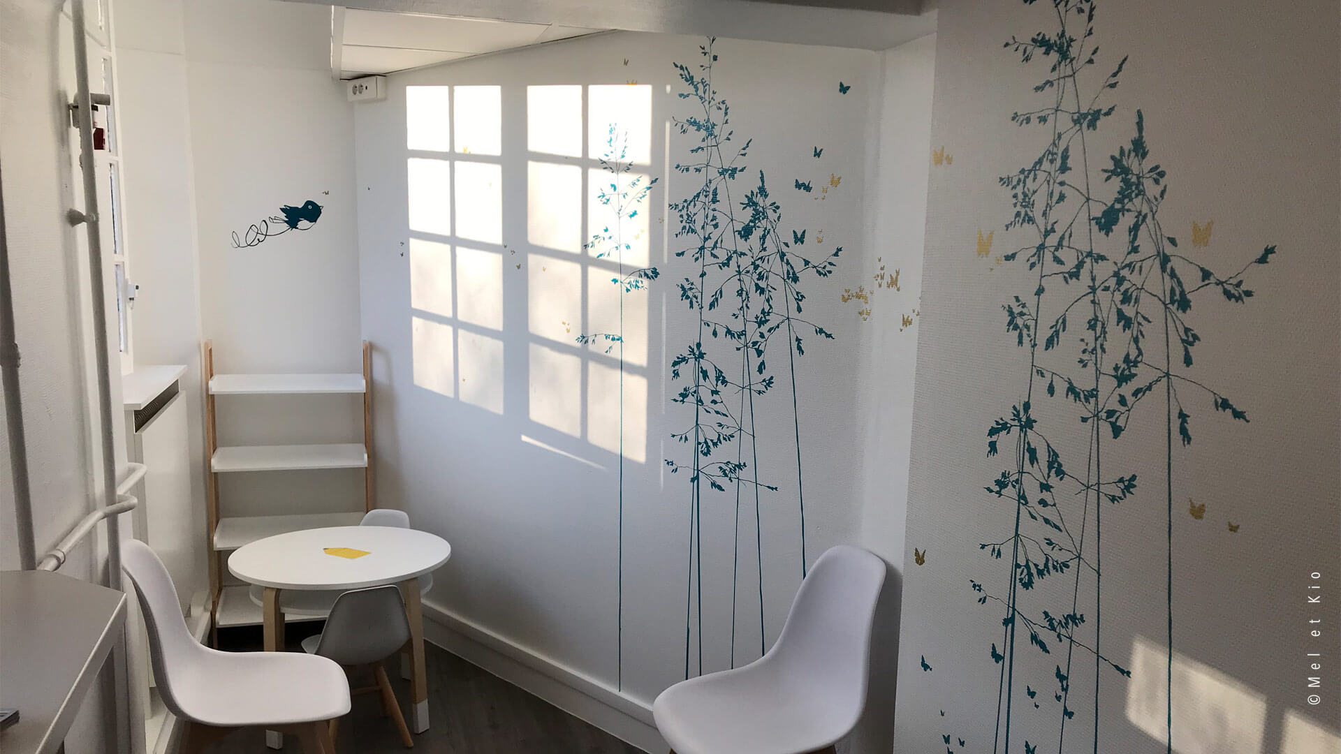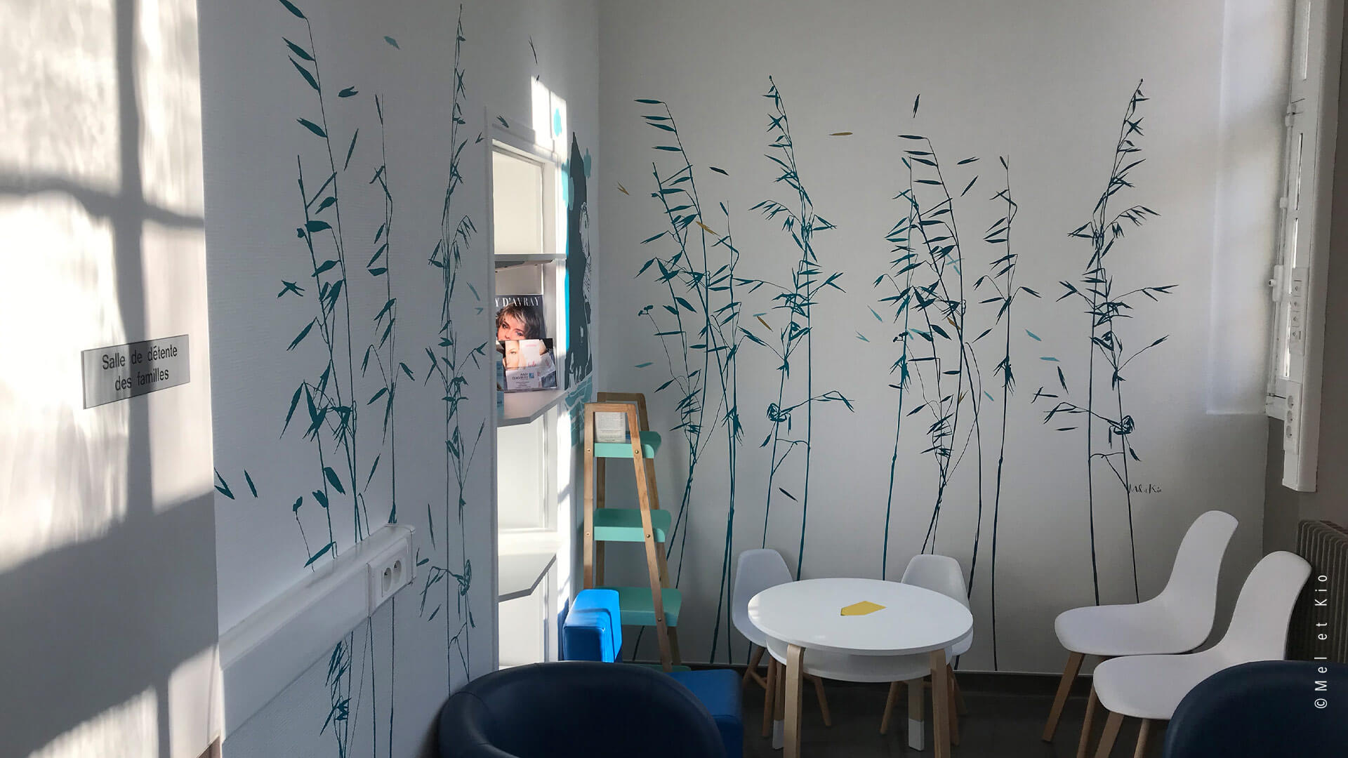 Décorations murales hôpital. Les végétaux dessinés à l’encre de chine sur les murs de la salle d’attente du service donnent au lieu une autre dimension. Le design mural de la collection des ©murmures de Poetic Wall offrent une déco murale originale.