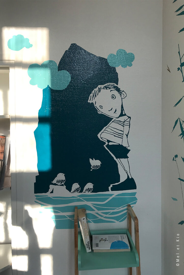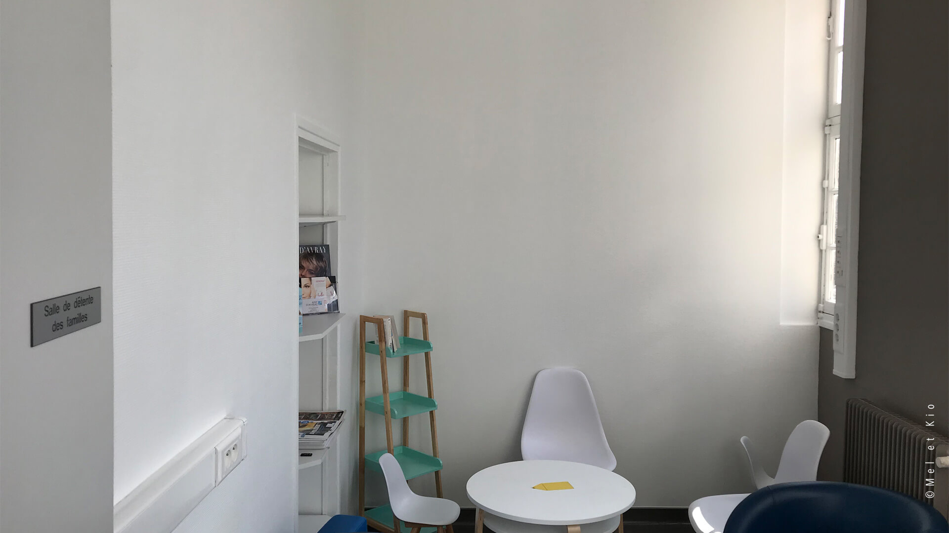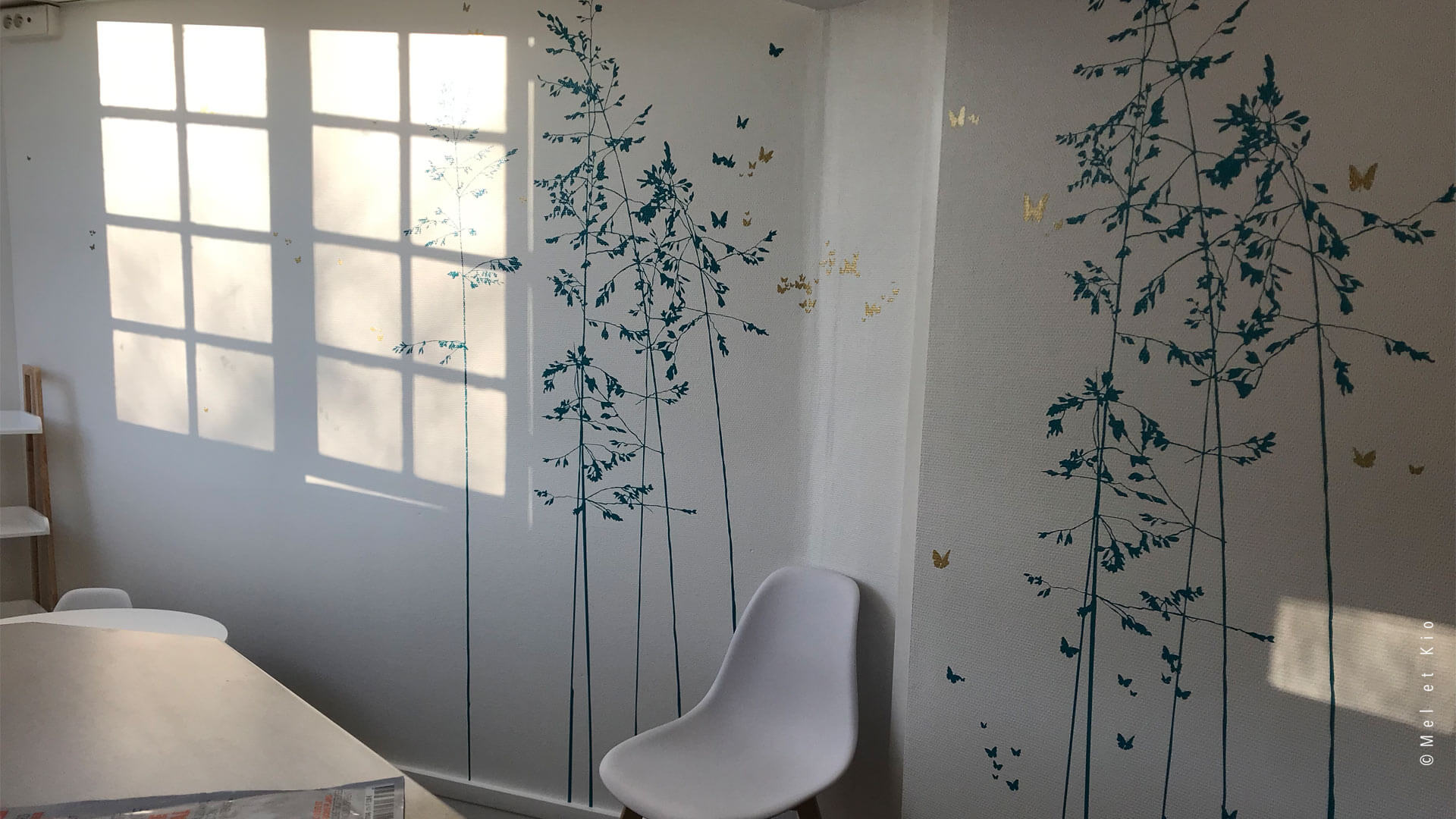 Décorations murales hôpital. Les végétaux dessinés à l’encre de chine sur les murs de la salle d’attente du service donnent au lieu une autre dimension. Le design mural de la collection des ©murmures de Poetic Wall offrent une déco murale originale.