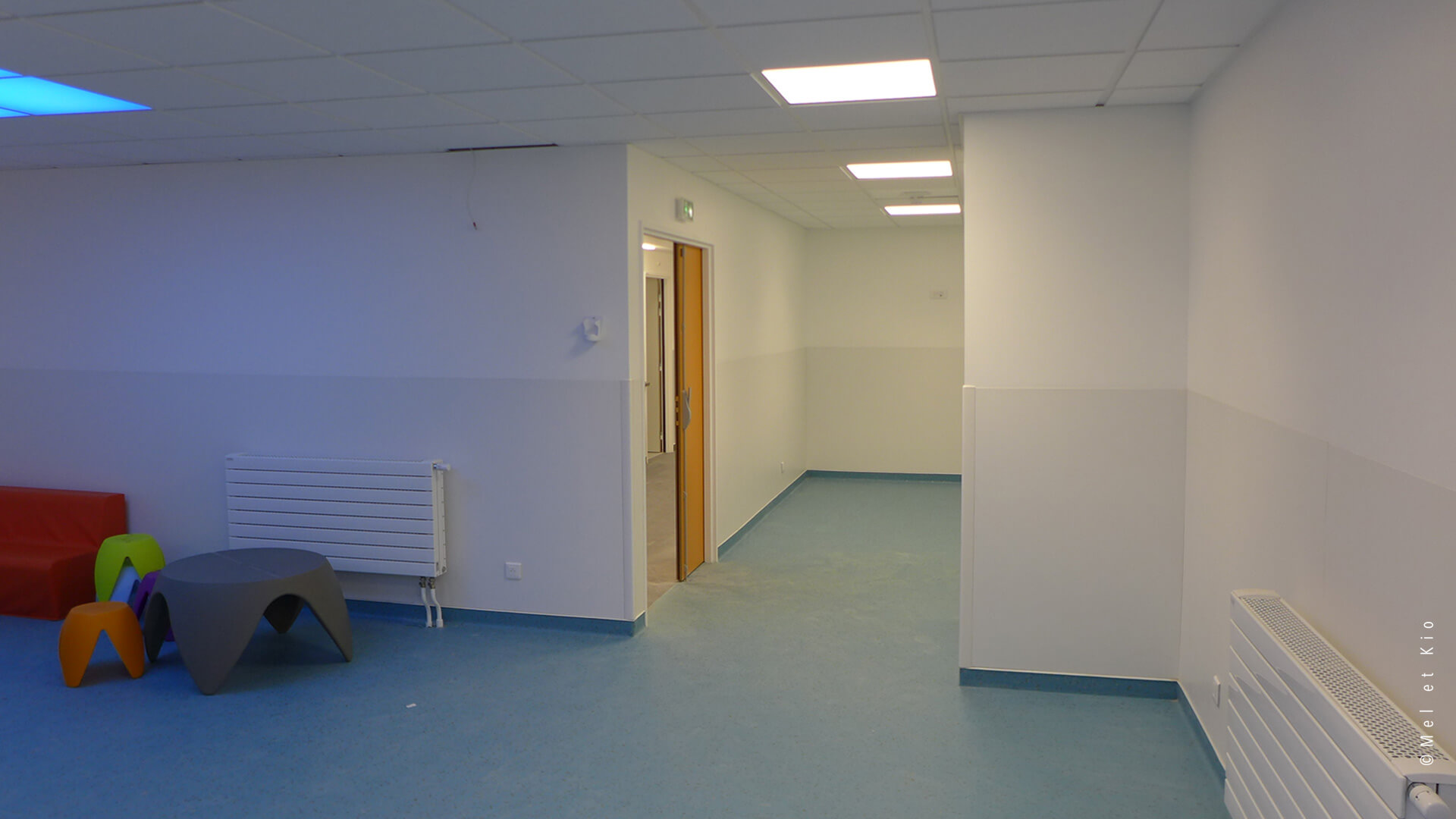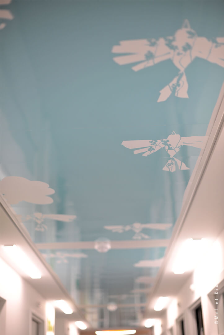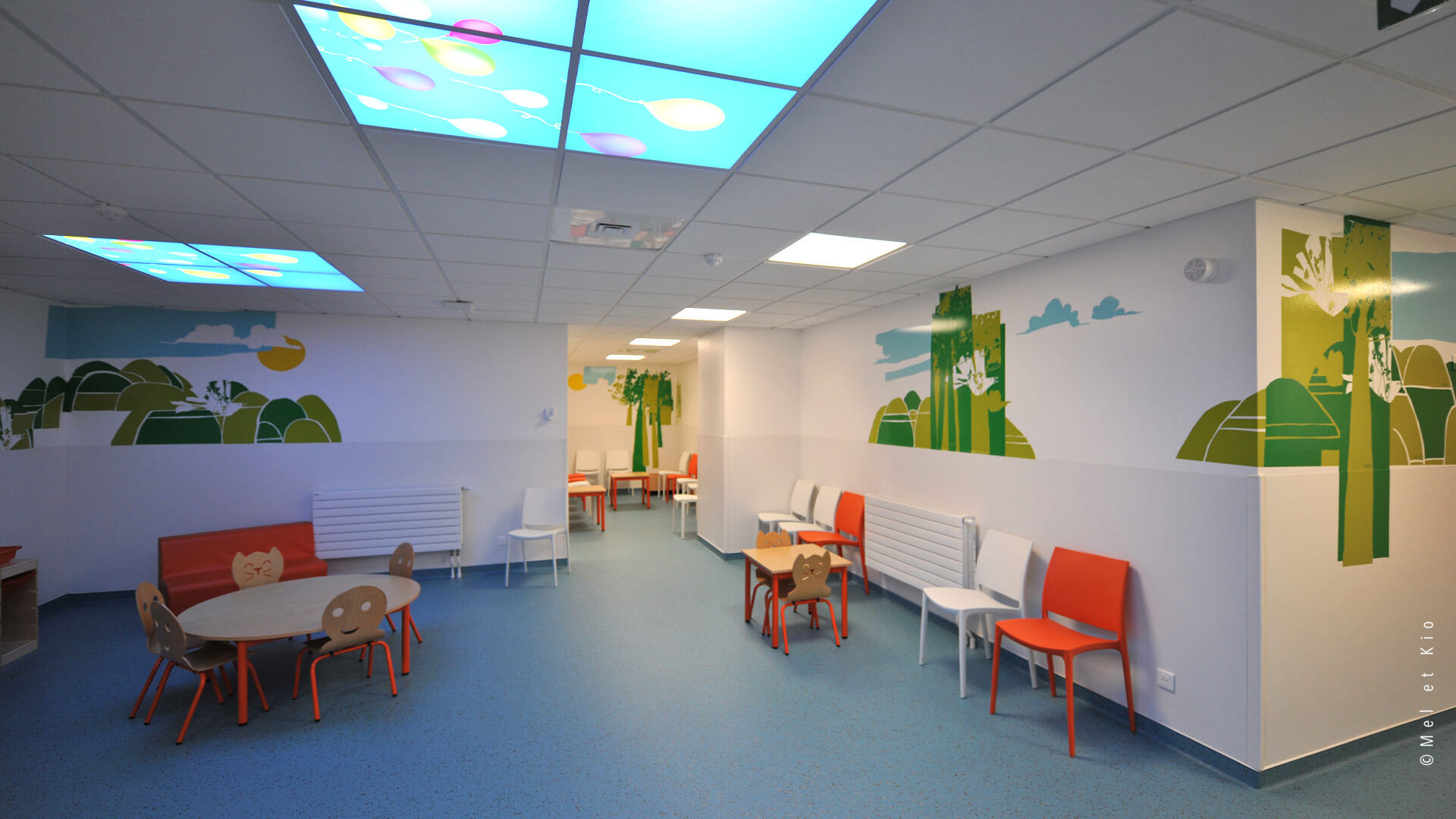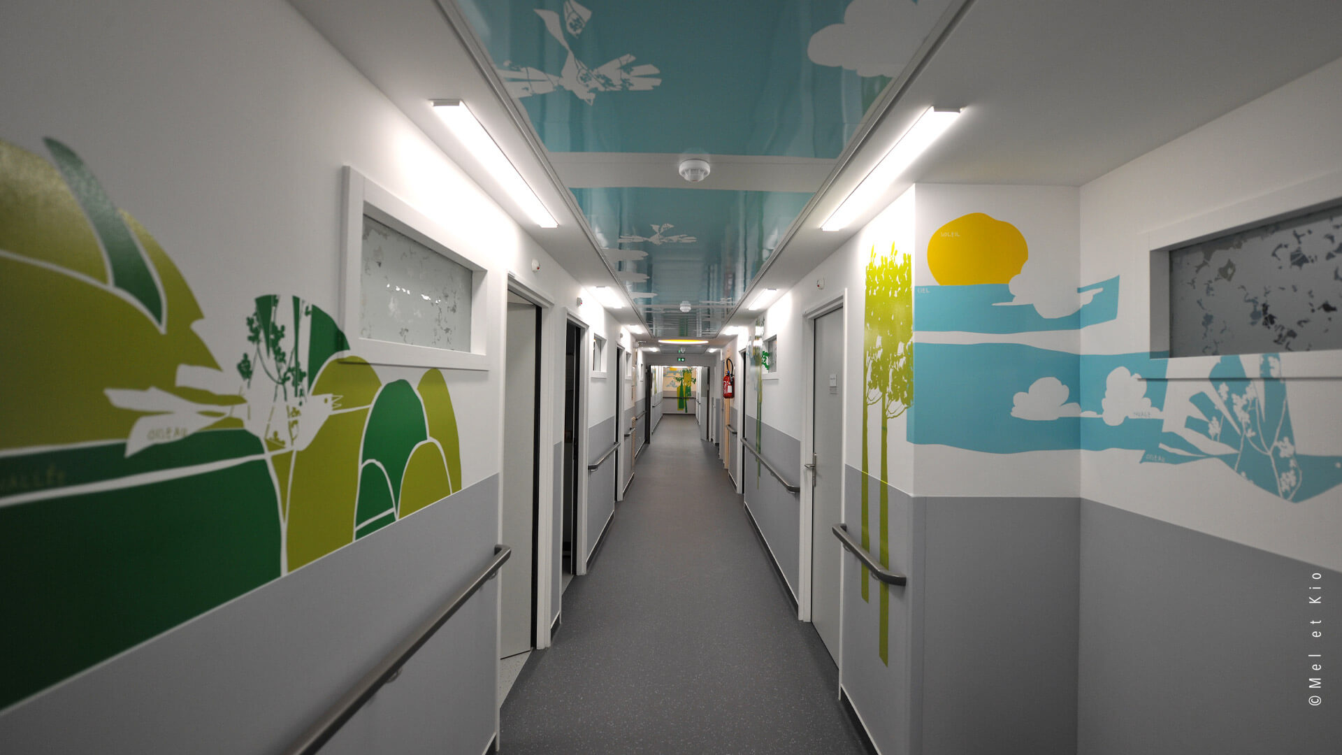 L’hôpital pédiatrique et maternité a fait appel au duo Mel et Kio pour une création murale exclusive et originale. Les dessins sur murs et plafonds subliment les circulations ainsi que les boxes et la grande salle d’attente. Cet art mural est proposé aux patients et qui intègrent la signalétique sur service pédiatrique.