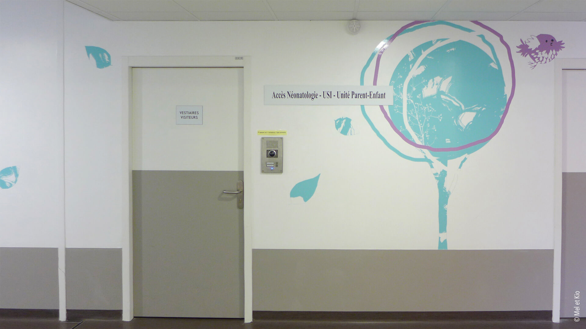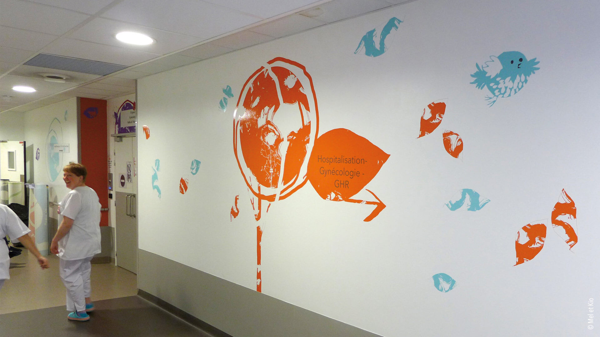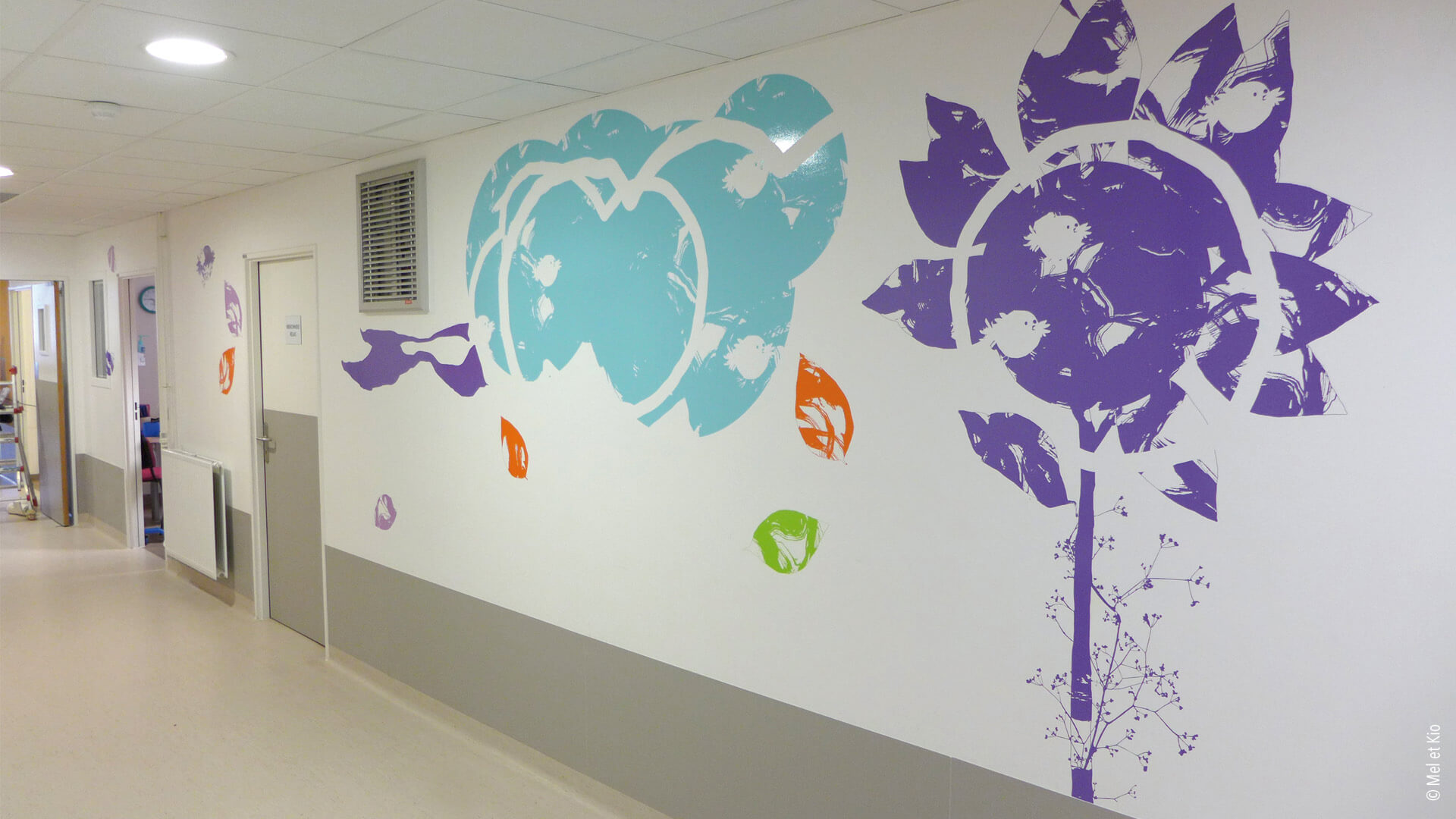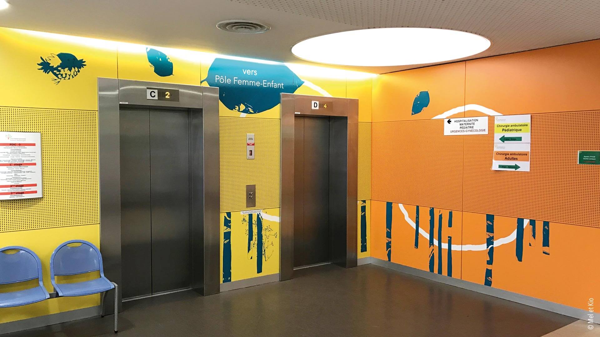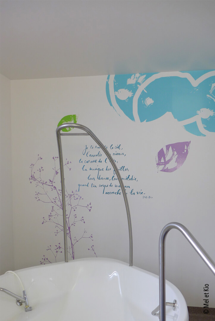 Spécialistes en conseils en identité des lieux, les décorations murales destinées à l’hôpital permet des scénographies originales et poétiques. Accueil, circulations et signalétique originale et textes poétique sur mur maternité signé Mel et Kio