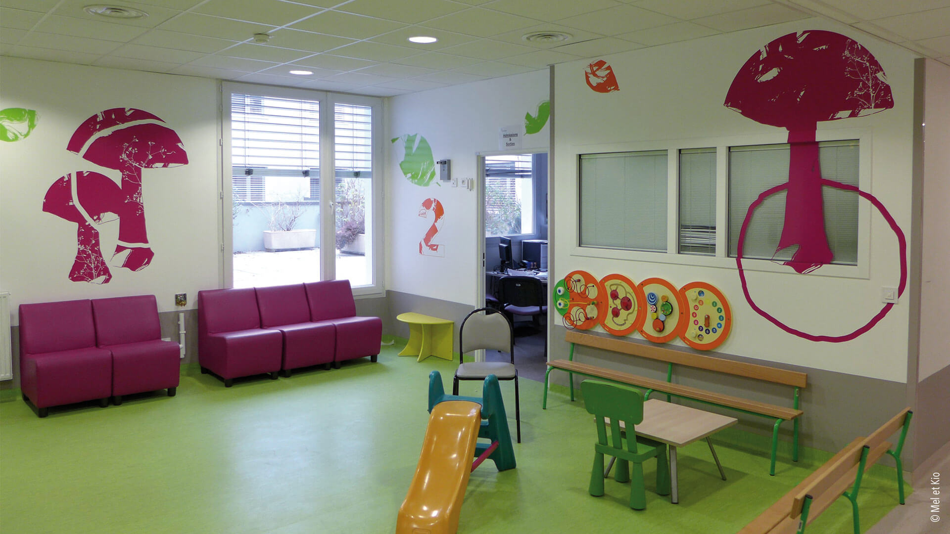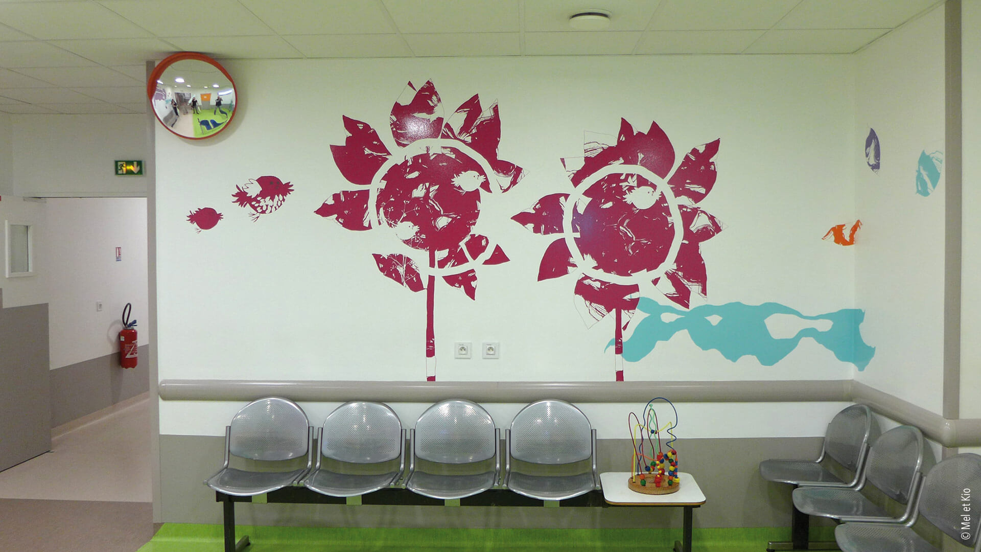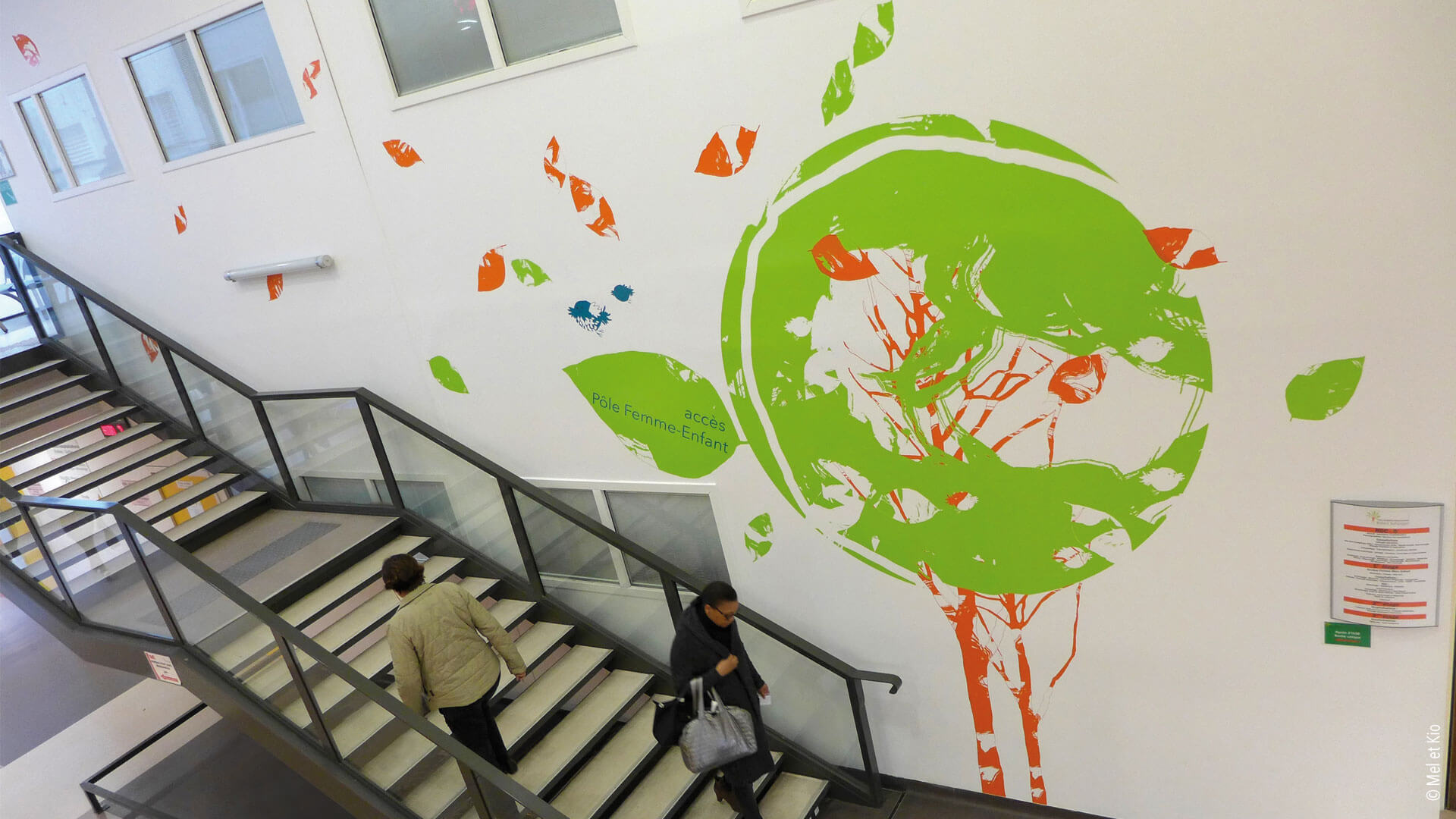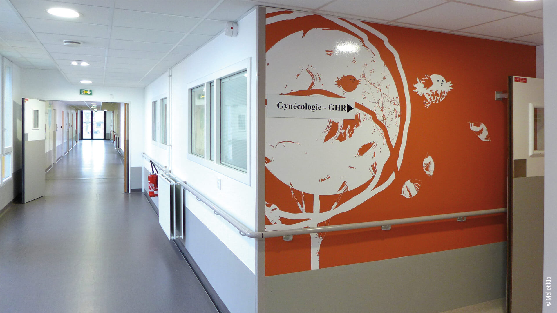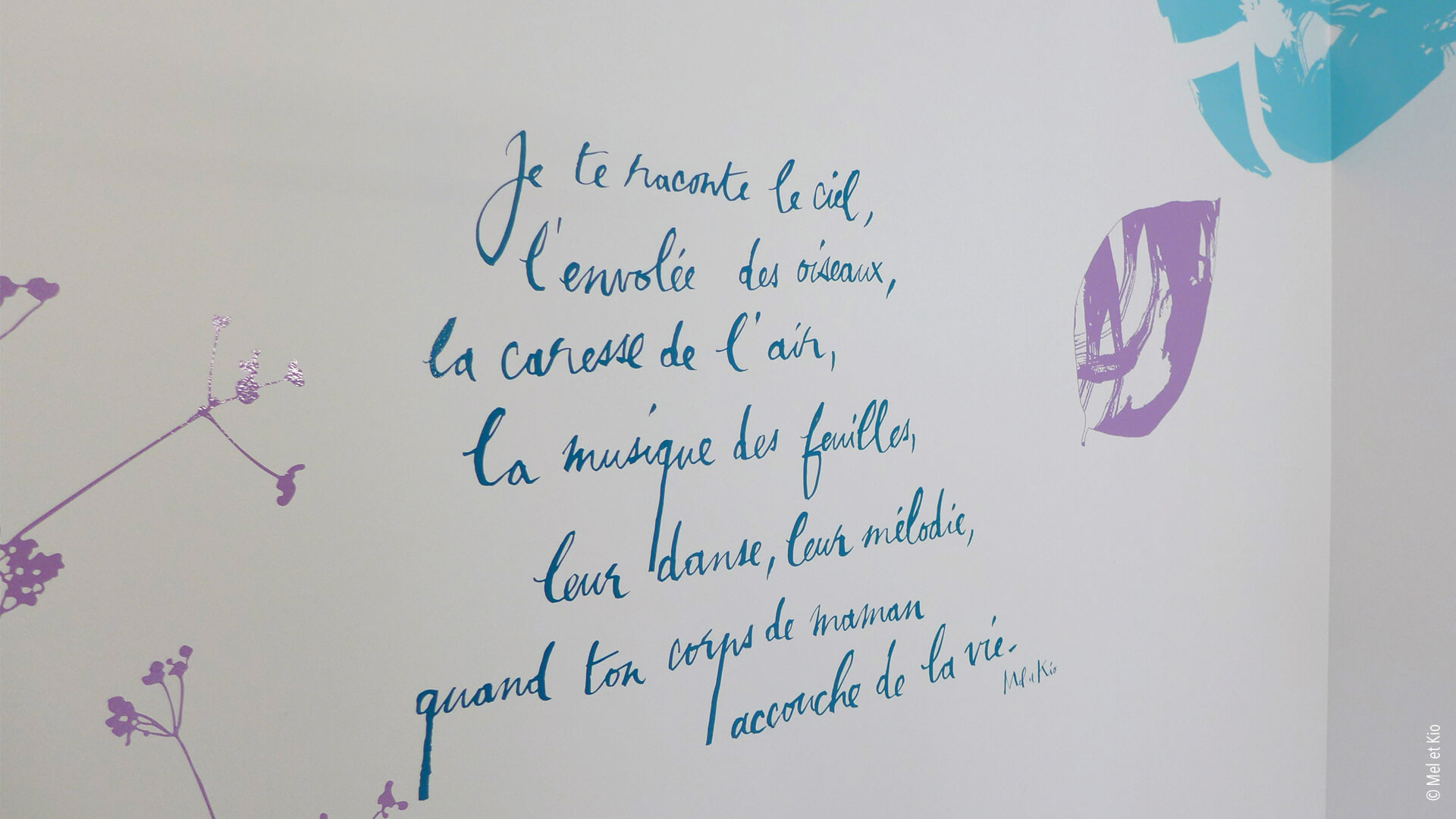 Spécialistes en conseils en identité des lieux, les décorations murales destinées à l’hôpital permet des scénographies originales et poétiques. Accueil, circulations et signalétique originale et textes poétique sur mur maternité signé Mel et Kio