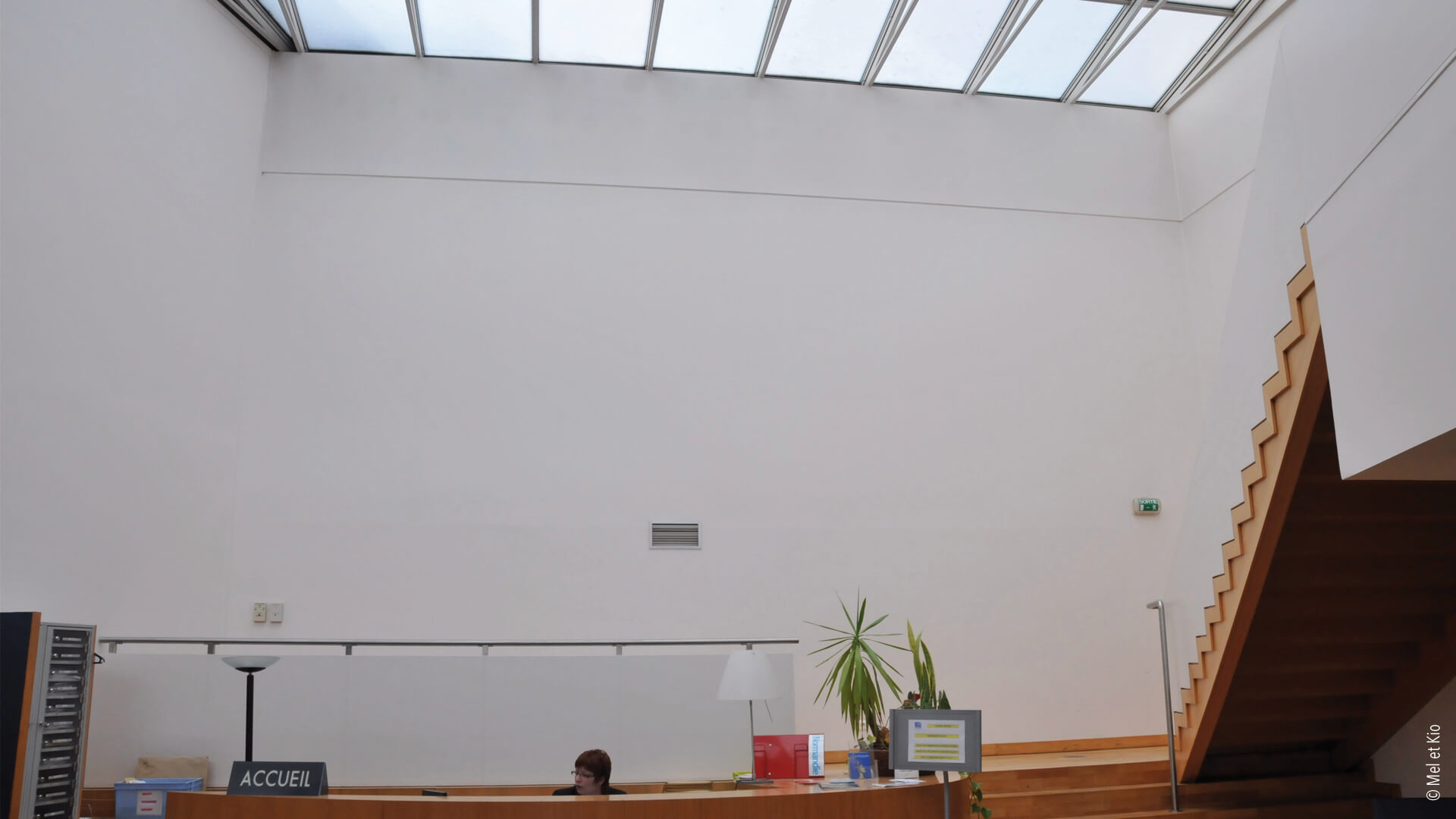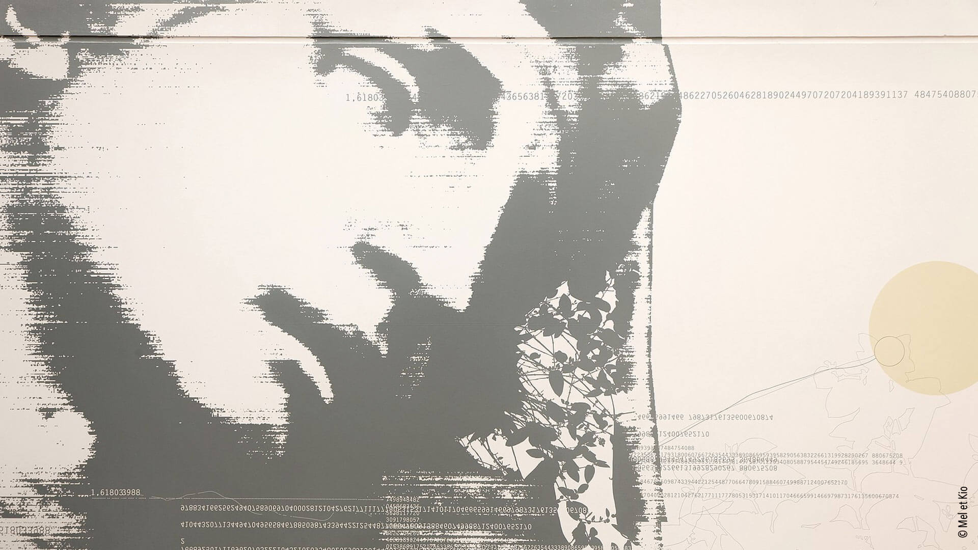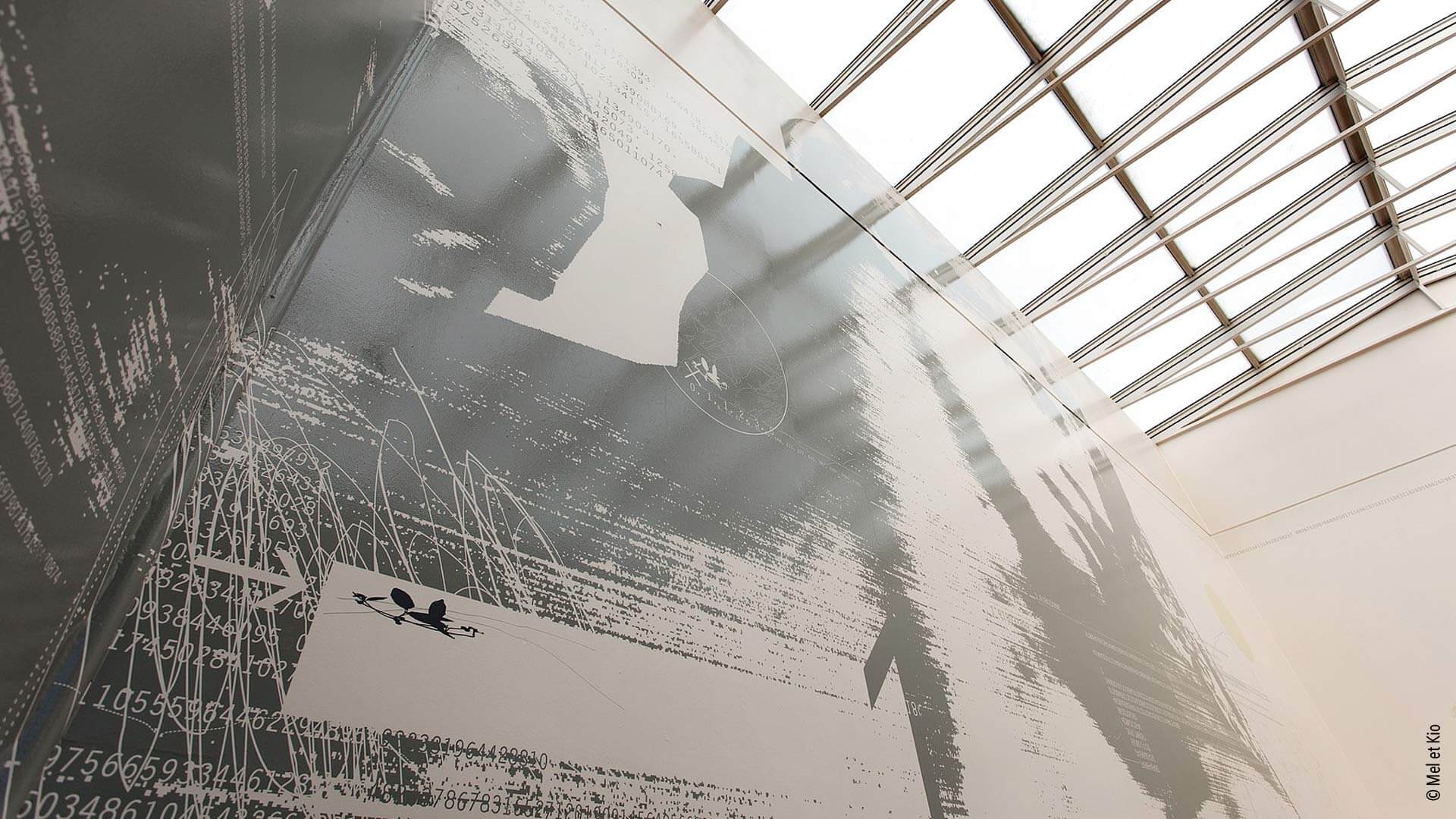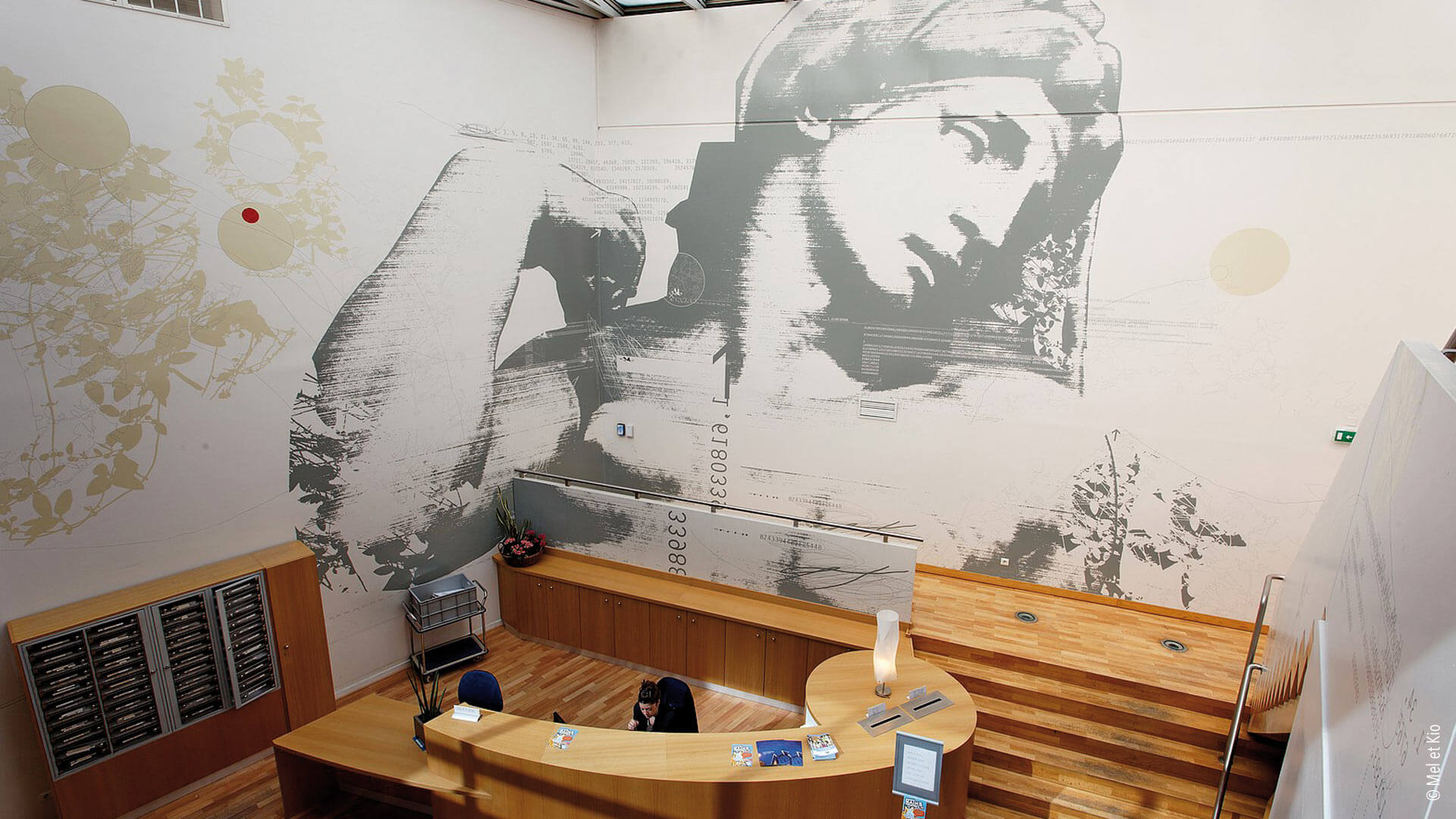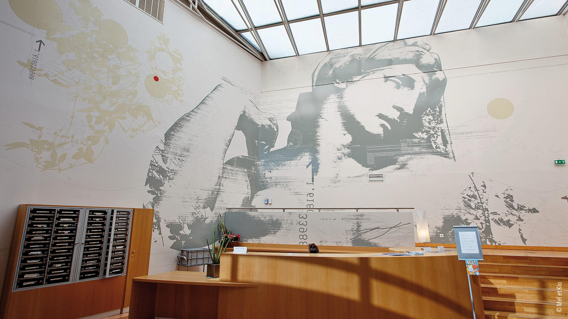 Art mural monumental sur mesure dans le hall d’accueil de la clinique de l’Europe à Rouen, L’art mural des deux artistes Mel et Kio spécialistes de conseil en identité des lieux ajoute à la monumentalité de l’espace conçu par Andrée Putman. La fresque sur mesure à l’accueil de la clinique privée s’inspire librement de l’oeuvre de Michel-Ange.
