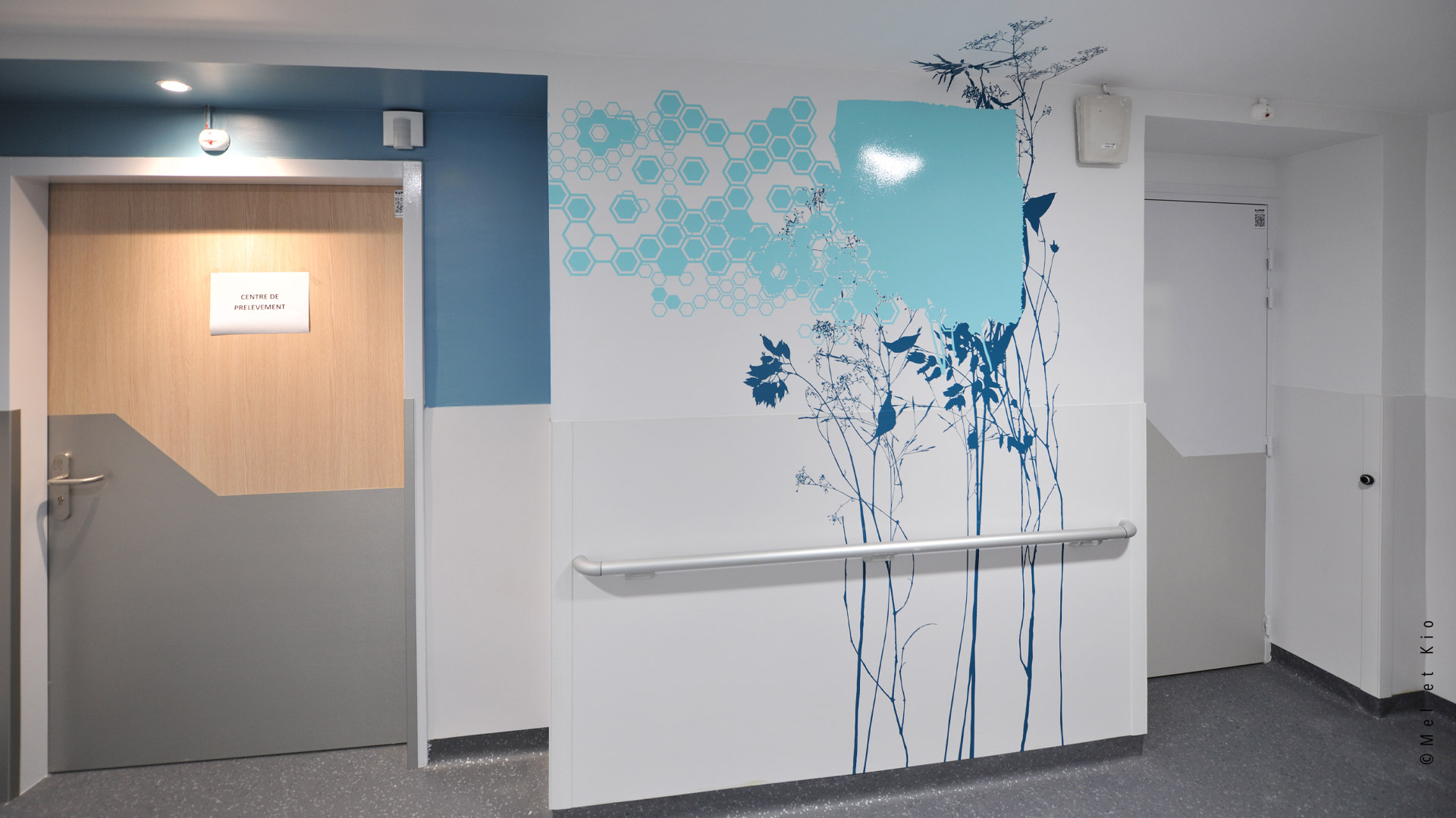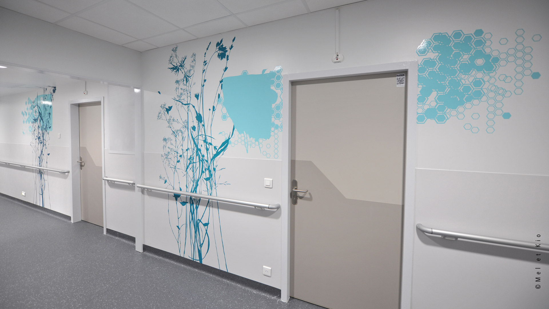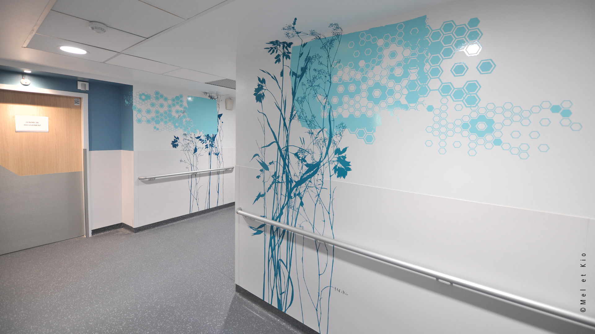 Fresques murales d’intérieure originales sur-mesure au design de végétaux et feuillages sur les murs du service d’Endocrinologie de l’Hôpital Saint-Antoine signées Mel et Kio. Réalisation faite main dans les ateliers Le Pré d’Eau.