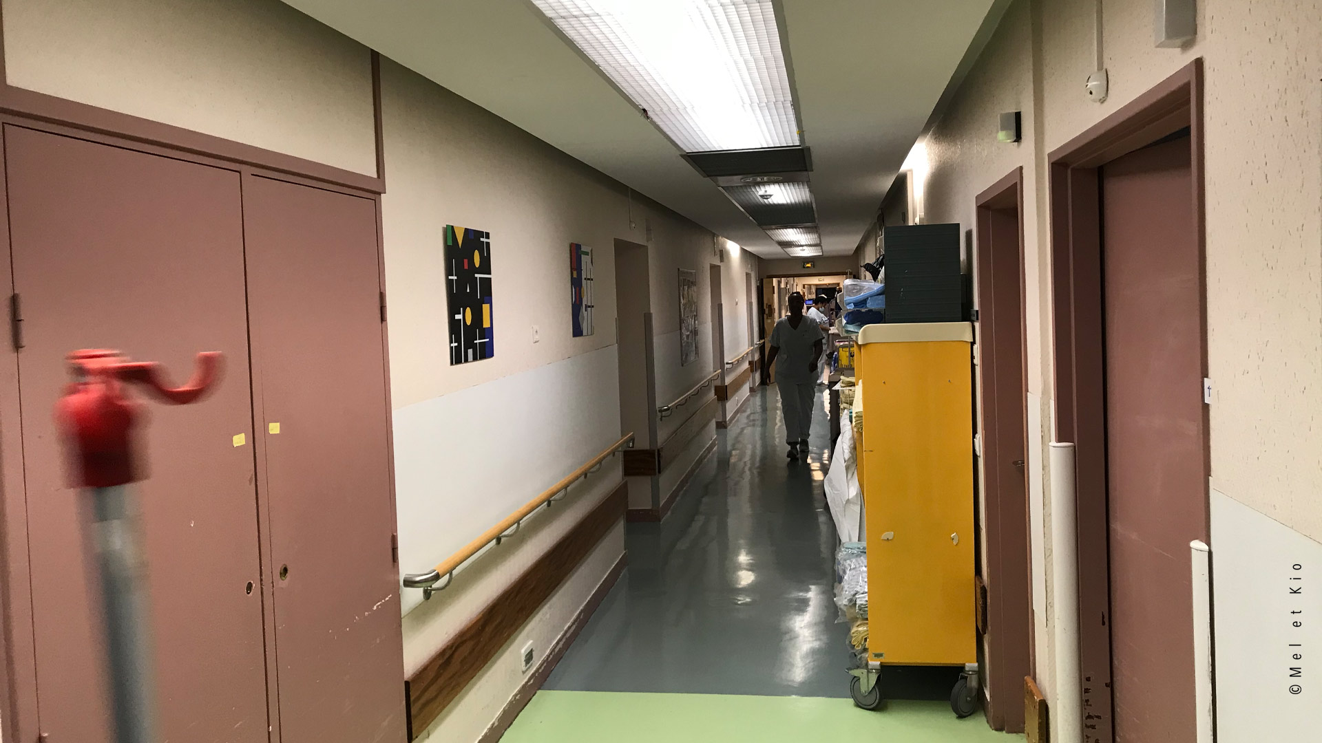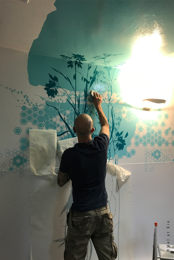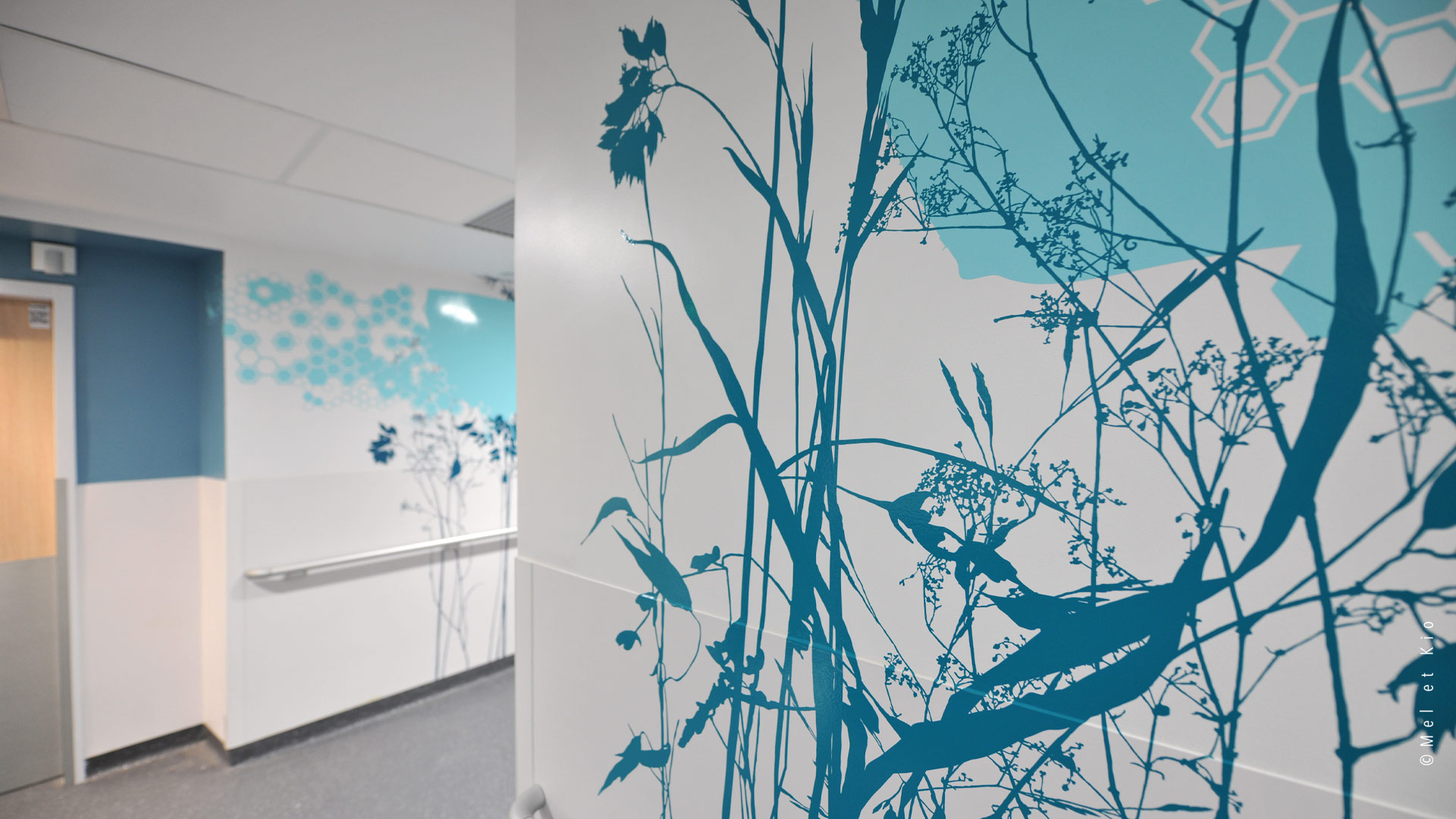 Fresques murales d’intérieure originales sur-mesure au design de végétaux et feuillages sur les murs du service d’Endocrinologie de l’Hôpital Saint-Antoine signées Mel et Kio. Réalisation faite main dans les ateliers Le Pré d’Eau.