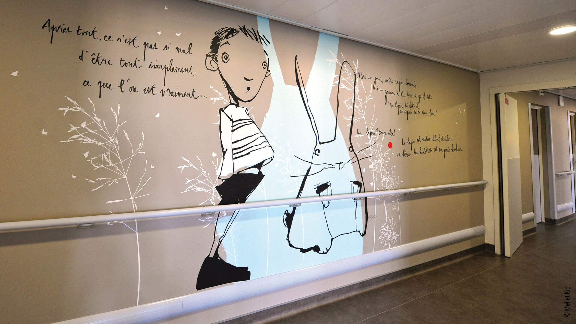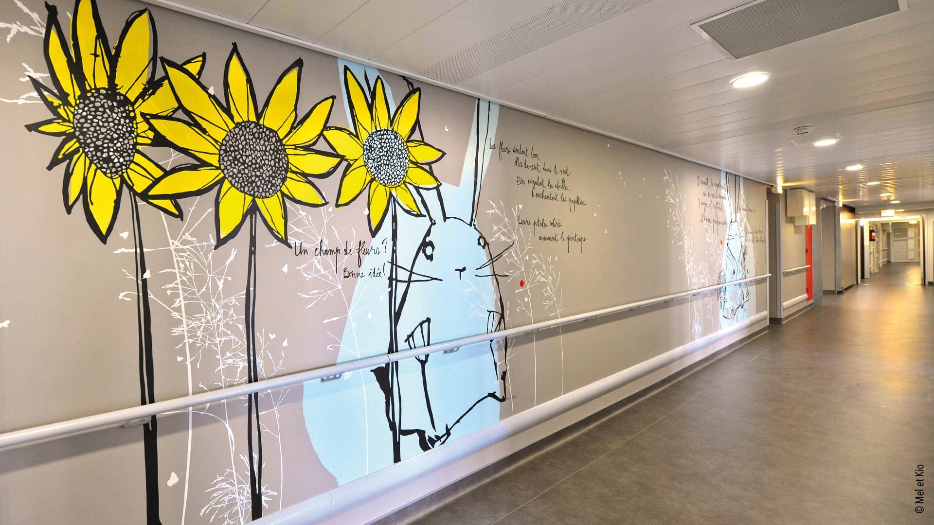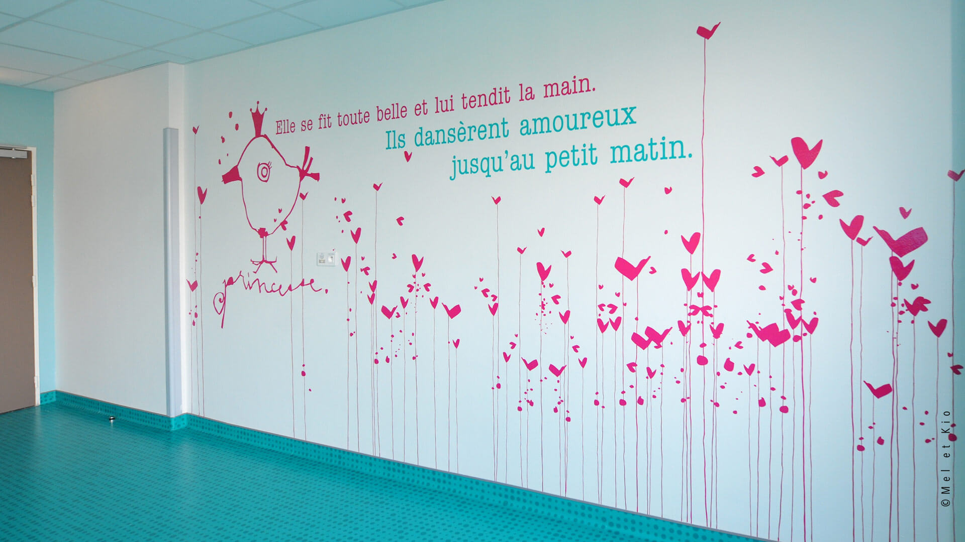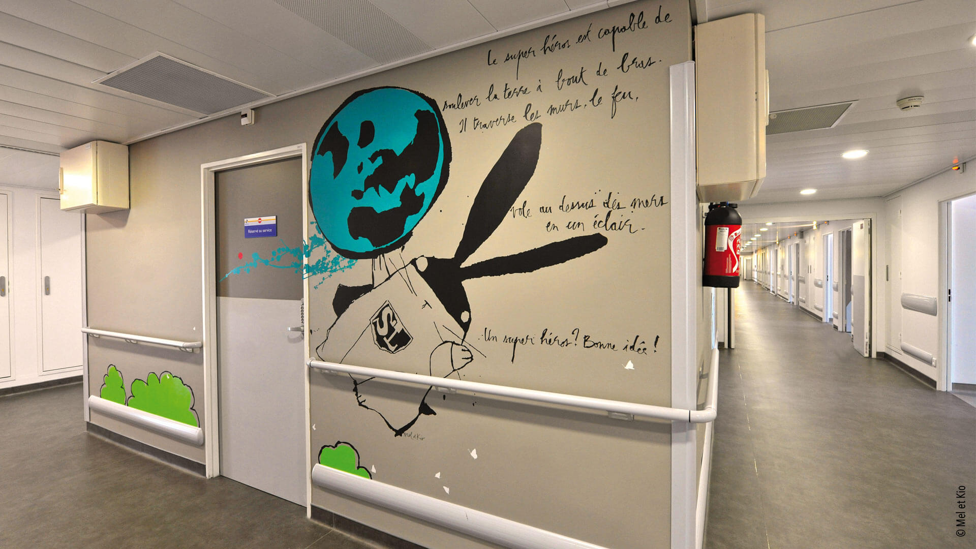 Une histoire originale en illustrations murales poétiques conçue et réalisée par le duo d’artistes Mel et Kio pour l’Hôpital de la Timone – Service onco-hématologie pédiatrique. Le design mural particulier raconte une histoire identitaire dans tout le service hospitalier. Des fresques issues de l’art mual signé des deux artistes de wall art qui proposent des décorations murales specialisées et sur mesure pour les hôpitaux.