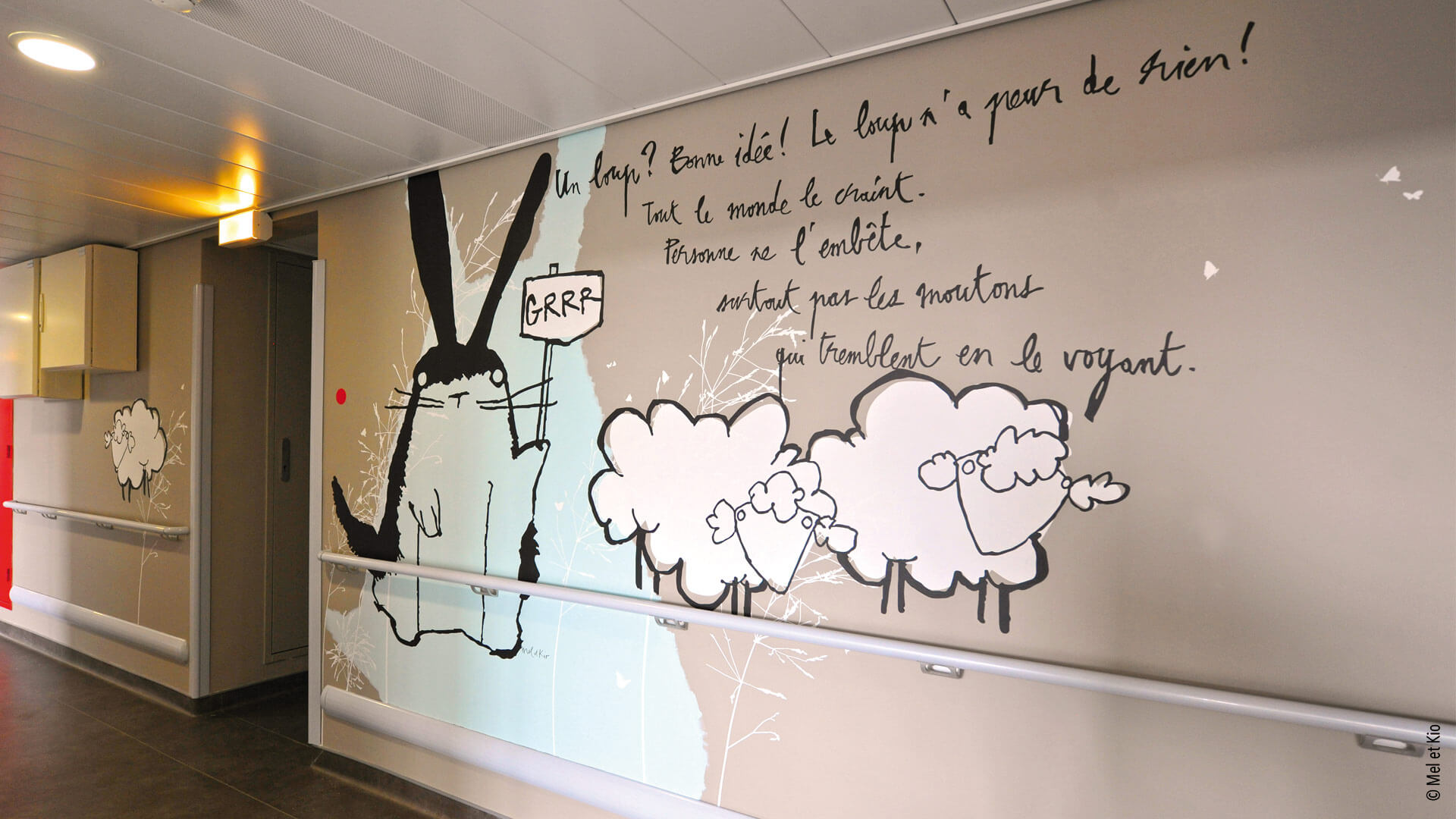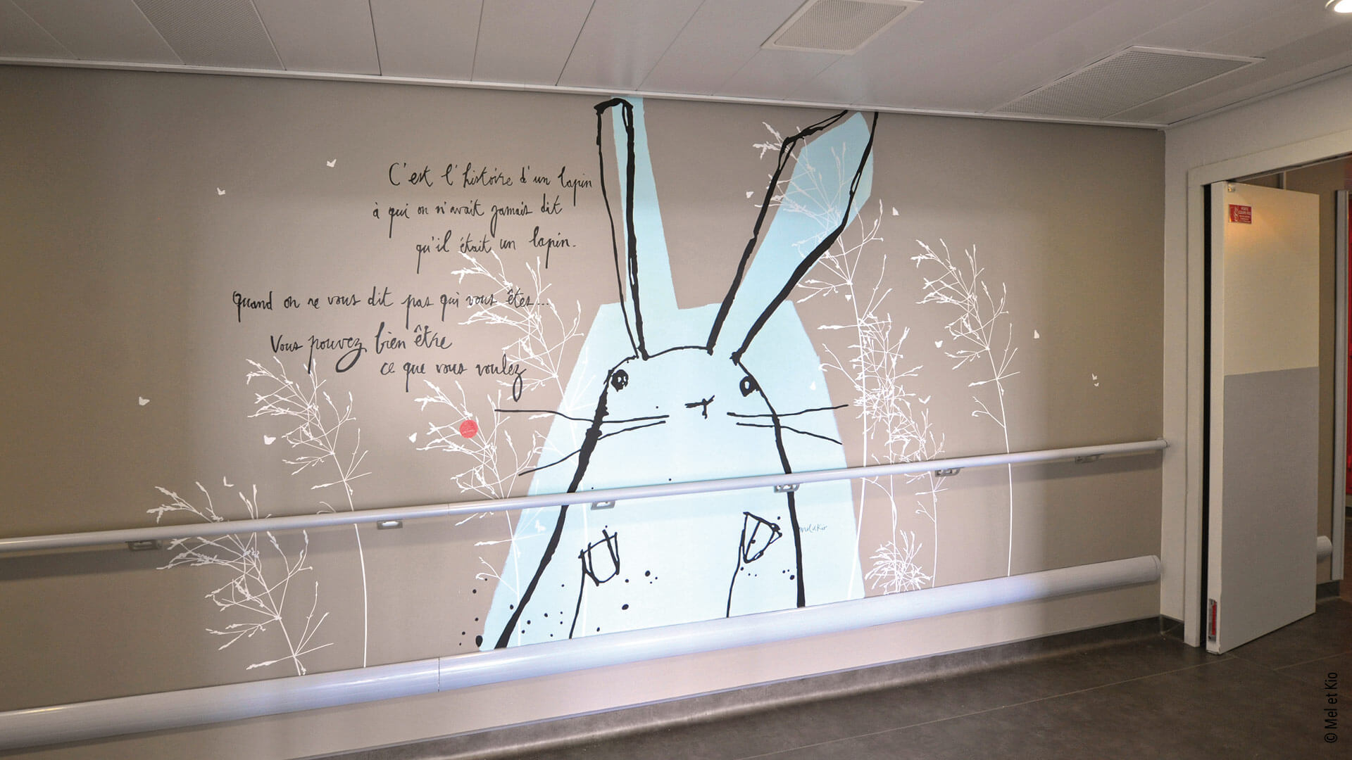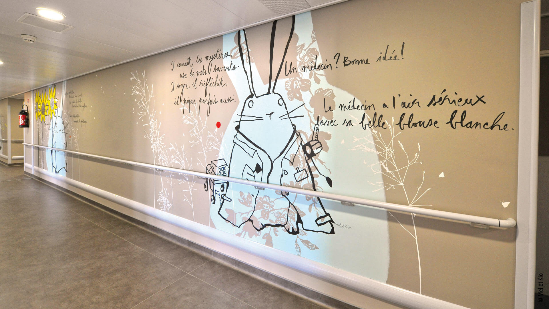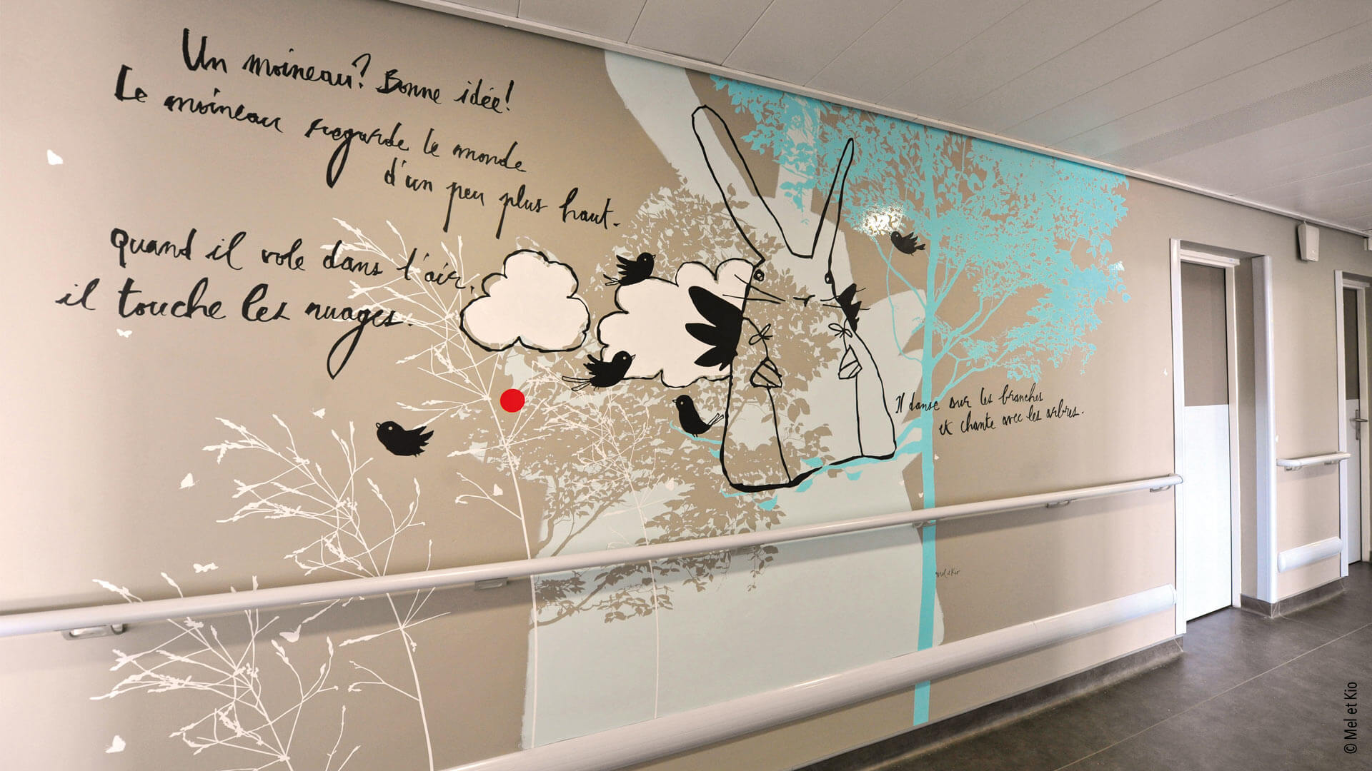 Une histoire originale en illustrations murales poétiques conçue et réalisée par le duo d’artistes Mel et Kio pour l’Hôpital de la Timone – Service onco-hématologie pédiatrique. Le design mural particulier raconte une histoire identitaire dans tout le service hospitalier. Des fresques issues de l’art mual signé des deux artistes de wall art qui proposent des décorations murales specialisées et sur mesure pour les hôpitaux.