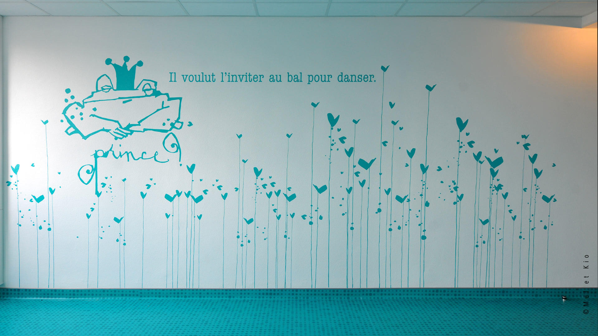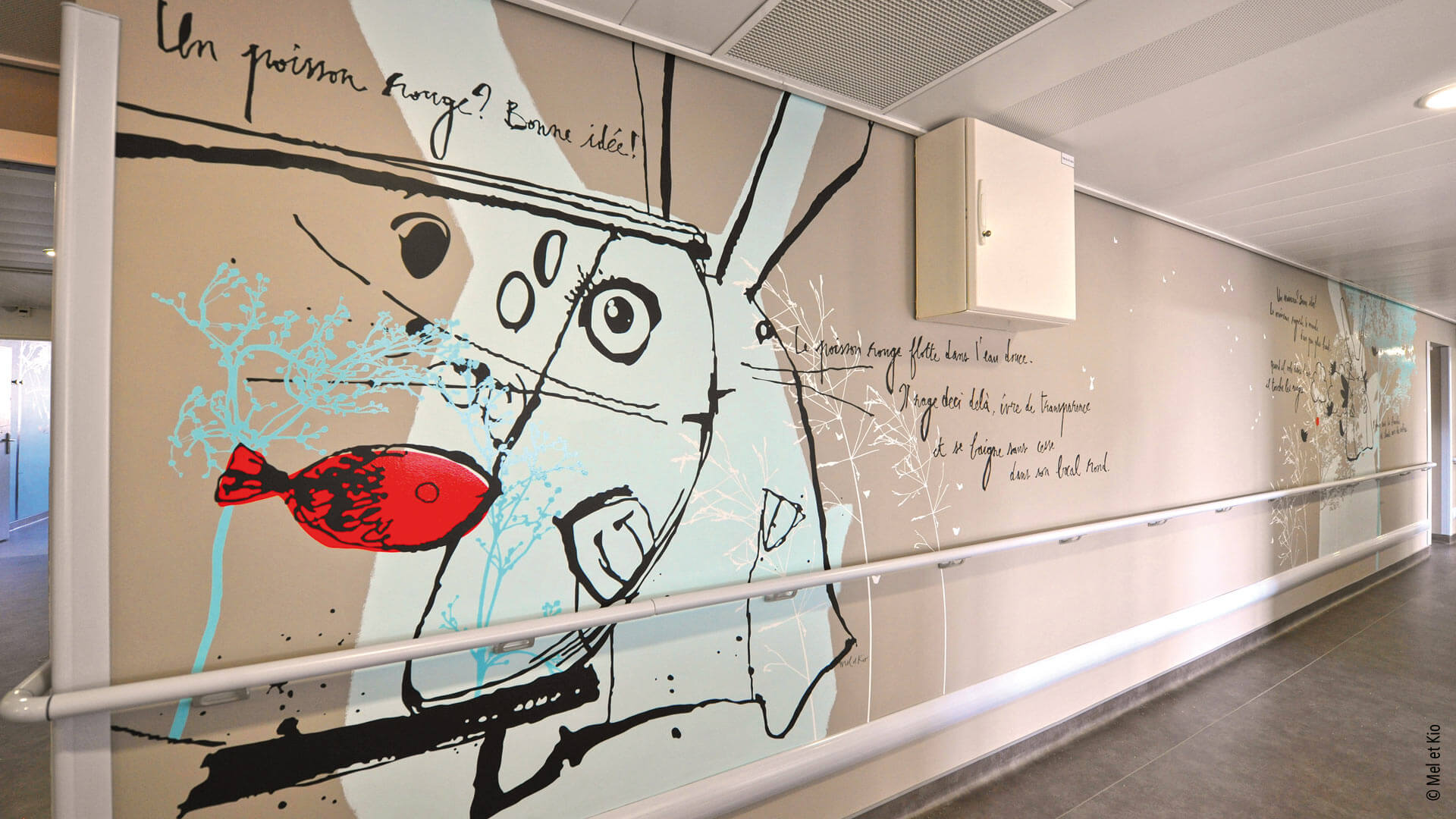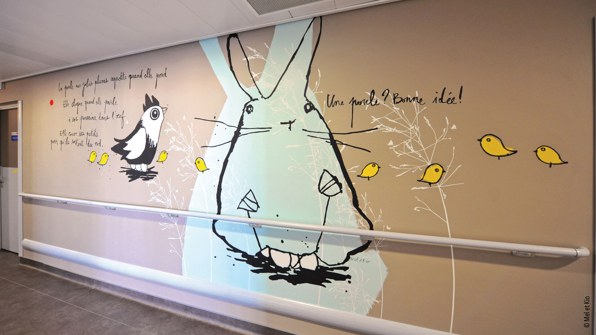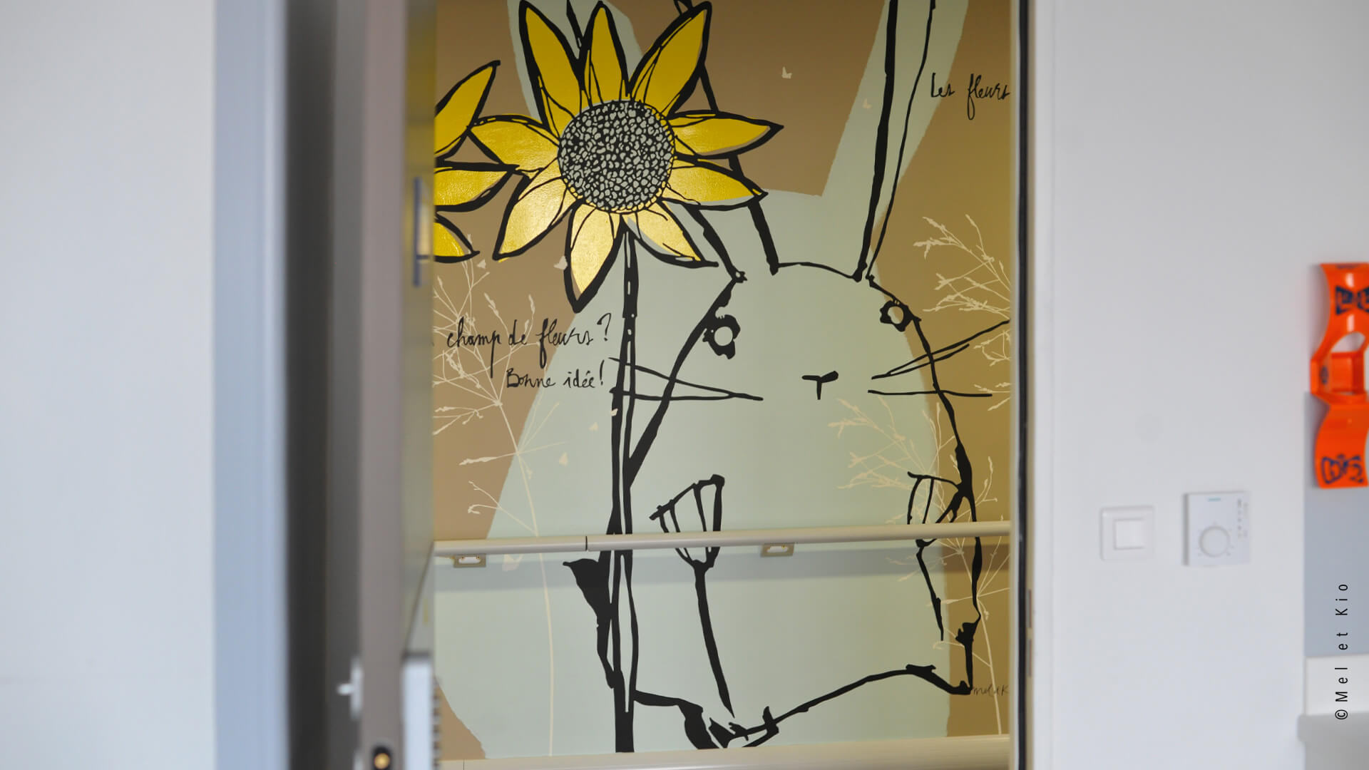 Une histoire originale en illustrations murales poétiques conçue et réalisée par le duo d’artistes Mel et Kio pour l’Hôpital de la Timone – Service onco-hématologie pédiatrique. Le design mural particulier raconte une histoire identitaire dans tout le service hospitalier. Des fresques issues de l’art mual signé des deux artistes de wall art qui proposent des décorations murales specialisées et sur mesure pour les hôpitaux.