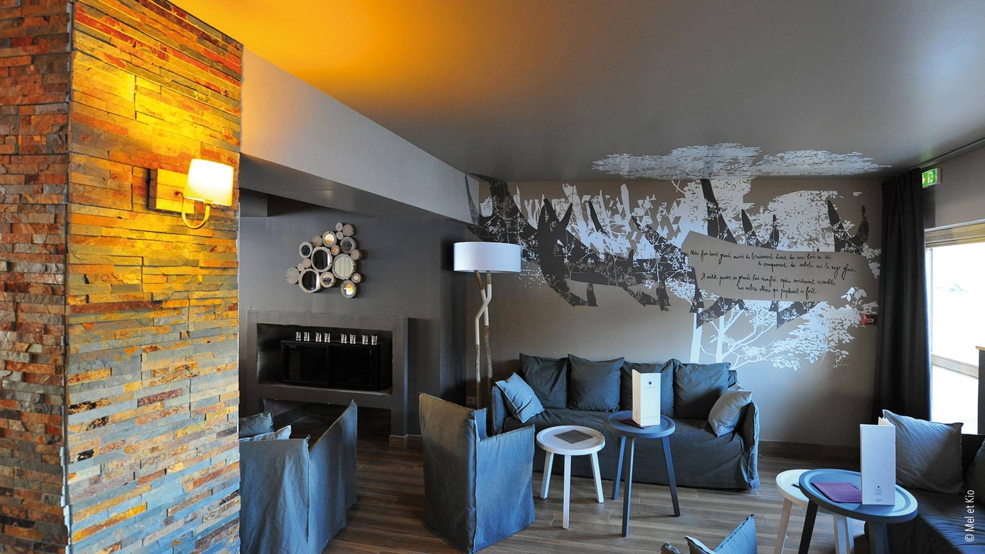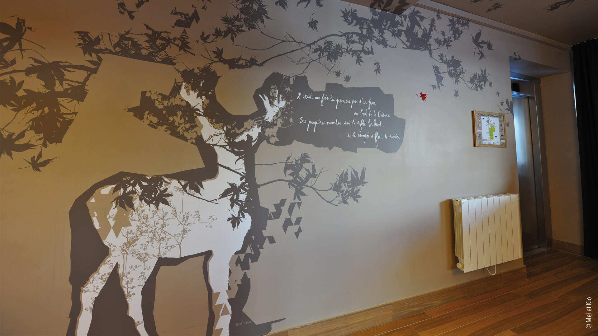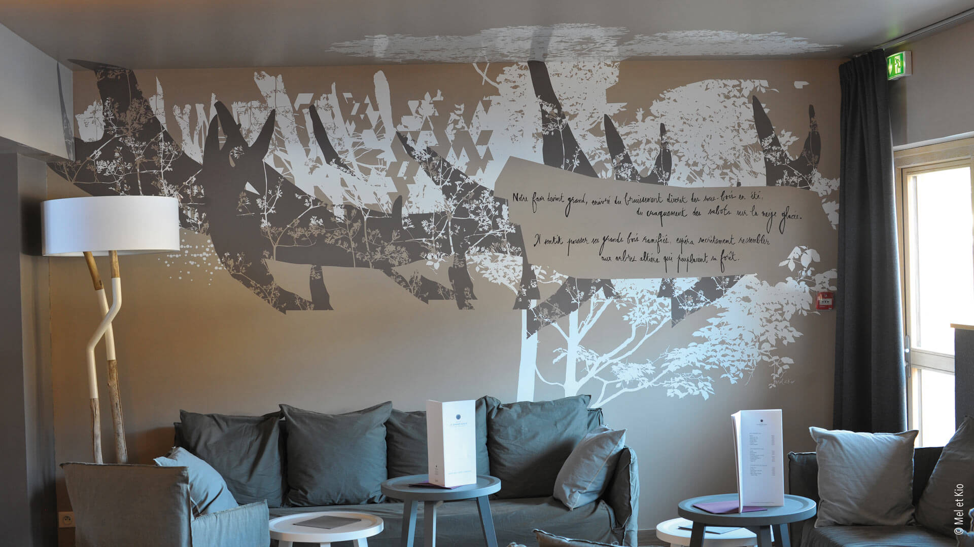 La commande du groupe hôtelier était de renforcer l’identité de ce lieu. Des décorations murales intérieures sur murs et plafonds dans l’ensemble de l’hôtel ainsi que le design mural dans le restaurant. Textes poétiques sur murs et histoire murales écrites et conçues par le duo d’artistes Mel et Kio spécialisés dans l’identité d’hôtels. Le duo a réalisé des dessins sur murs, des décorations murales dans les chambres, des dessins sur les moquettes dans les circulations, des vitrophanies sur les fenêtres et portes vitrées jusqu’à la conception graphique d’un cahier offert aux clients de l’hôtel. L’identité de l’hôtel a été entièrement conçu et réalisé en collaboration étroite avec l’architecte de cet hôtel.