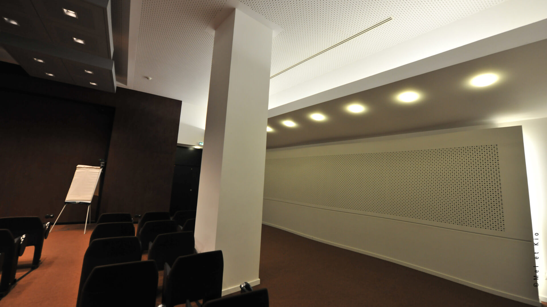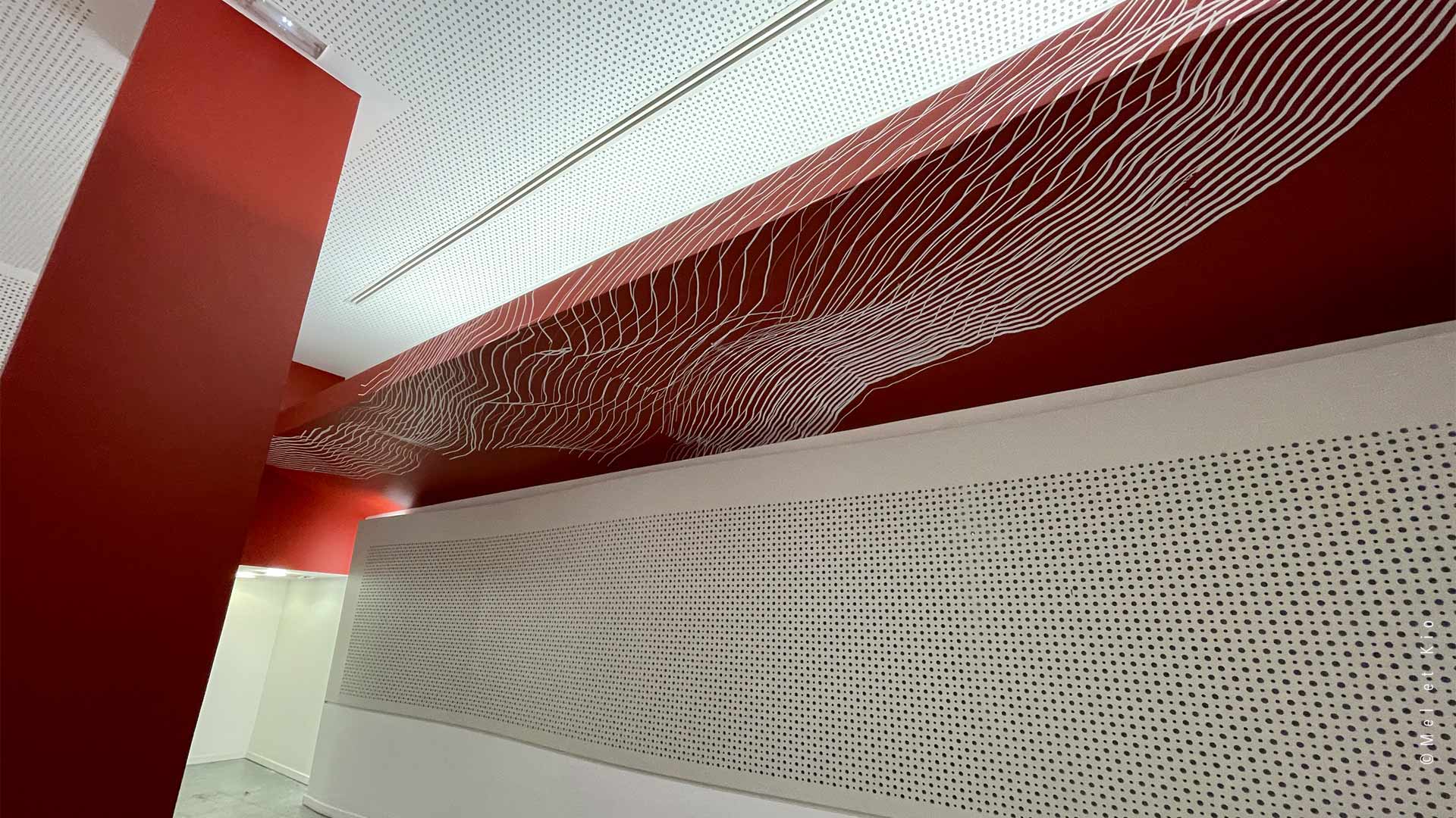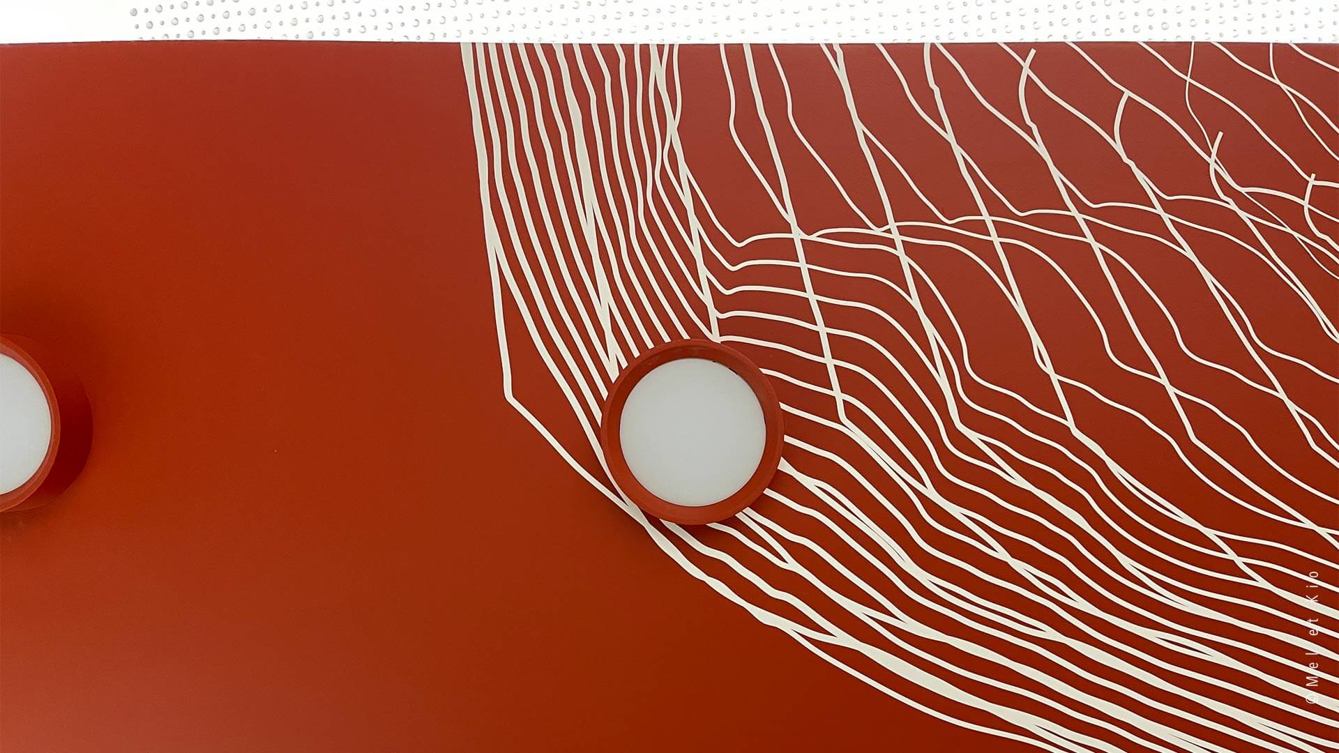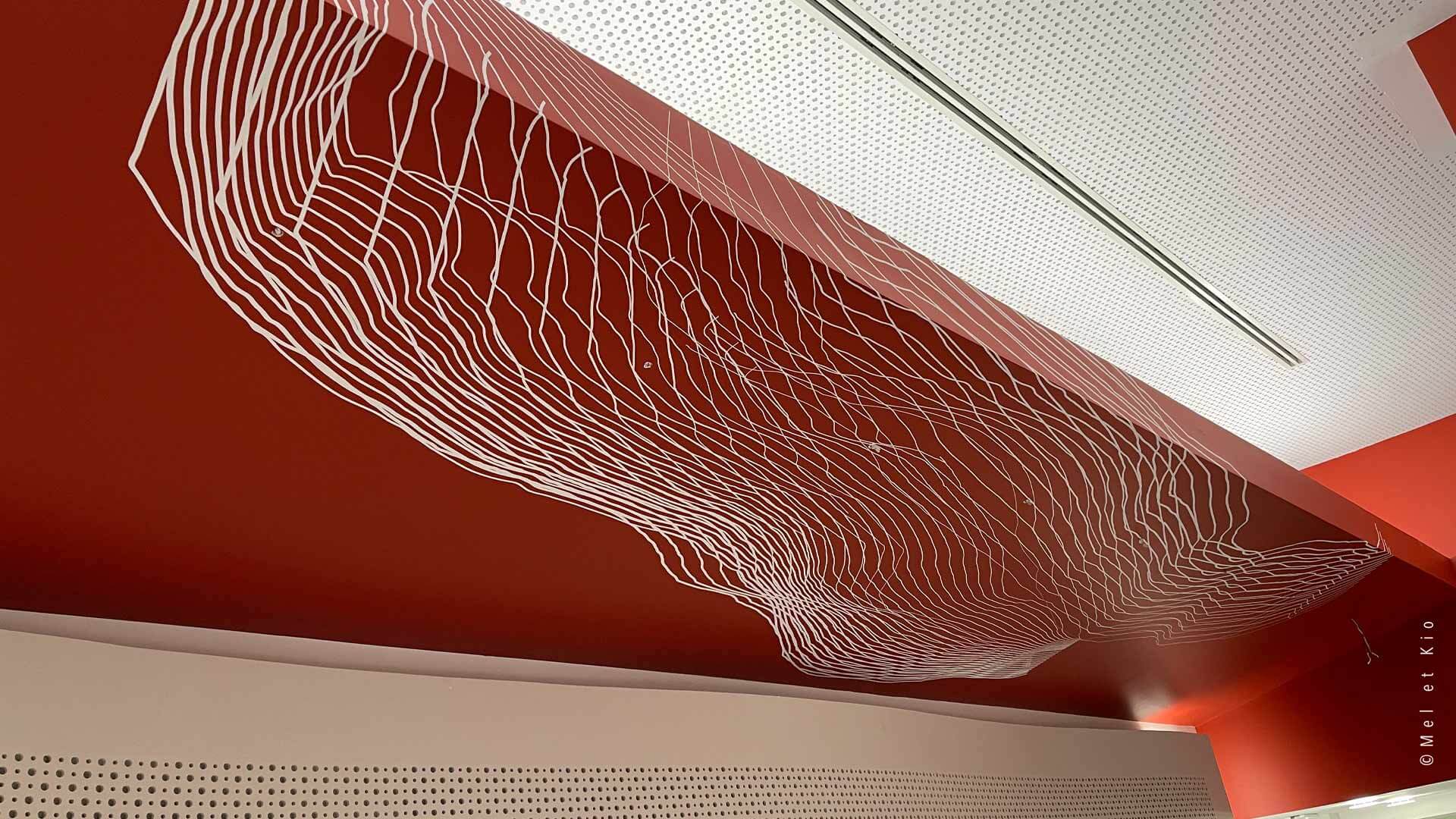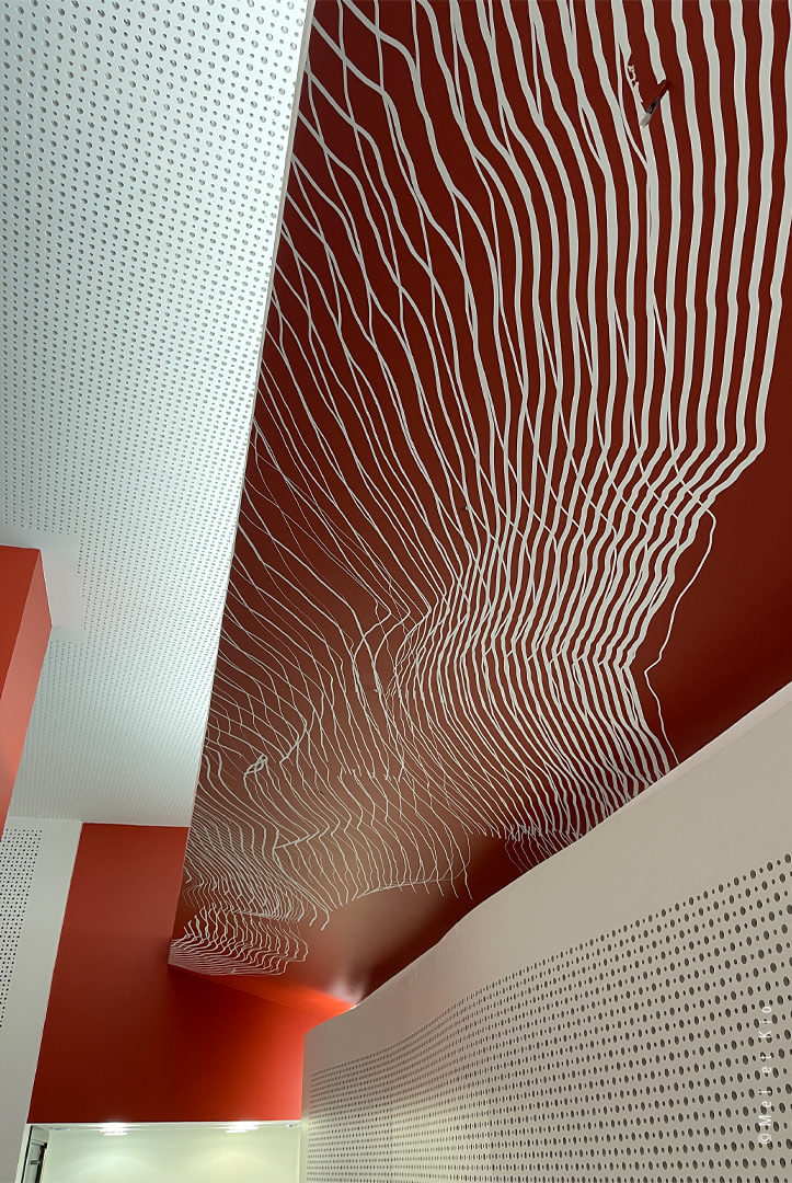 Design mural sur les plafonds d’un auditorium dans un immeuble de bureaux à Boulogne Billancourt. Les lignes graphiques des dessins sur mesure de Mel et Kio