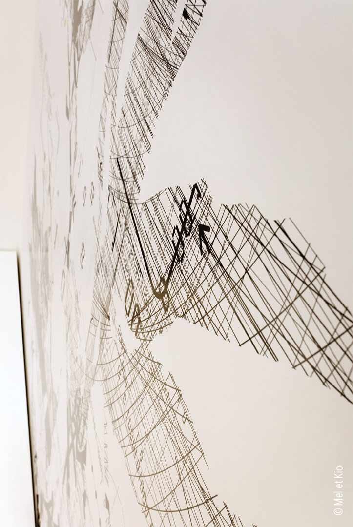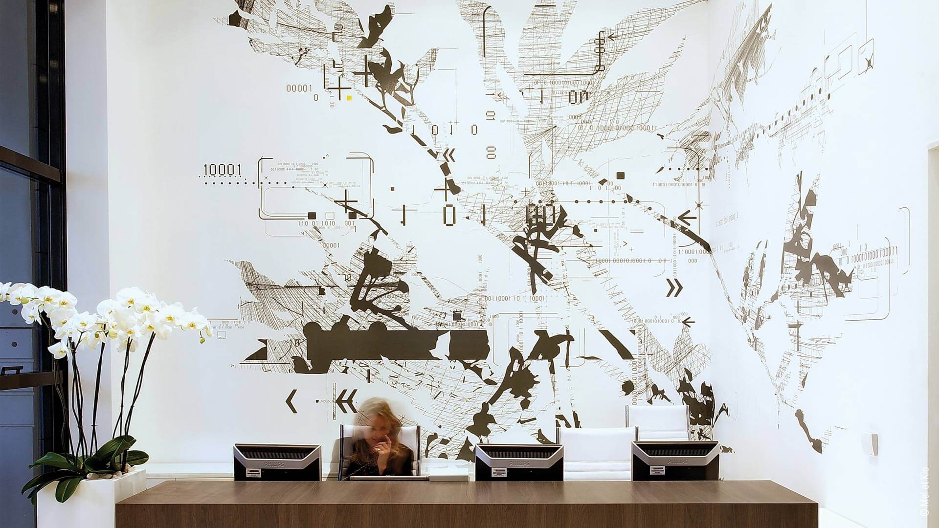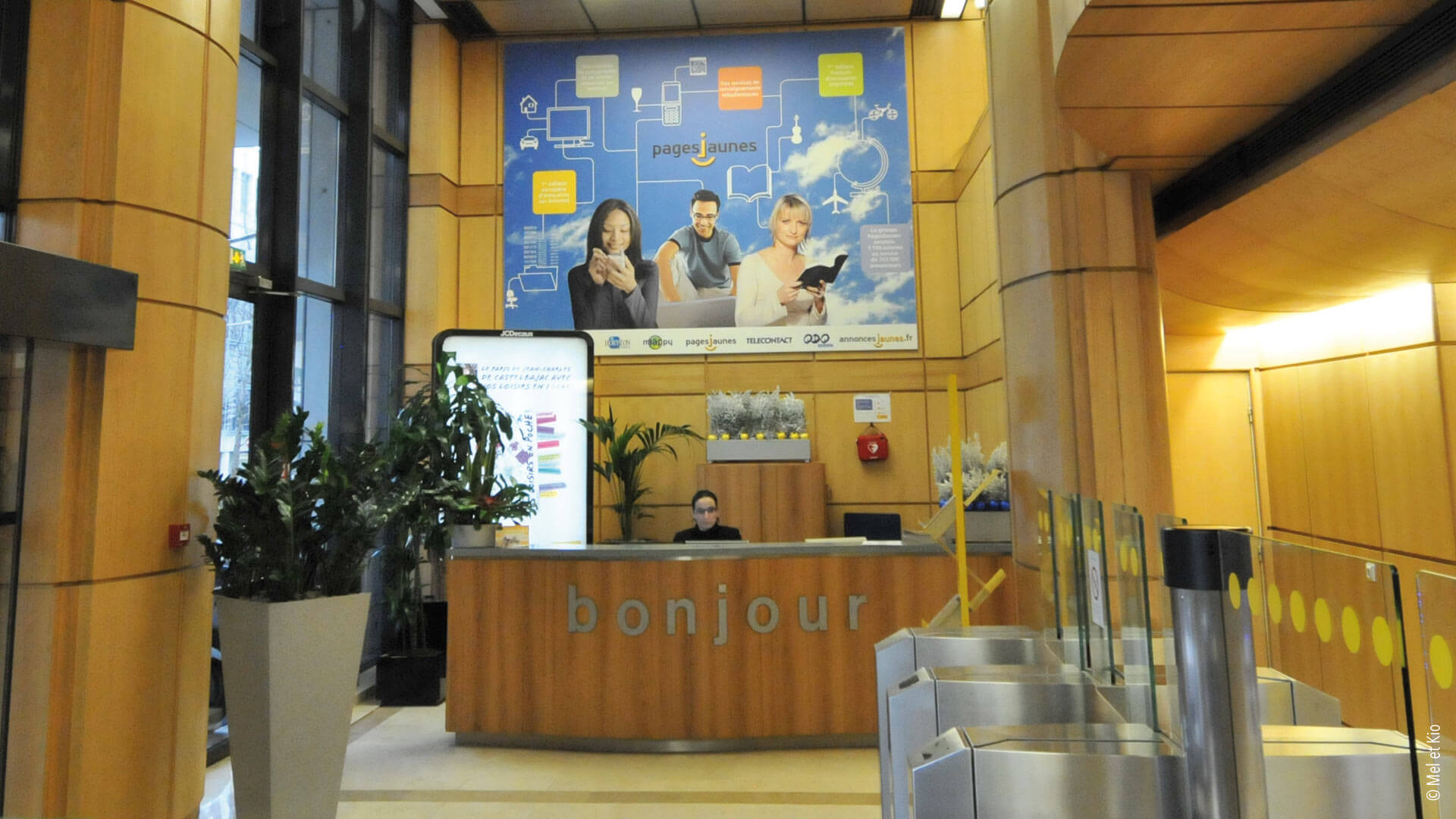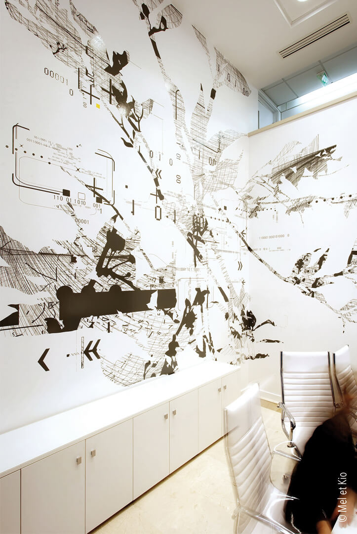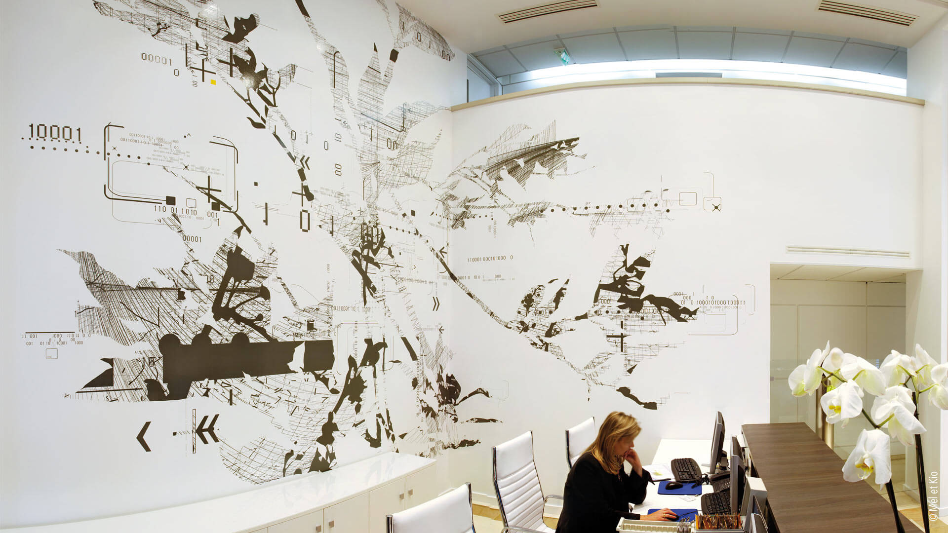 Art mural pour l’accueil du siège social de Solocal, groupe Pages Jaunes. La fresque entièrement réalisée à la main est signée des deux artistes de wall art Mel et Kio spécialistes de l’identité des lieux. Cette fresque murale monumentale à l’accueil offre une image de marquette la société résolument contemporaine. Le reste du bâtiment a été signé de la même trace de graphisme mural des deux artistes.