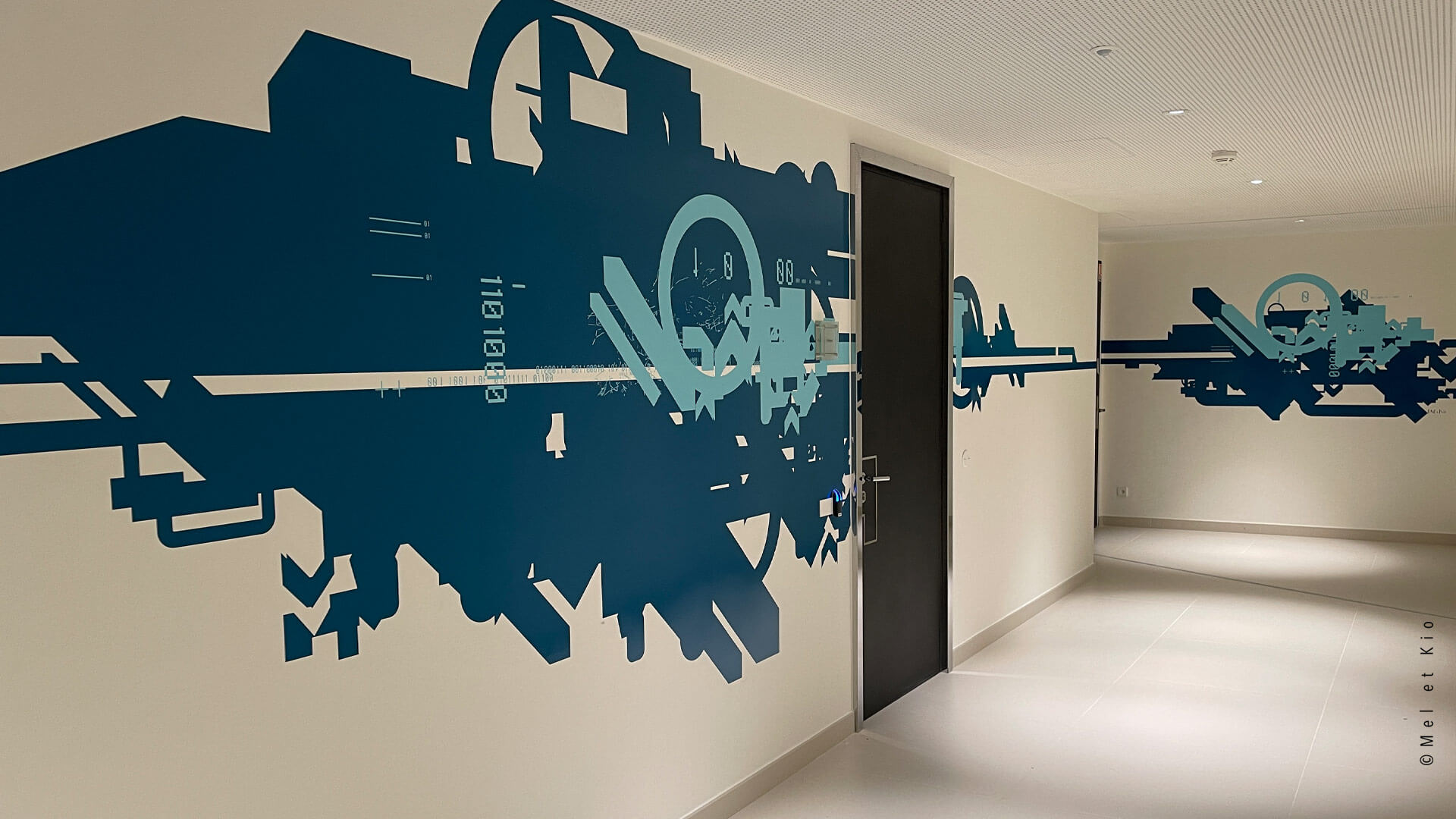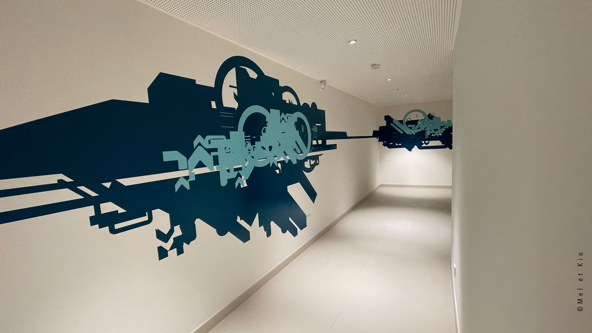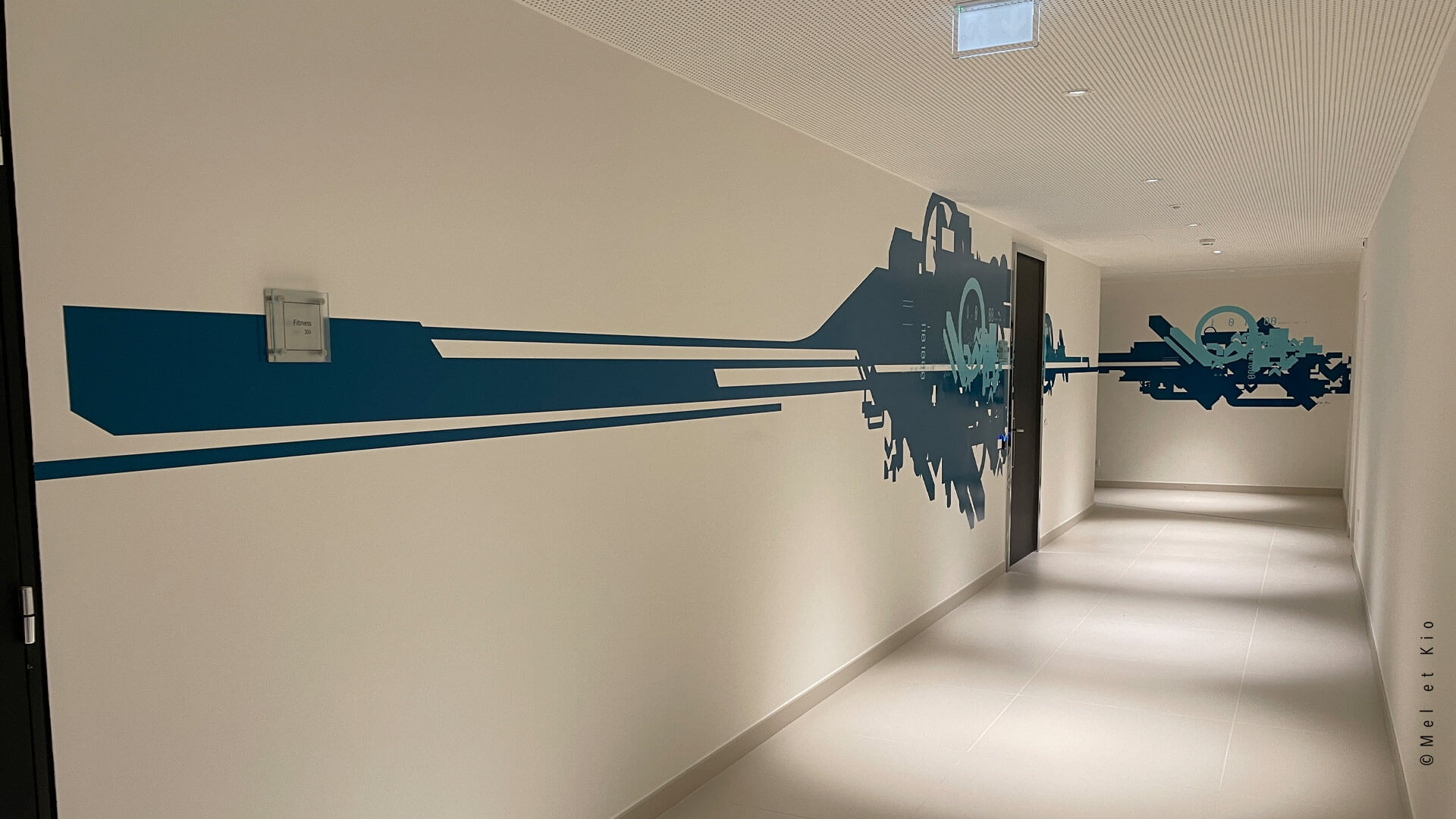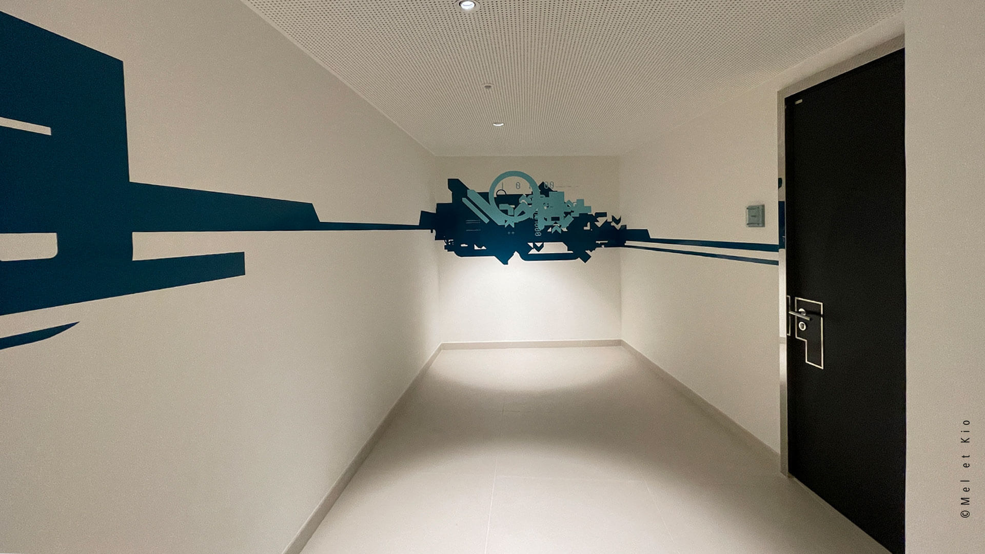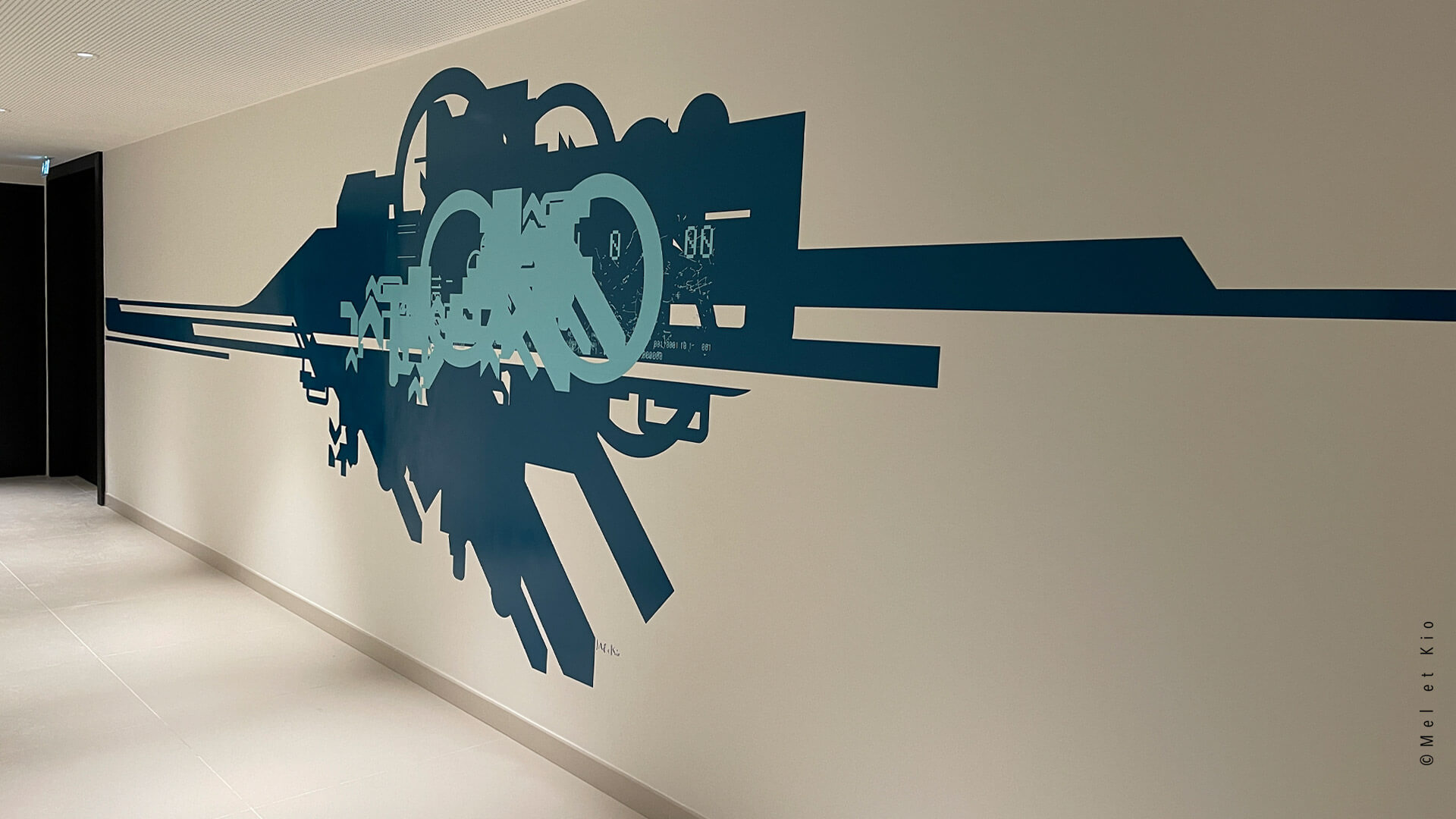 Dans ce fitness au très long couloir la fresque murale de Mel et Kio donne une identité forte au lieu.