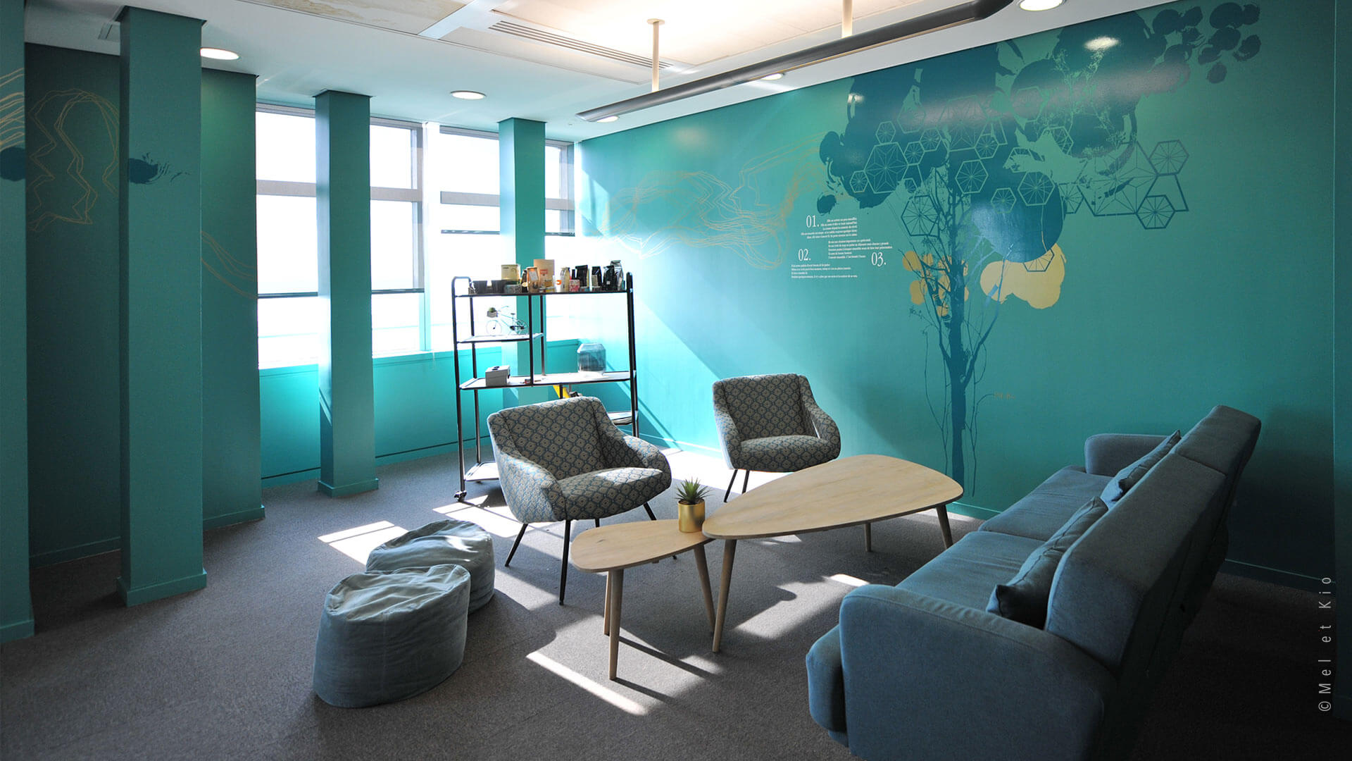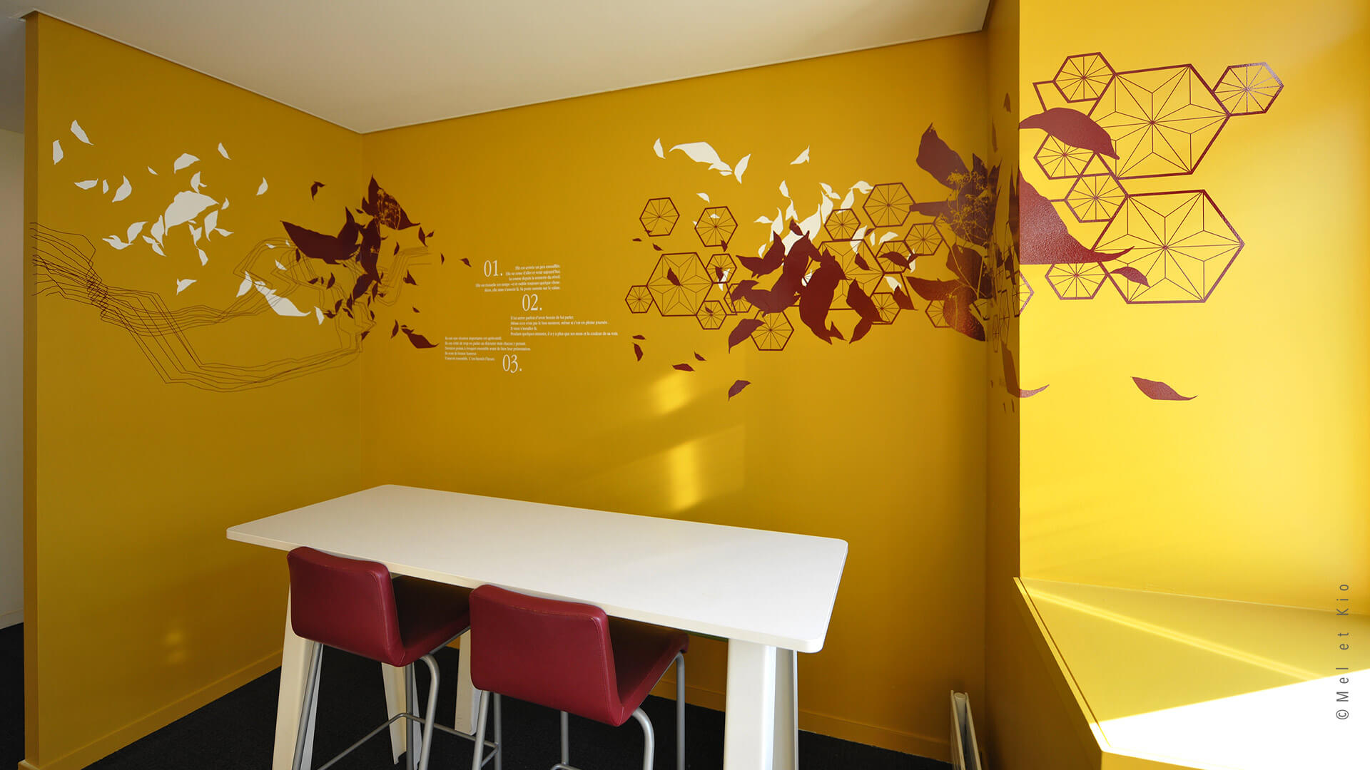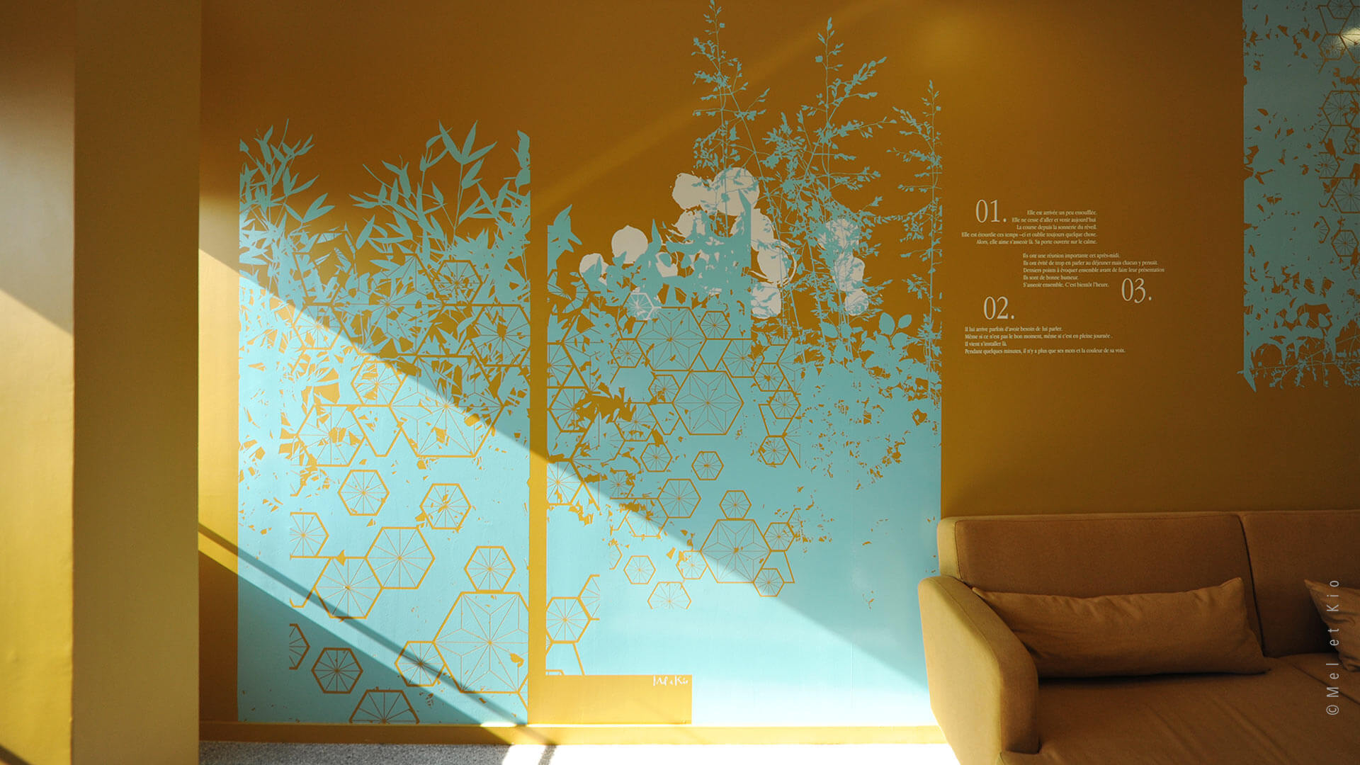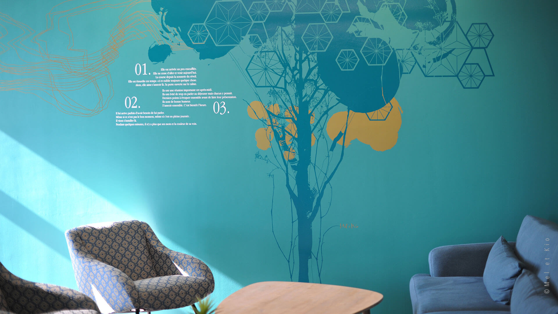 Projet global d’aménagement d’espace de 5 salons pour l’entreprise Air France. De l’intervention graphique et textuelle sur les mur en passant par les choix chromatiques et le choix du mobilier. Les salons d’attentes se parent de fresques et de textes poétiques originaux écris par Kio. Les deux artistes spécialistes du conseil en identité d’entreprises proposent ici des œuvres originales de design mural. Ces graphismes d’espaces réalisés à la mains virevoltent entre les différents salons du siège de Air France.