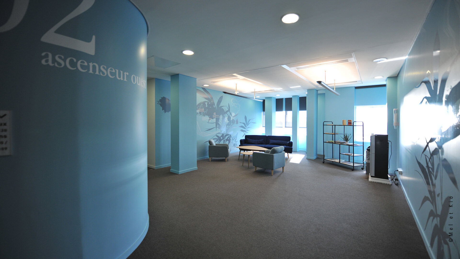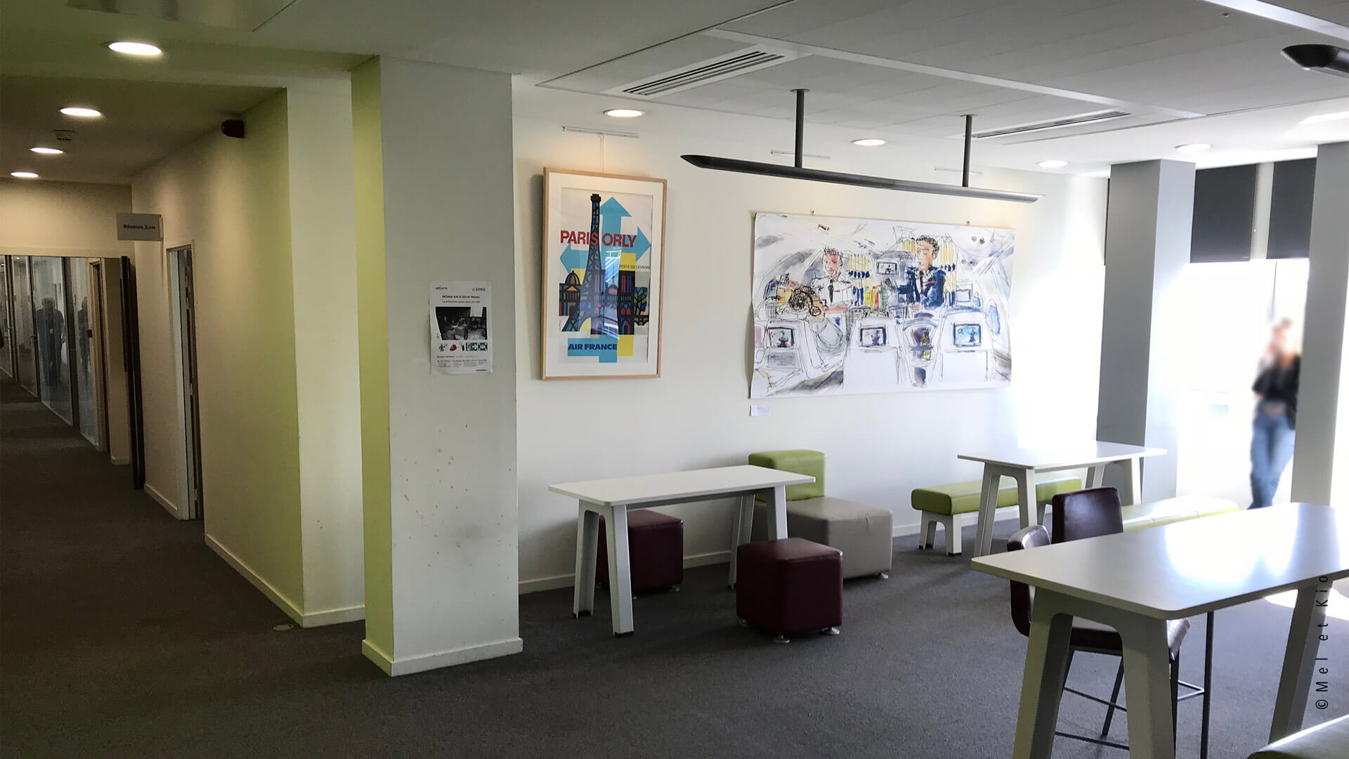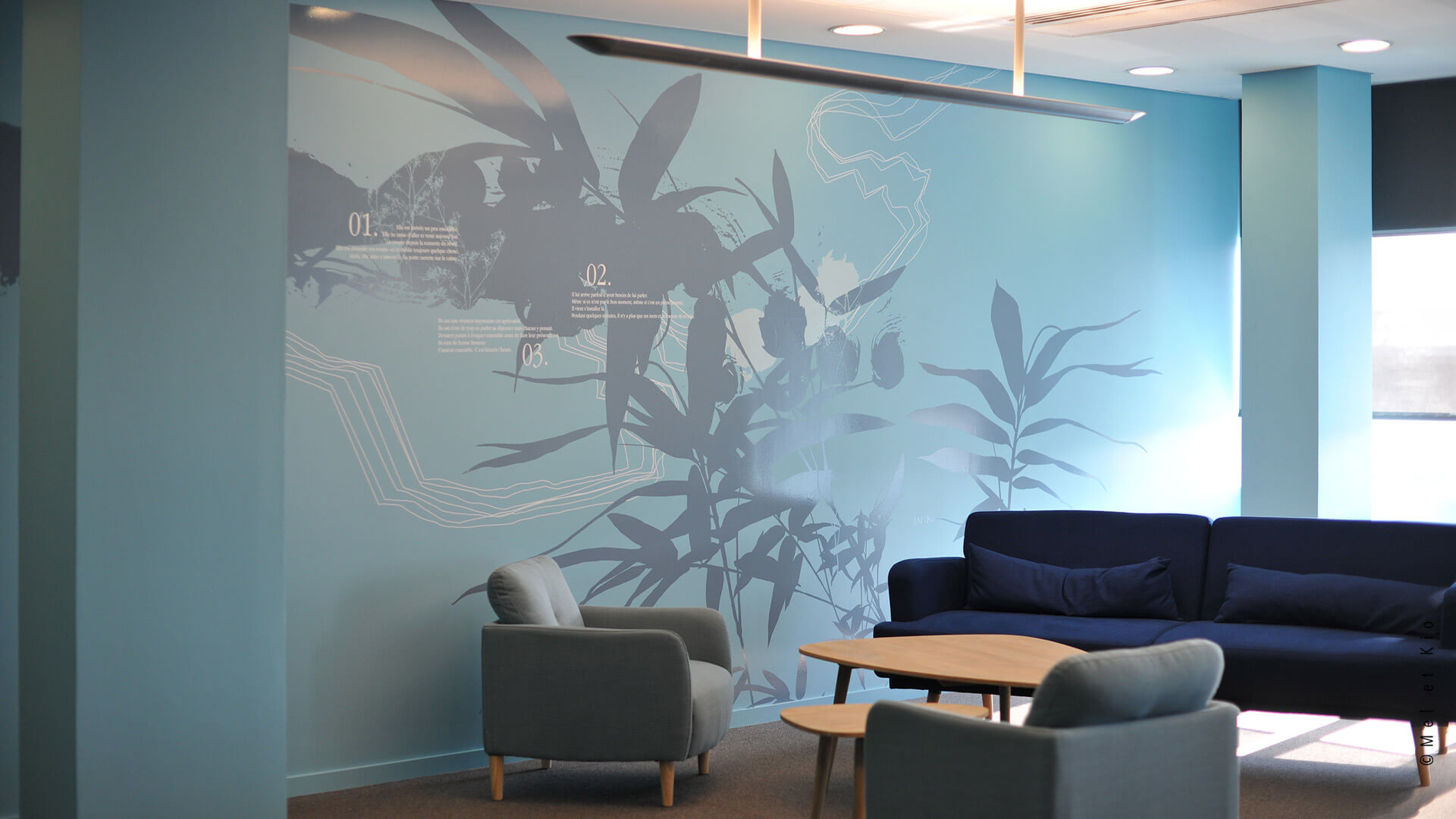 Projet global d’aménagement d’espace de 5 salons pour l’entreprise Air France. De l’intervention graphique et textuelle sur les mur en passant par les choix chromatiques et le choix du mobilier. Les salons d’attentes se parent de fresques et de textes poétiques originaux écris par Kio. Les deux artistes spécialistes du conseil en identité d’entreprises proposent ici des œuvres originales de design mural. Ces graphismes d’espaces réalisés à la mains virevoltent entre les différents salons du siège de Air France.