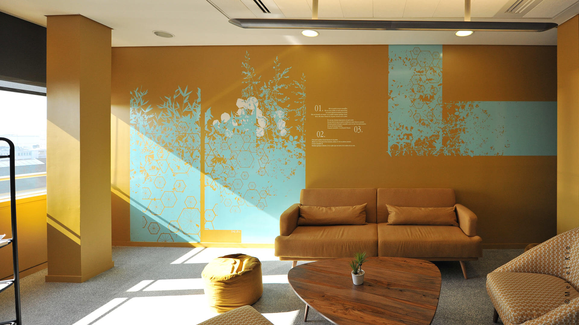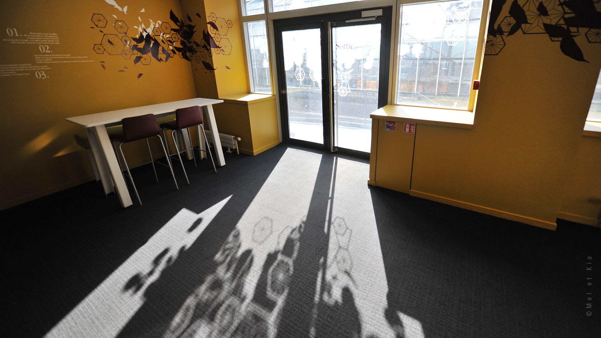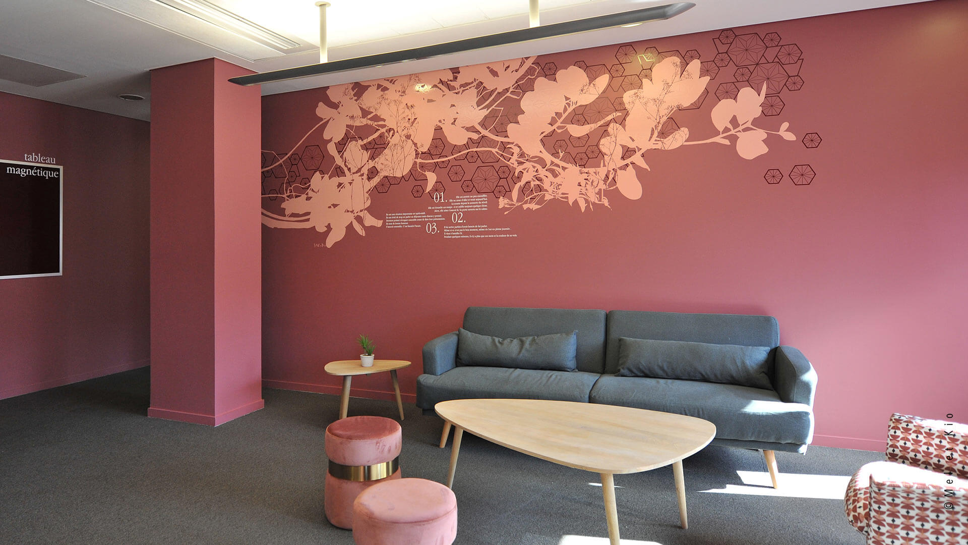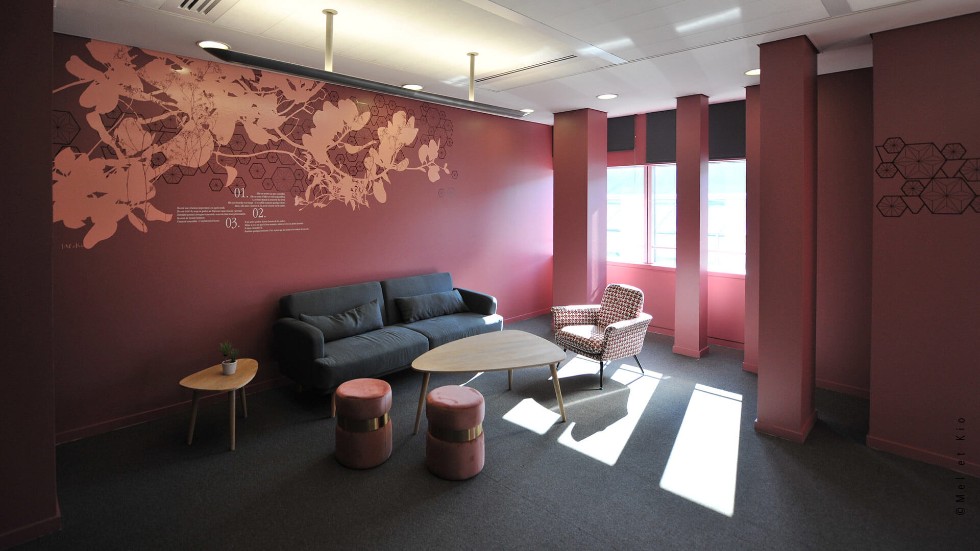 Projet global d’aménagement d’espace de 5 salons pour l’entreprise Air France. De l’intervention graphique et textuelle sur les mur en passant par les choix chromatiques et le choix du mobilier. Les salons d’attentes se parent de fresques et de textes poétiques originaux écris par Kio. Les deux artistes spécialistes du conseil en identité d’entreprises proposent ici des œuvres originales de design mural. Ces graphismes d’espaces réalisés à la mains virevoltent entre les différents salons du siège de Air France.