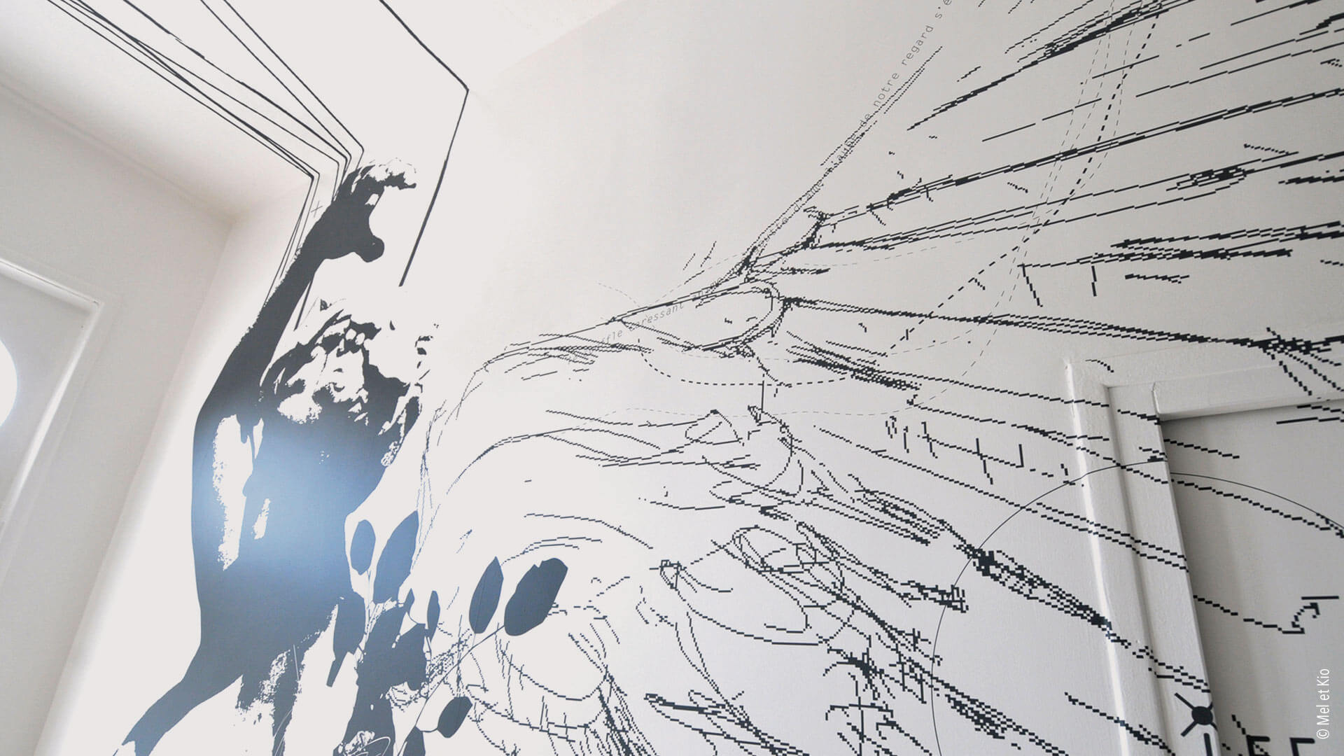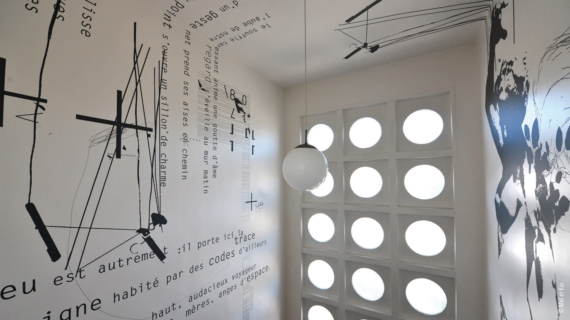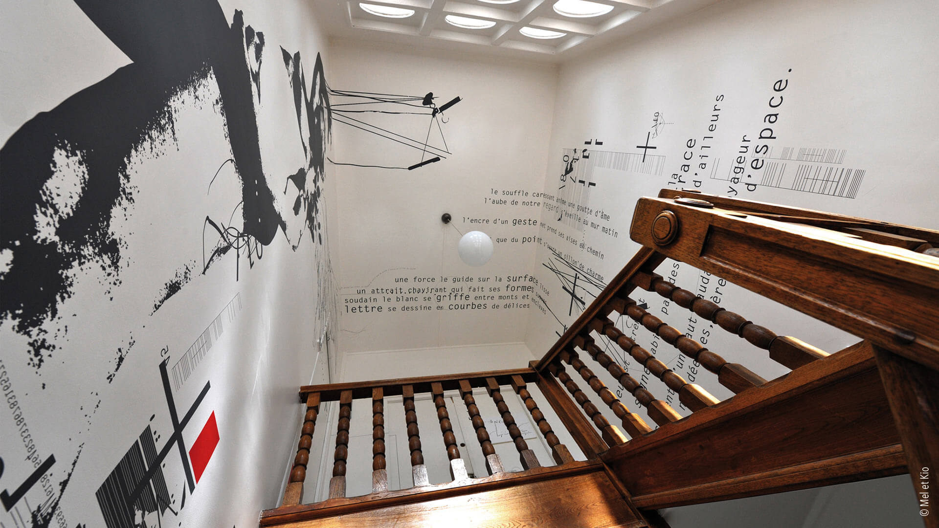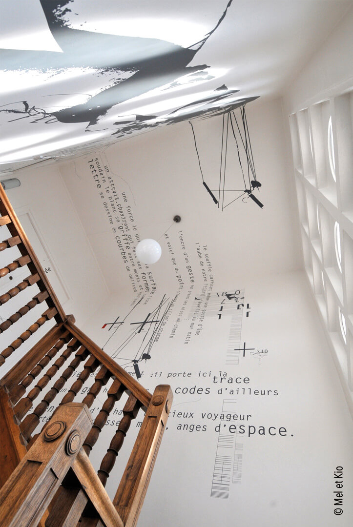 Art mural et textes poétiques sur les murs et plafonds de l’escalier d’un siège social d’entreprise à Rouen
