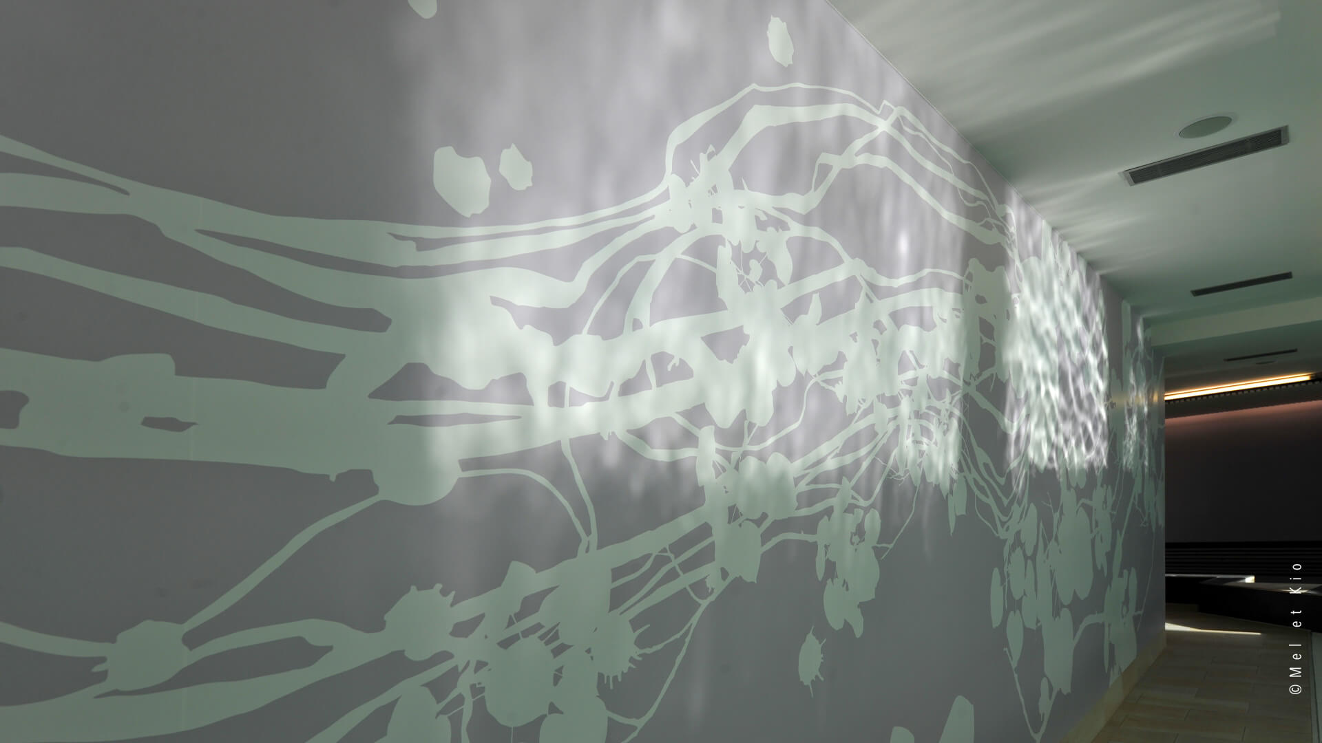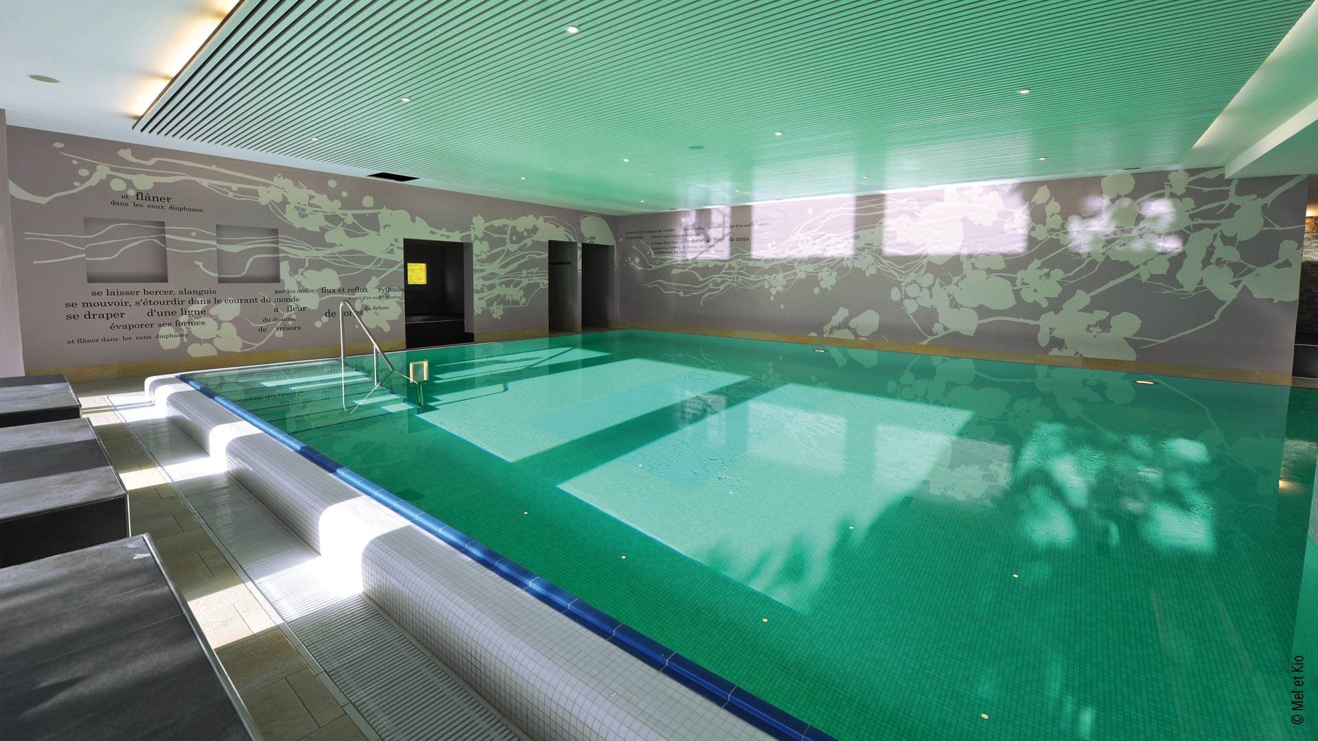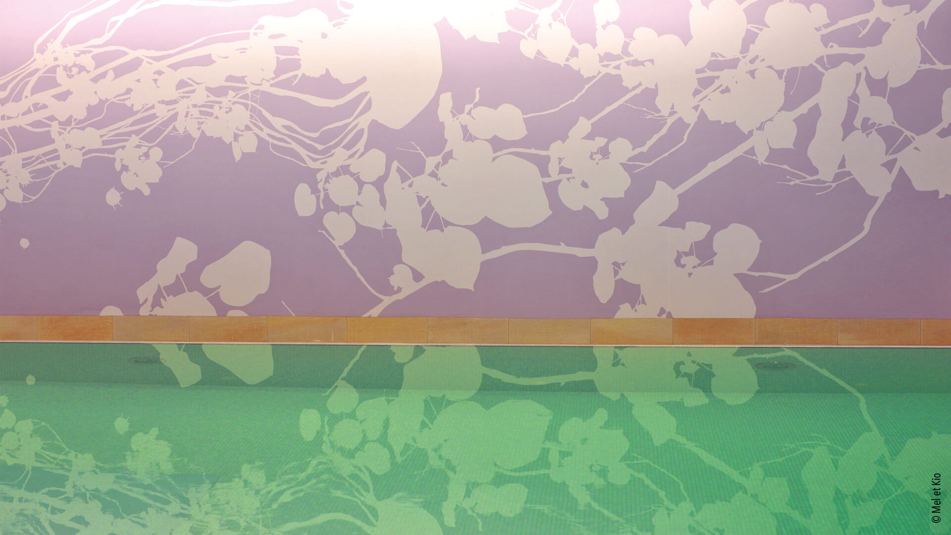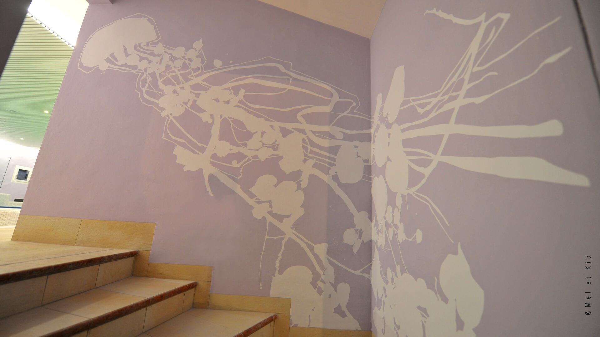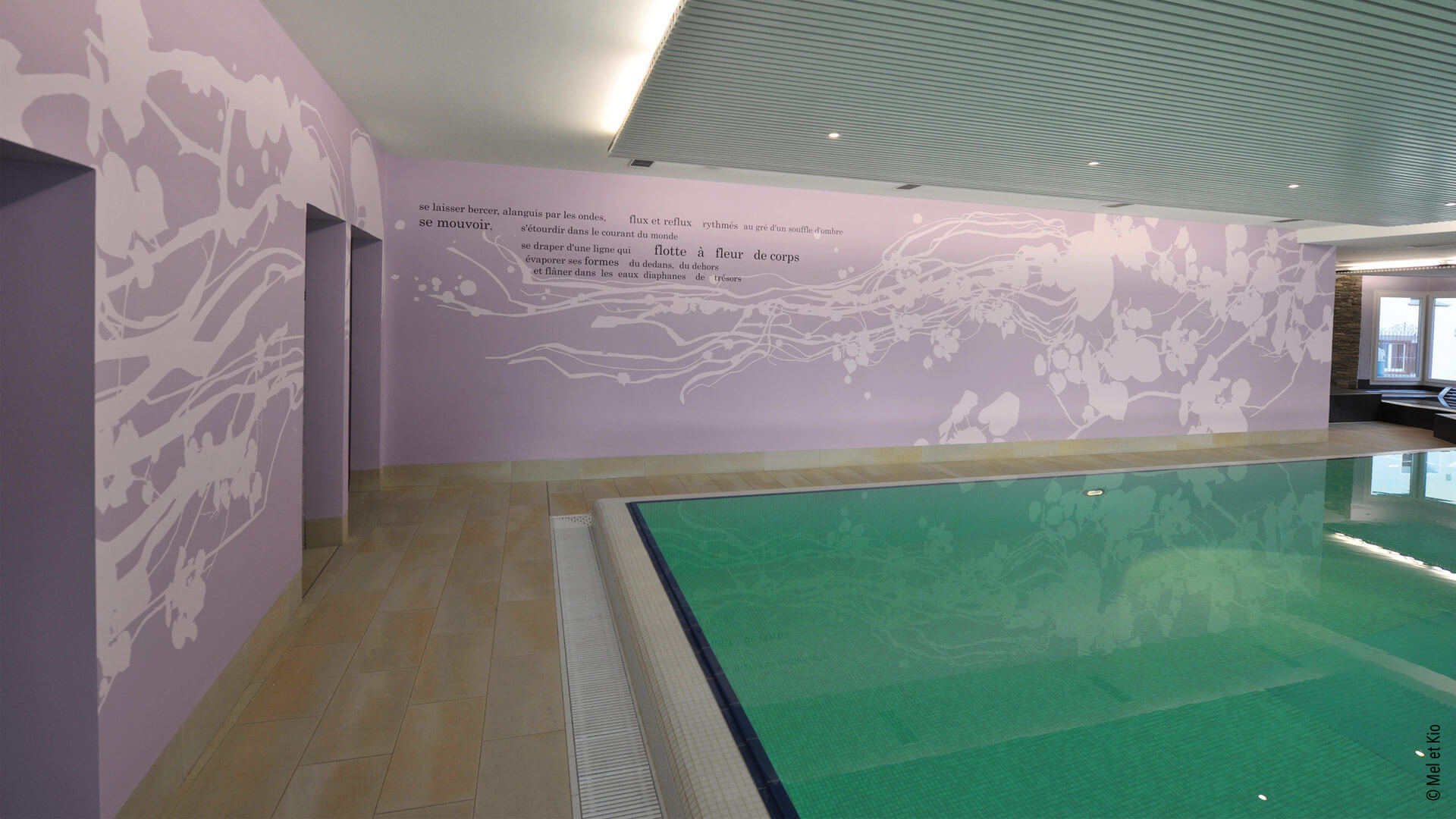Design mural de la piscine de l’hôtel Giardino Mountain*****. Textes et dessins sur murs originaux signés Mel et Kio.