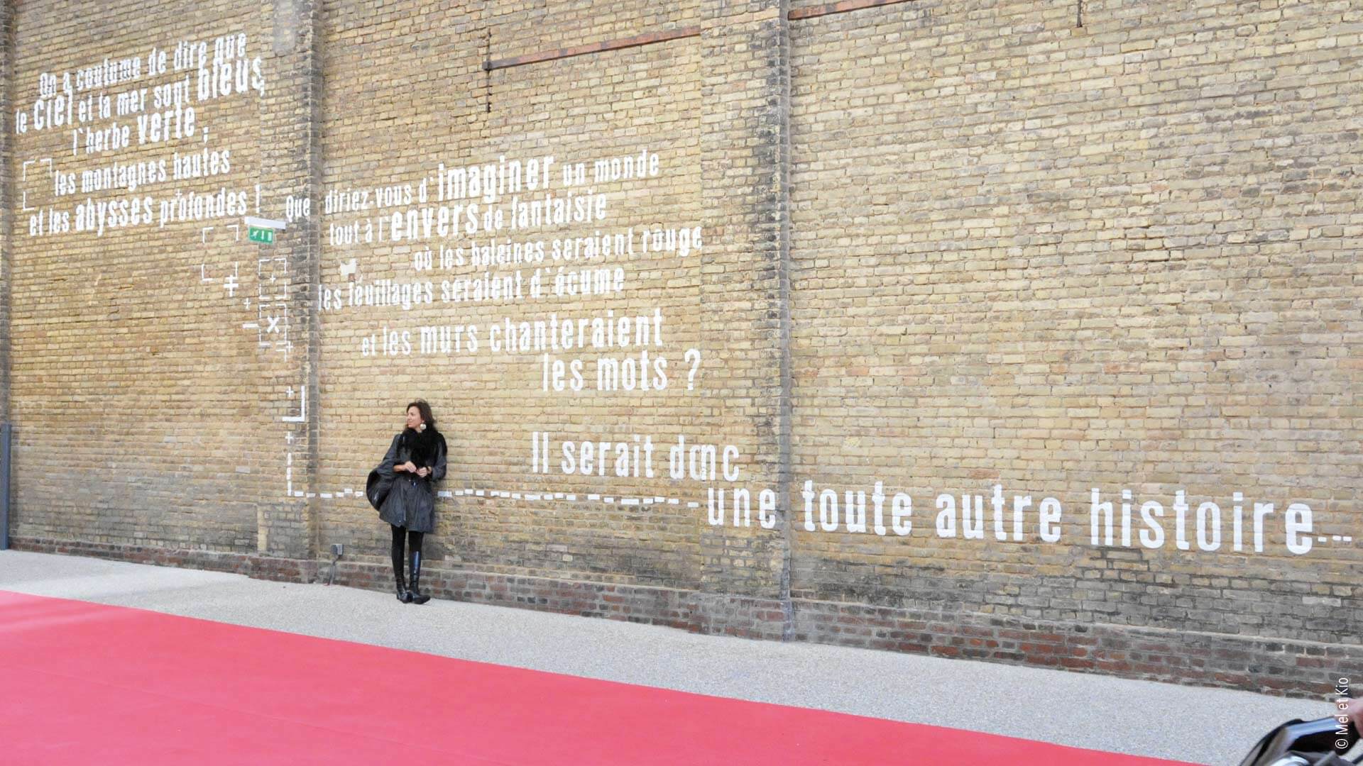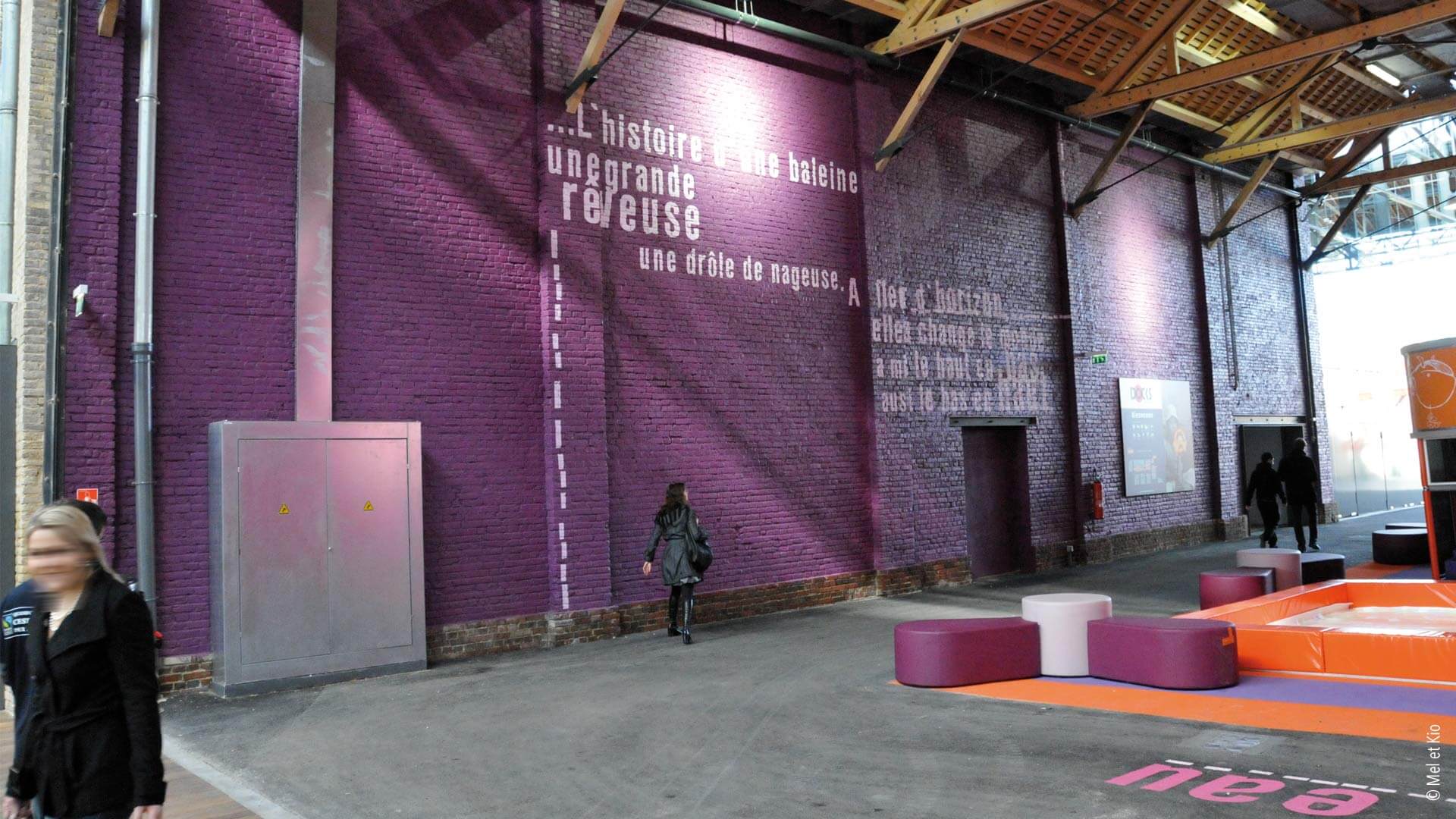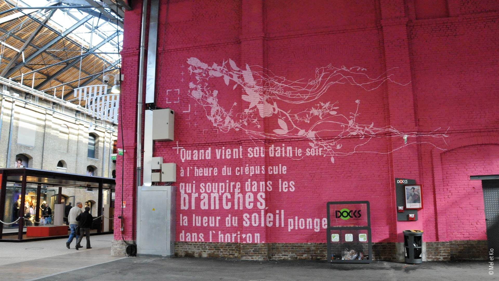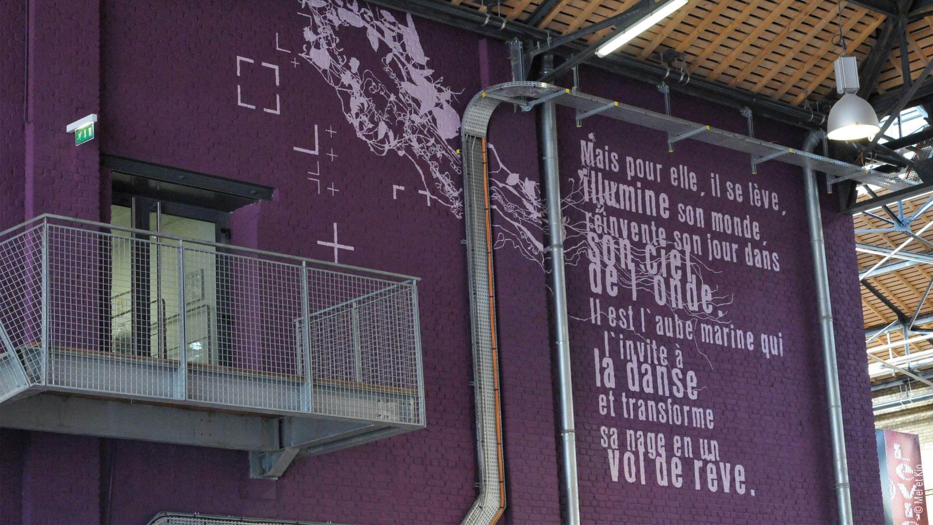 Décors muraux monumentaux extérieurs et textes poétiques originaux écrits par Kio pour ce centre commercial réaménagé par l’atelier d’architecture Wilmotte & Associés