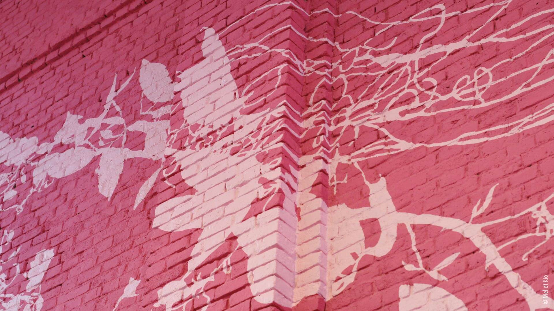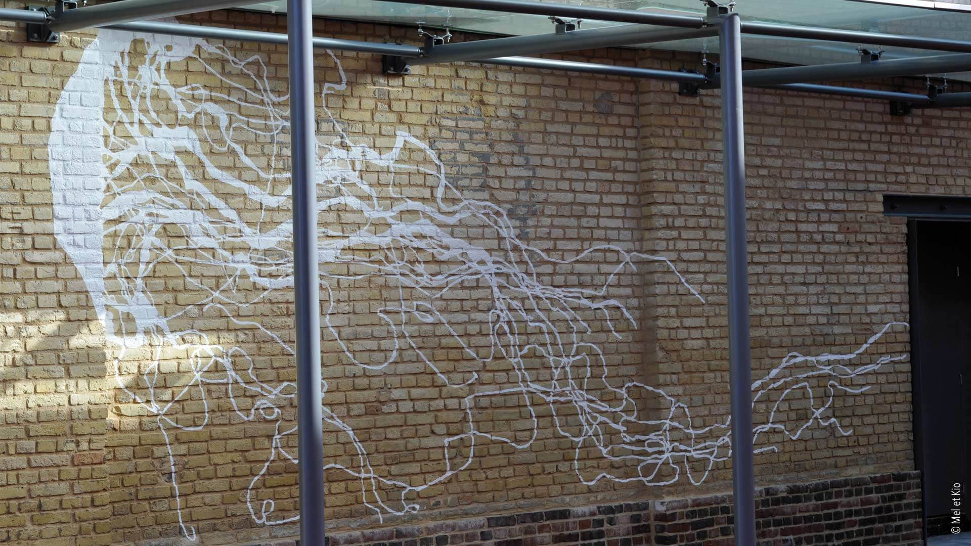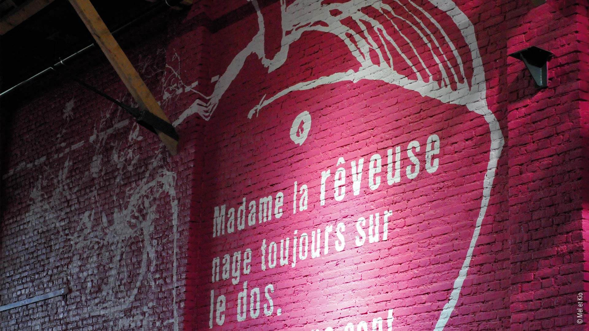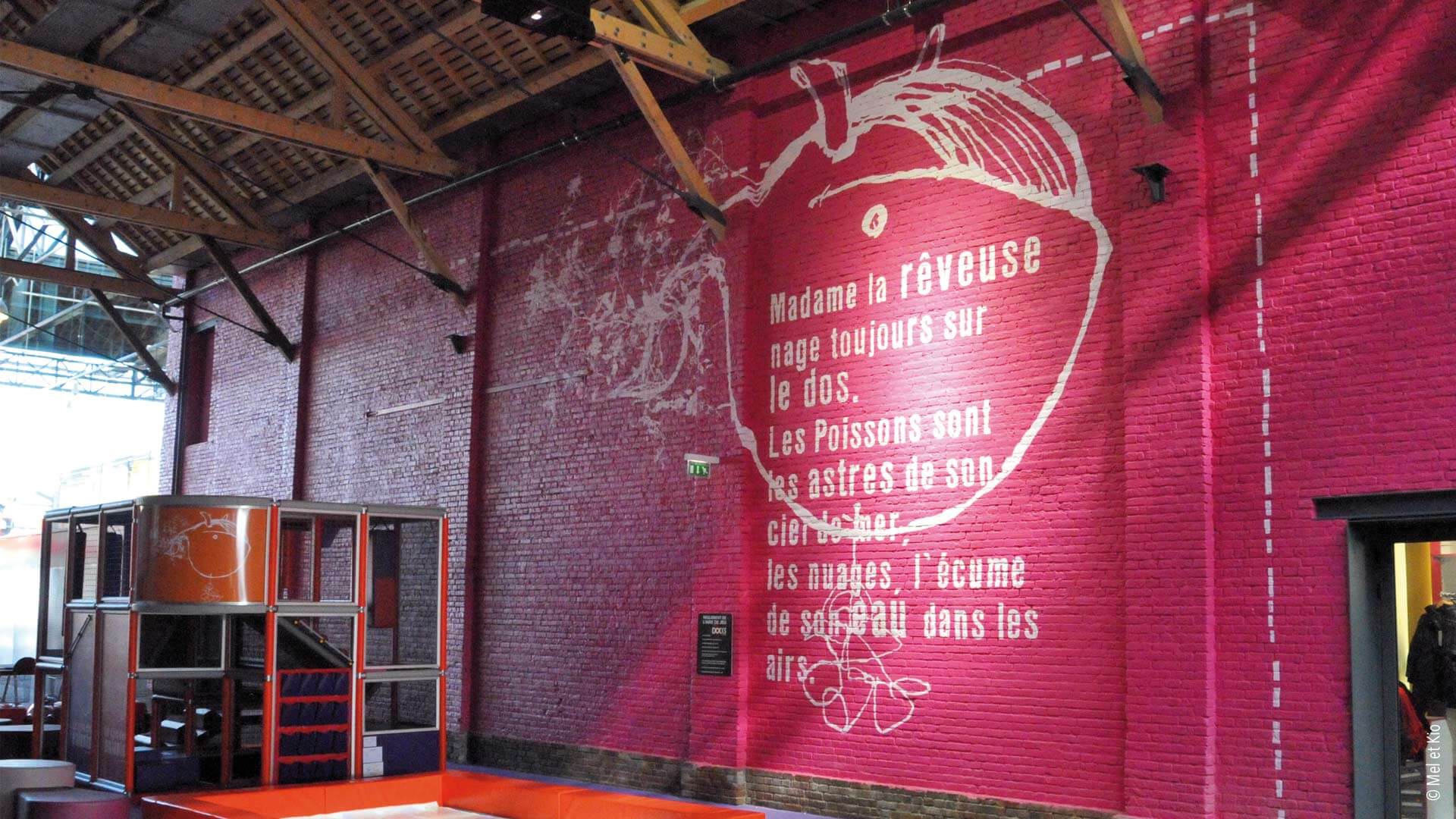 Décors muraux monumentaux extérieurs et textes poétiques originaux écrits par Kio pour ce centre commercial réaménagé par l’atelier d’architecture Wilmotte & Associés