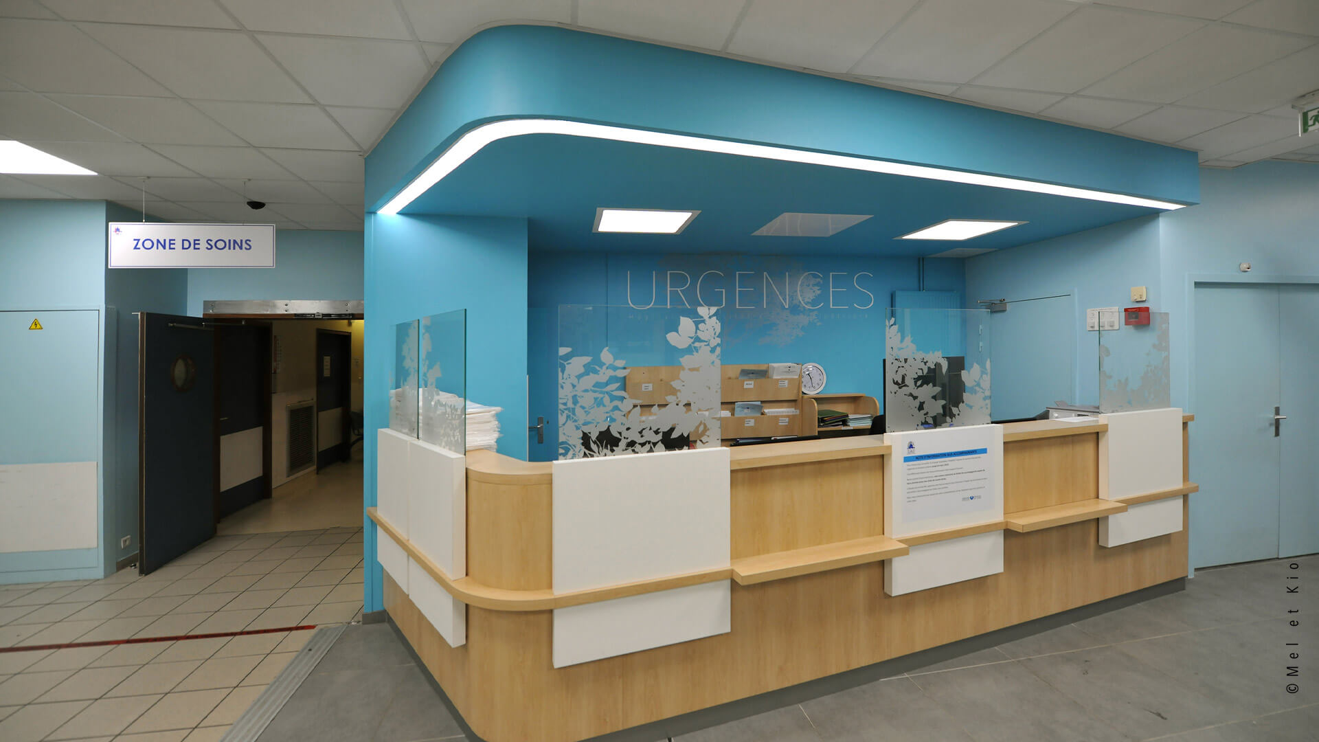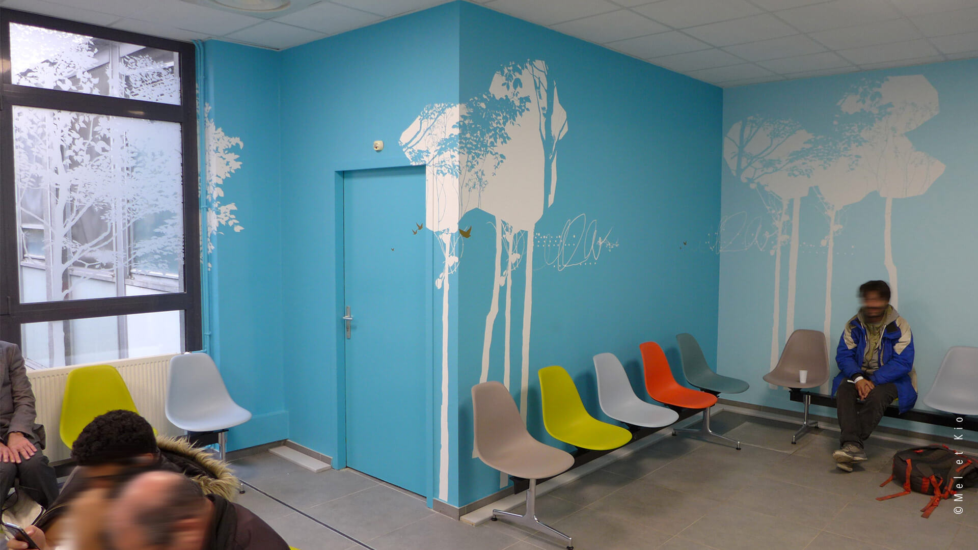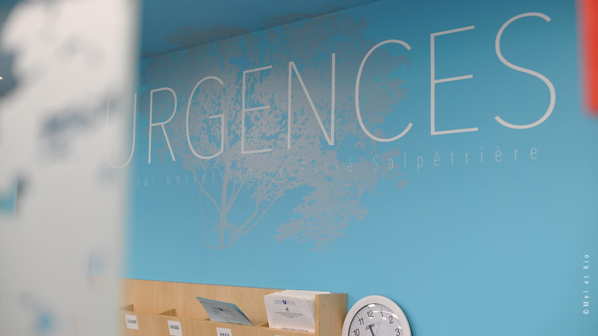 Décors muraux des urgences de l’hôpital de la Pitié Salpêtrière et habillage de la banque d’accueil