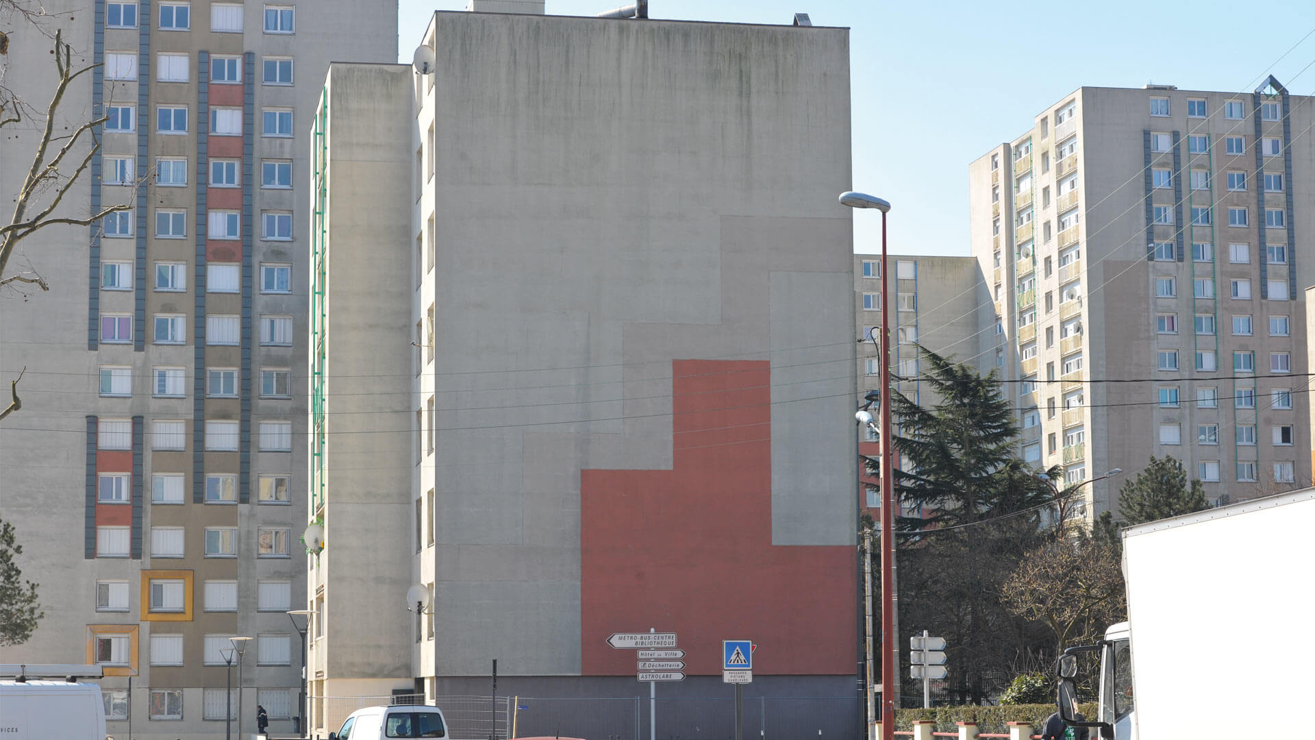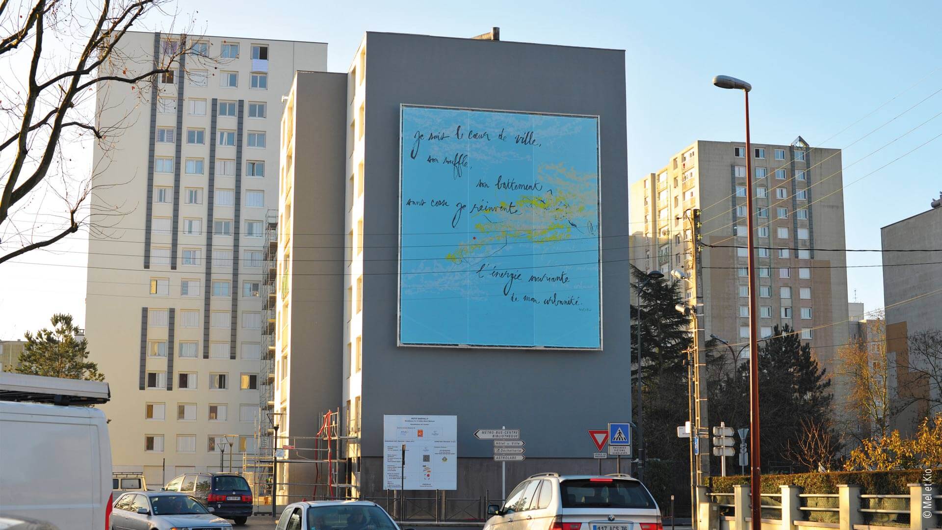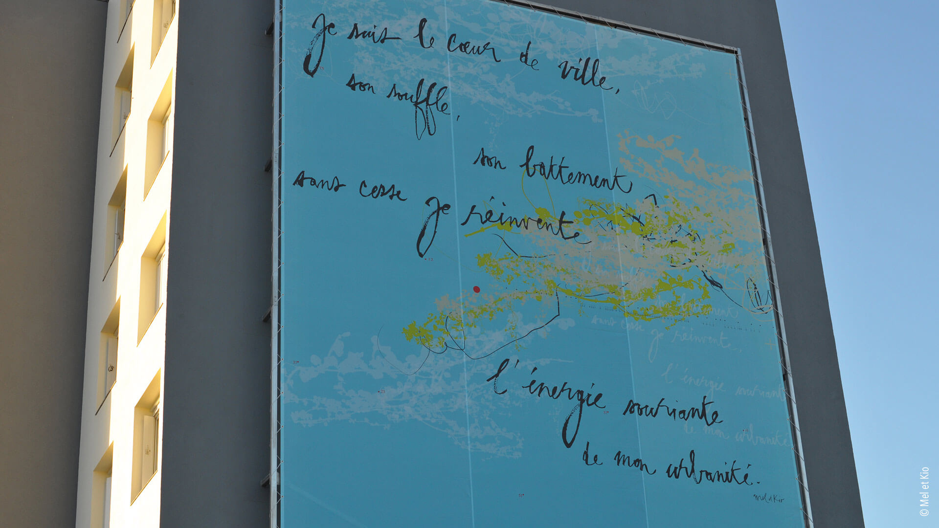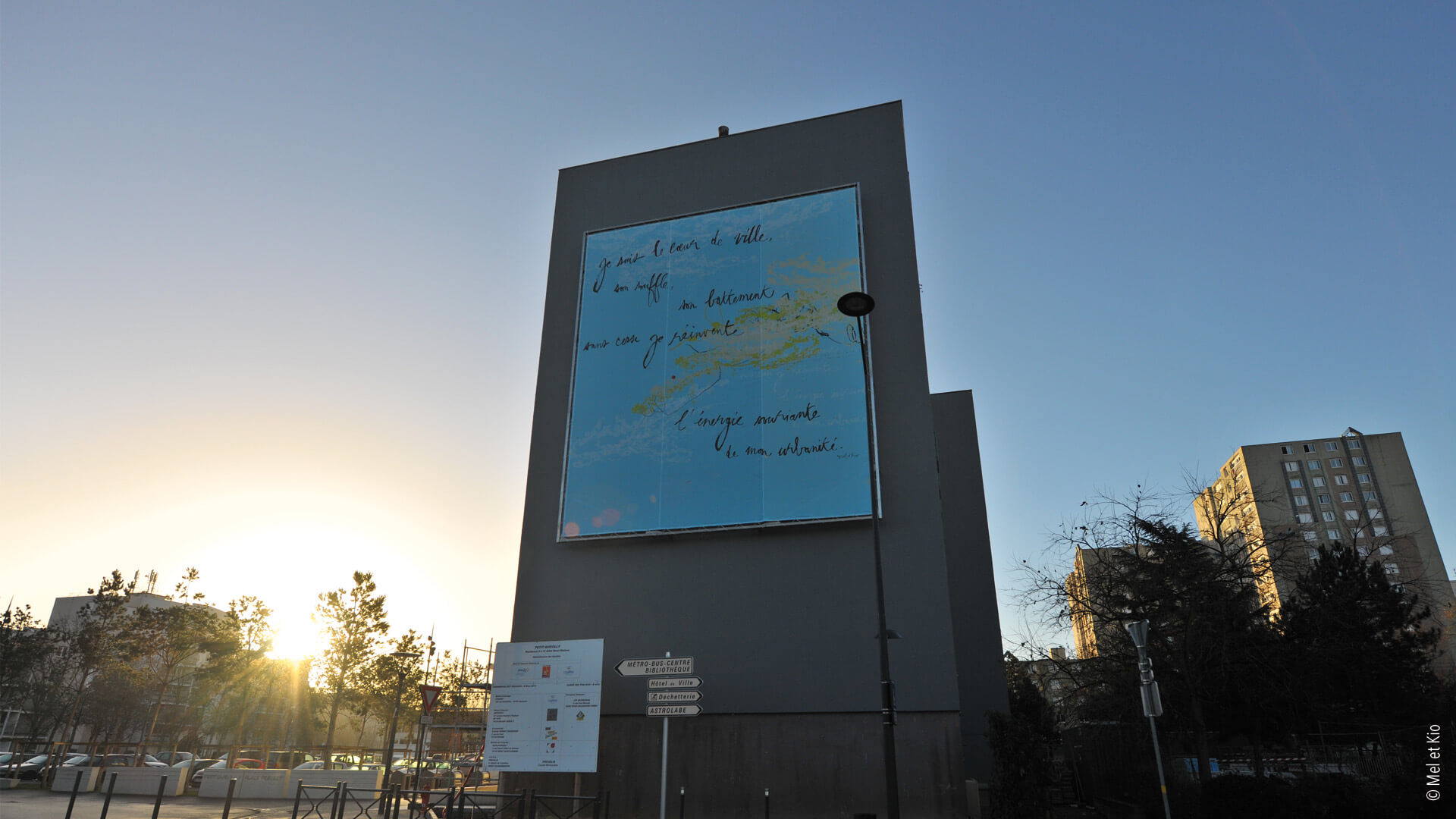 Mel et Kio proposent dans l’espace urbain une fenêtre ouverte sur le ciel : la ville s’adresse au passant et lui délivre un message poétique en mouvement par cette oeuvre urbaine.