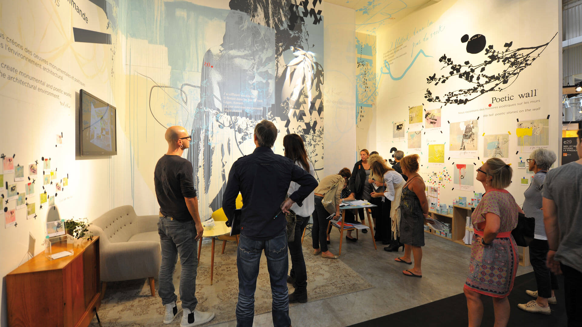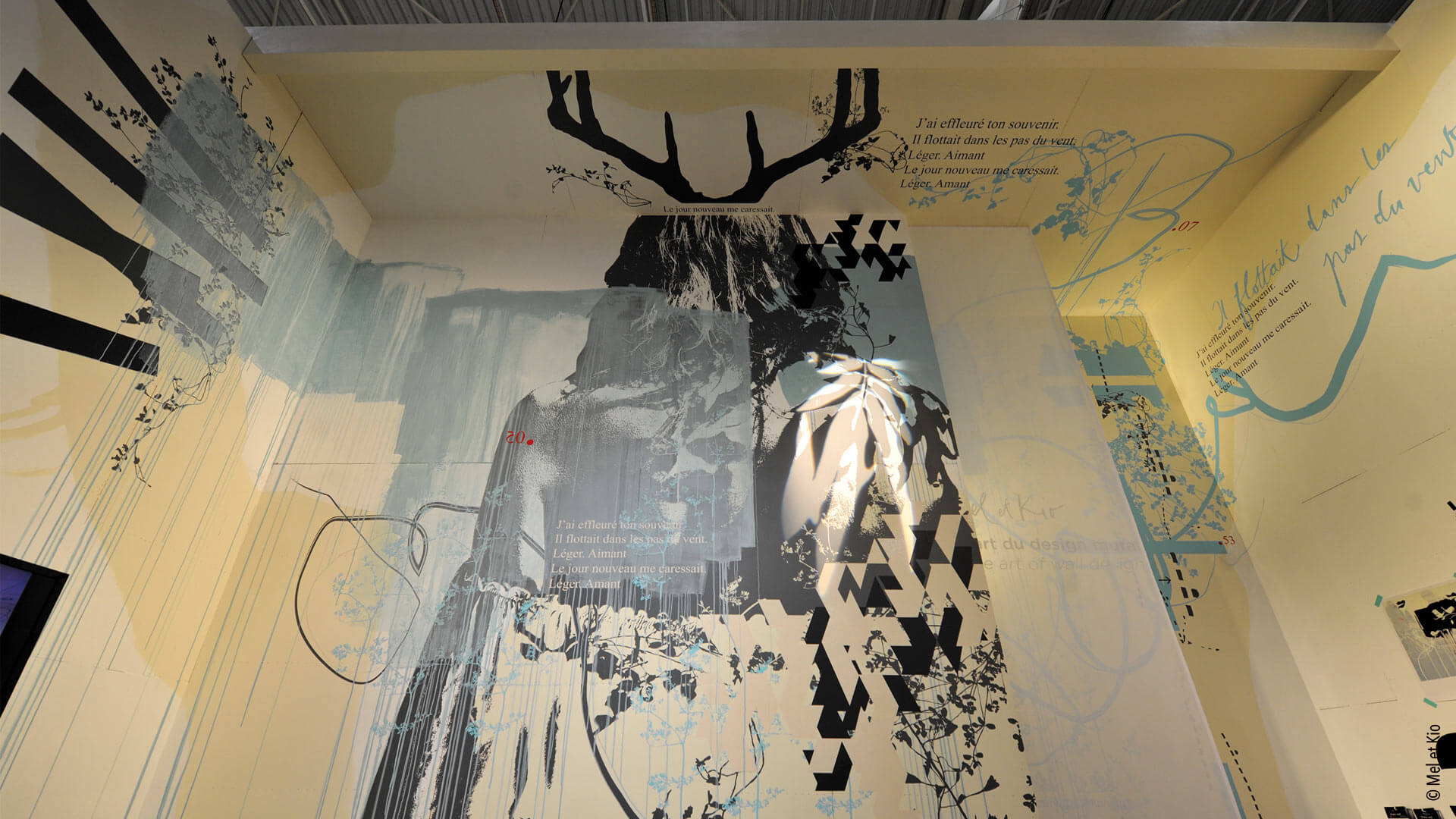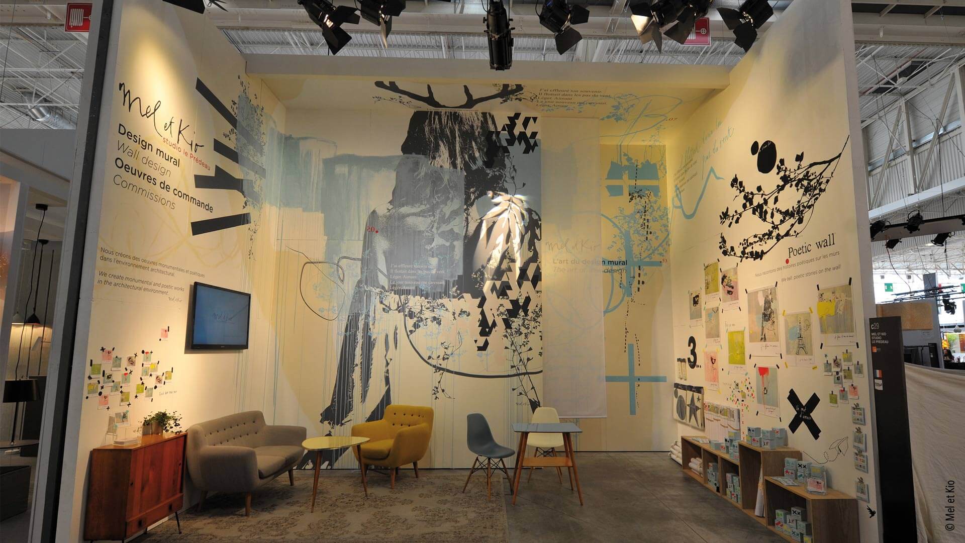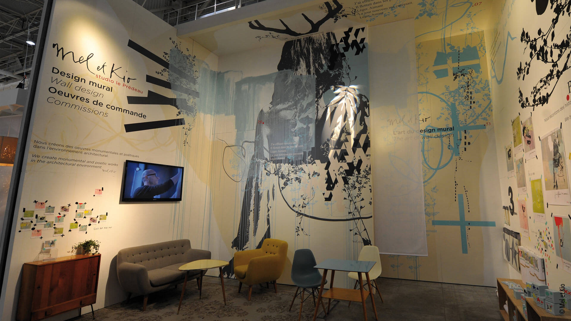 Fresque murale qui mêle le stickers à la peinture. Exposition de l’art mural de Mel et Kio au salon Maison et Objet Paris – Section NOW! Design à vivre.