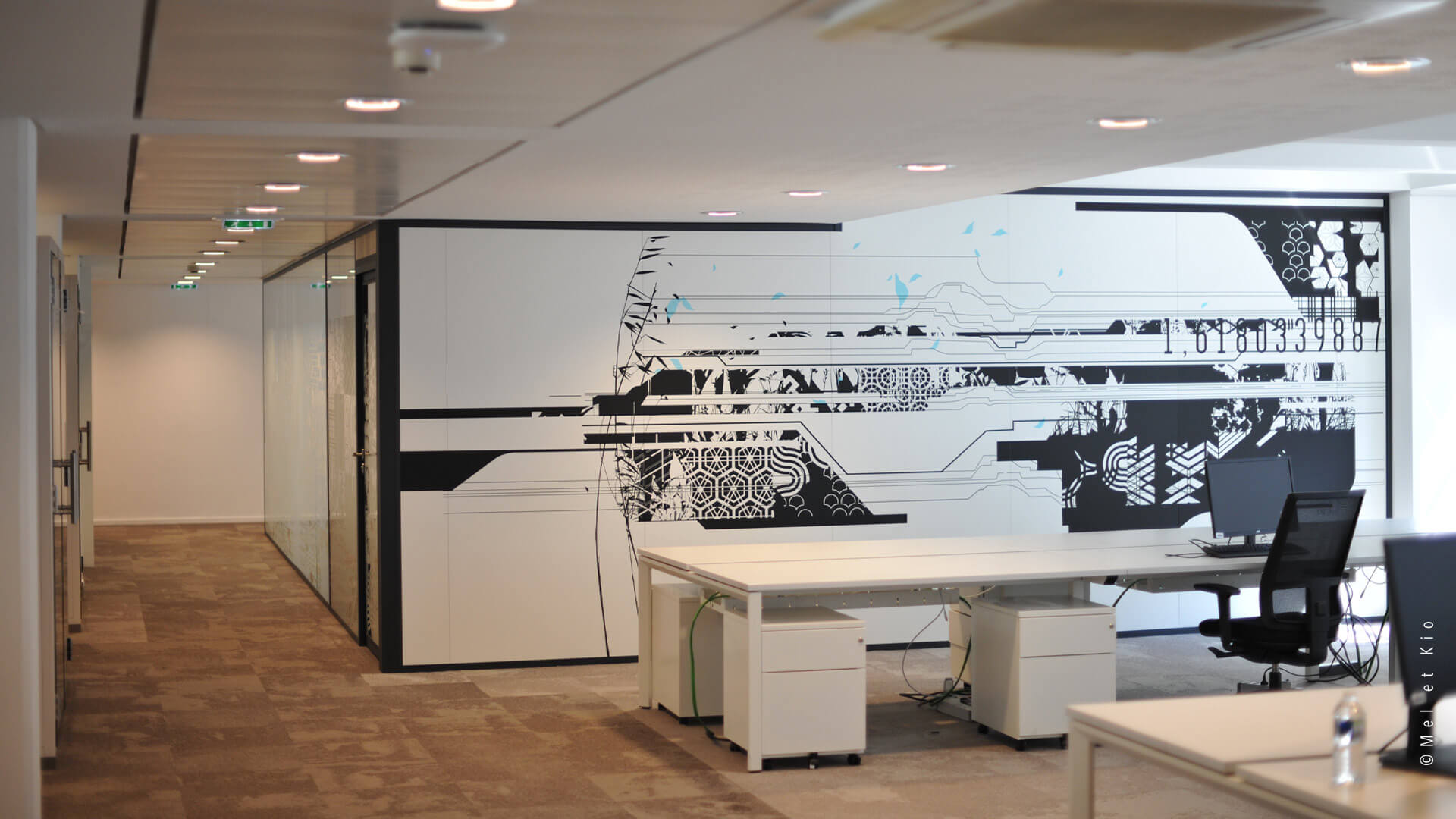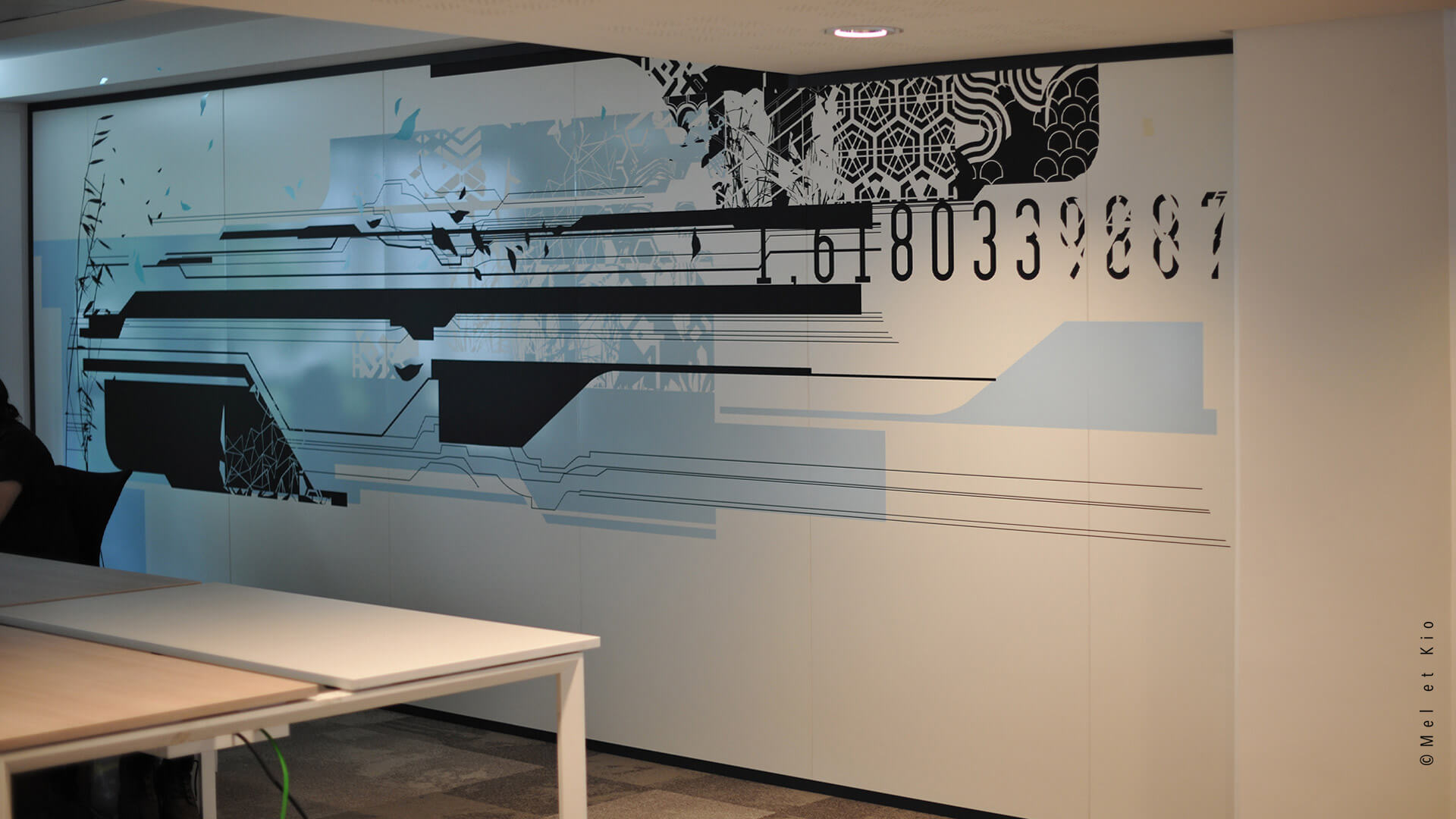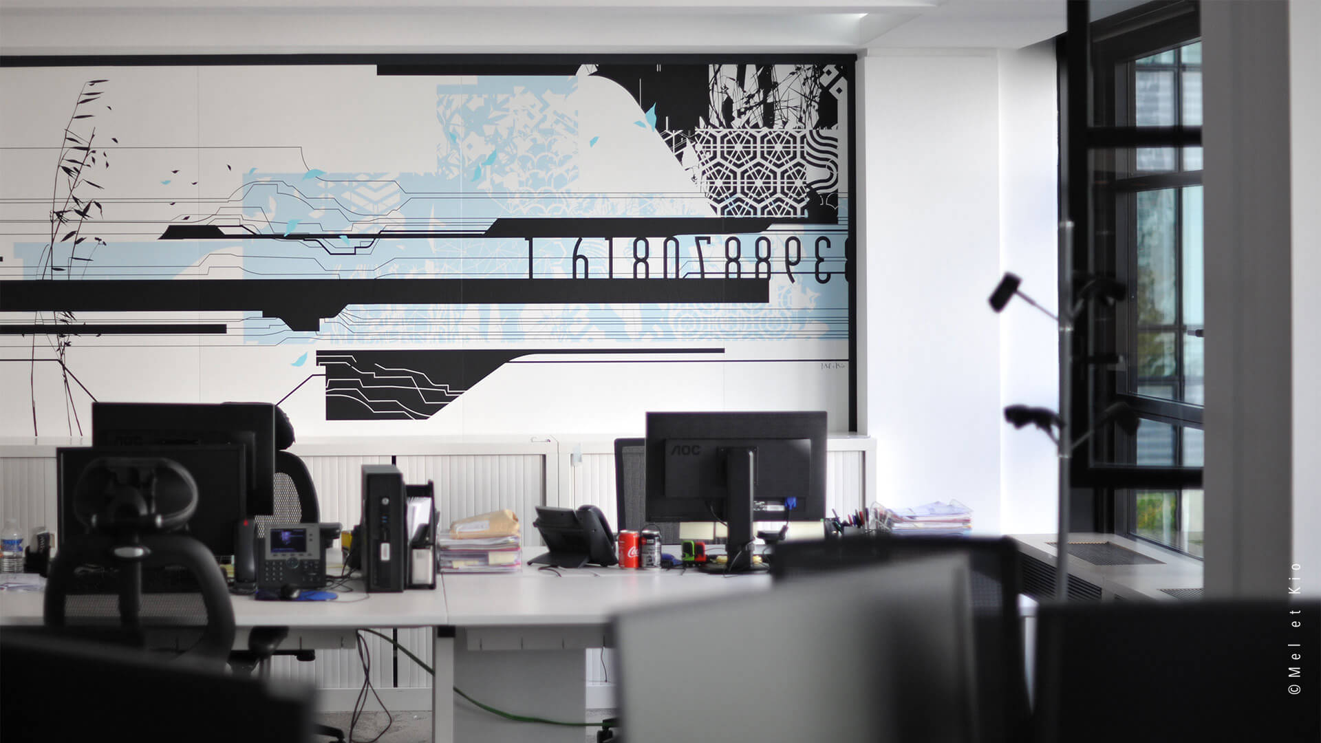 Les fresques murales sur mesure sont la spécialité des deux artistes Mel et Kio. Ils ont ici été sollicité par le siège de l’entreprise Free afin de donner une identité forte aux bureaux. Les collaborateurs peuvent ainsi travailler dans un espace graphique qui relève de l’ADN du groupe et de leur activité. Ces fresques résolument contemporaines marquent les circulations de la signature caractéristique de Mel et Kio.