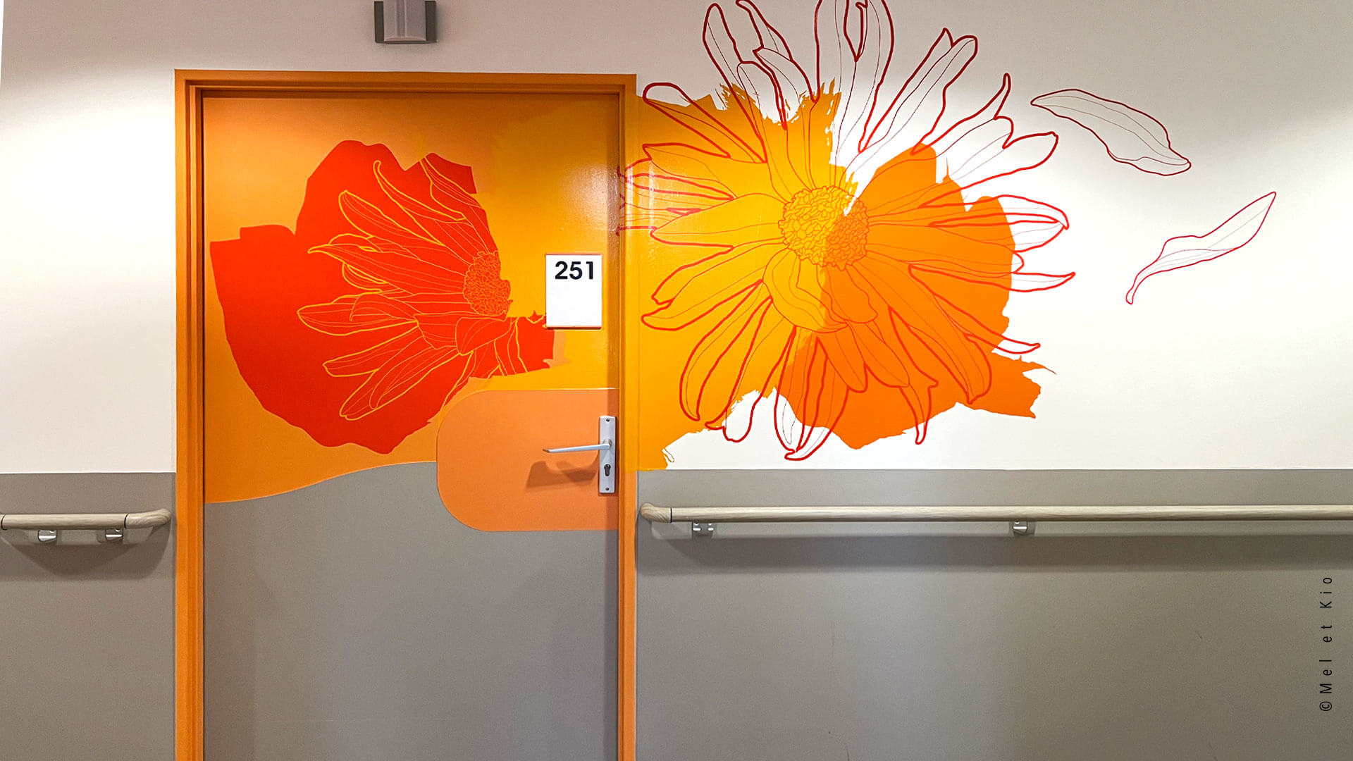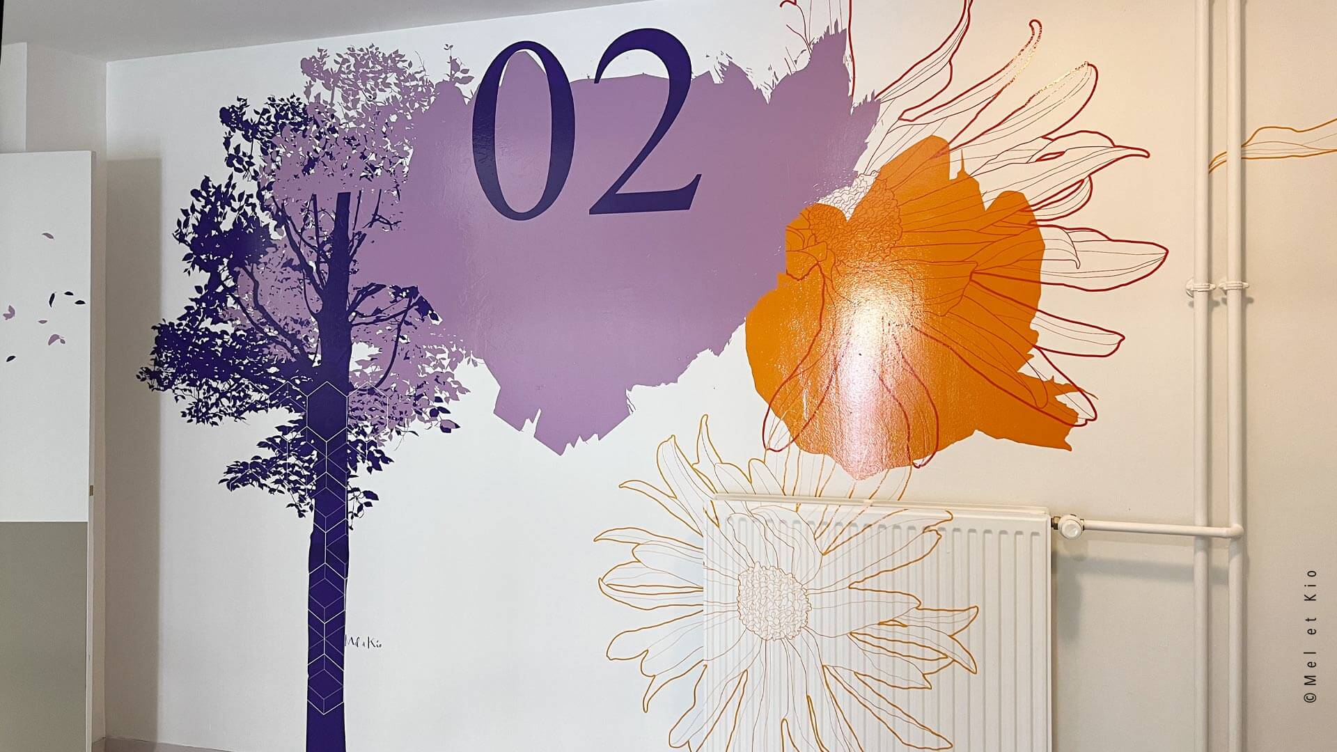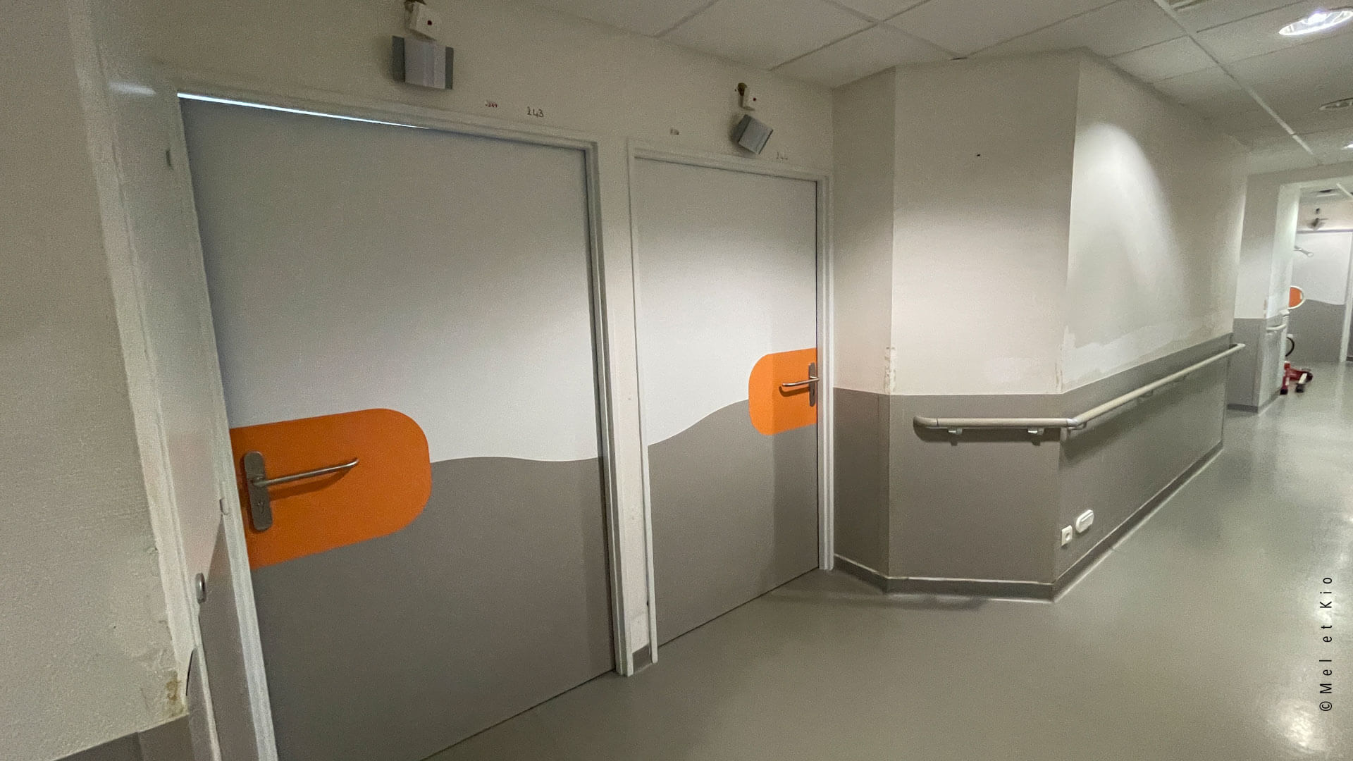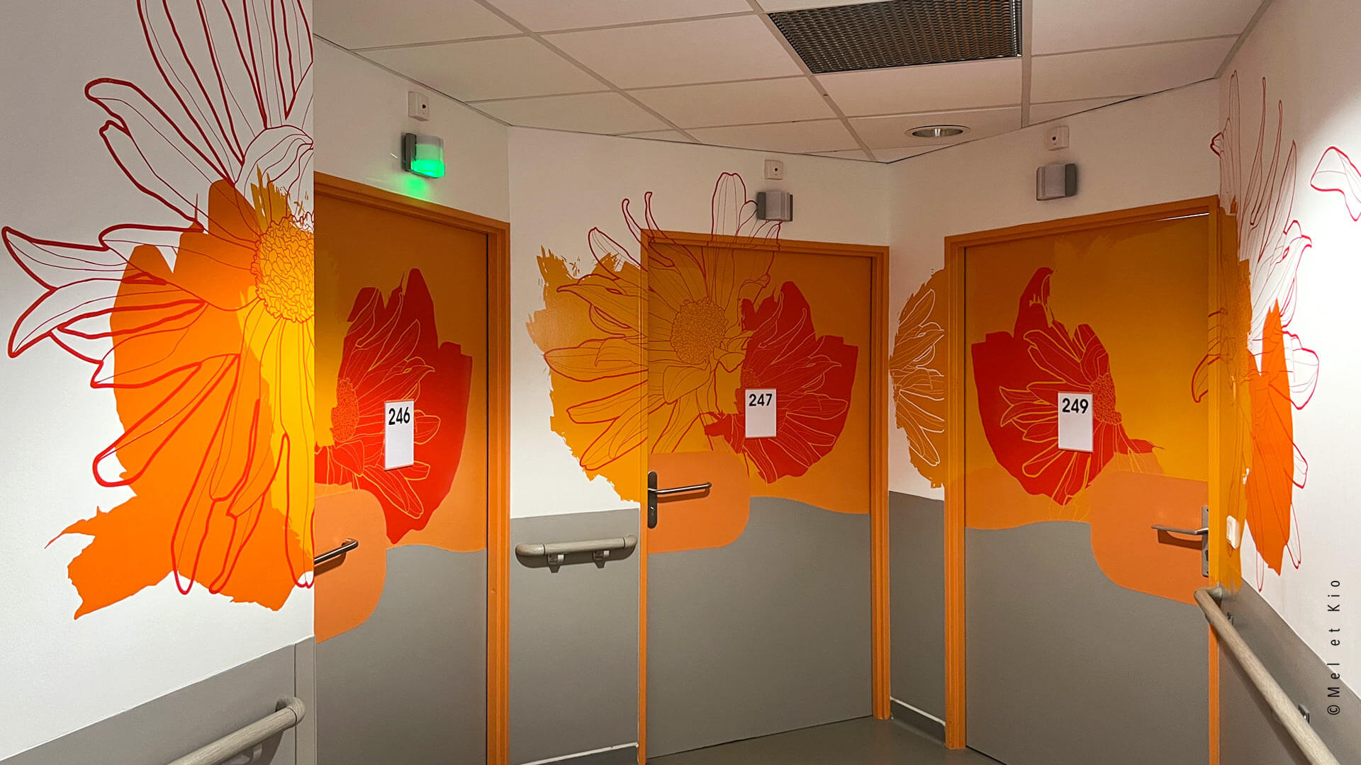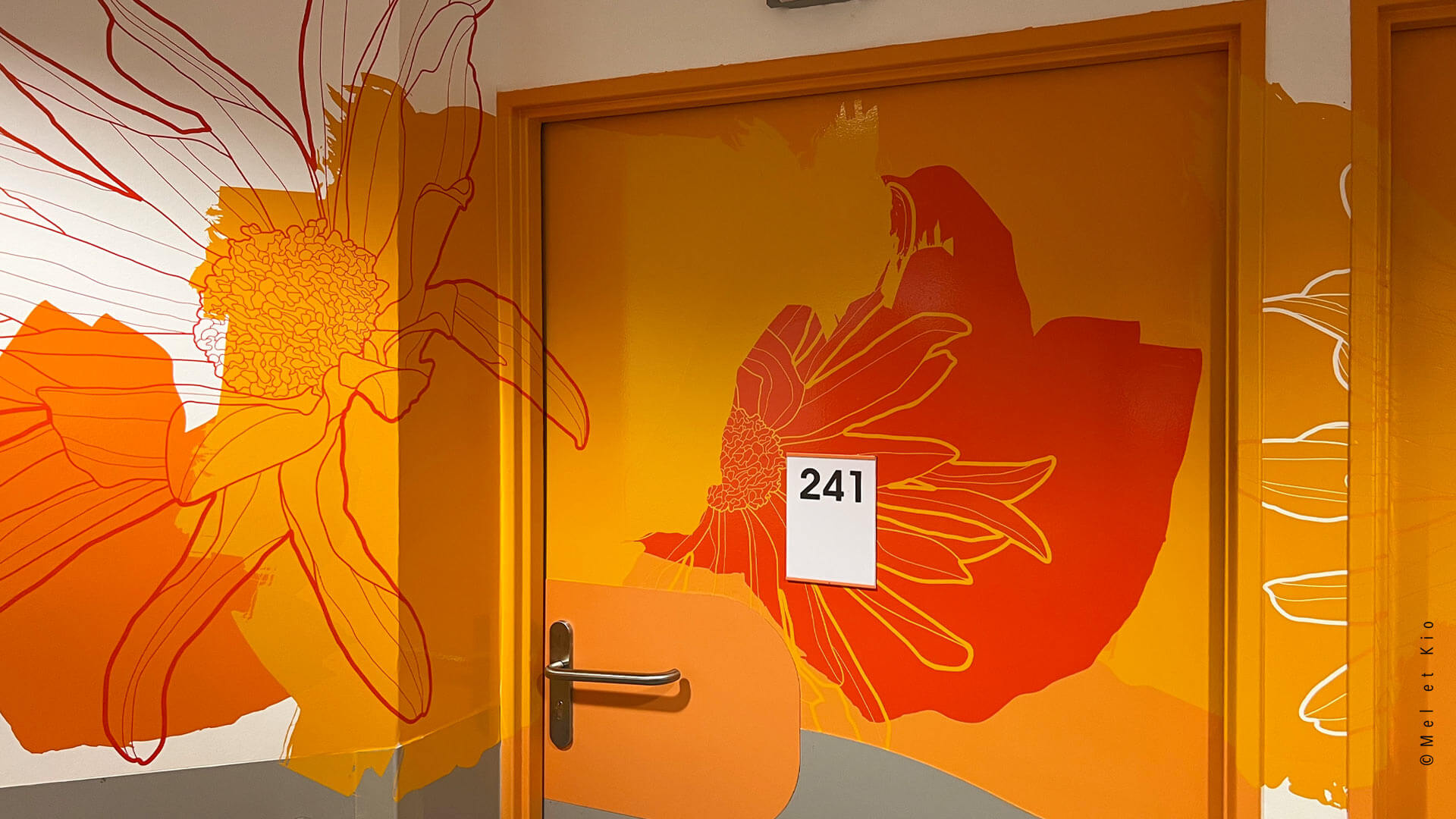 L’Orsac a commandé une scénographie murale au duo d’artistes Mel et Kio. La réhabilitation du bâtiment allait de paire avec une réflexion sur la lecture des services et l’identité murale. Les dessins sur murs et portes ré-enchantent l’espace. Les artistes wall art spécialistes de l’identité des lieux proposent des fresques originales qui permettent d’identifier les espaces en incluant la signalétique.