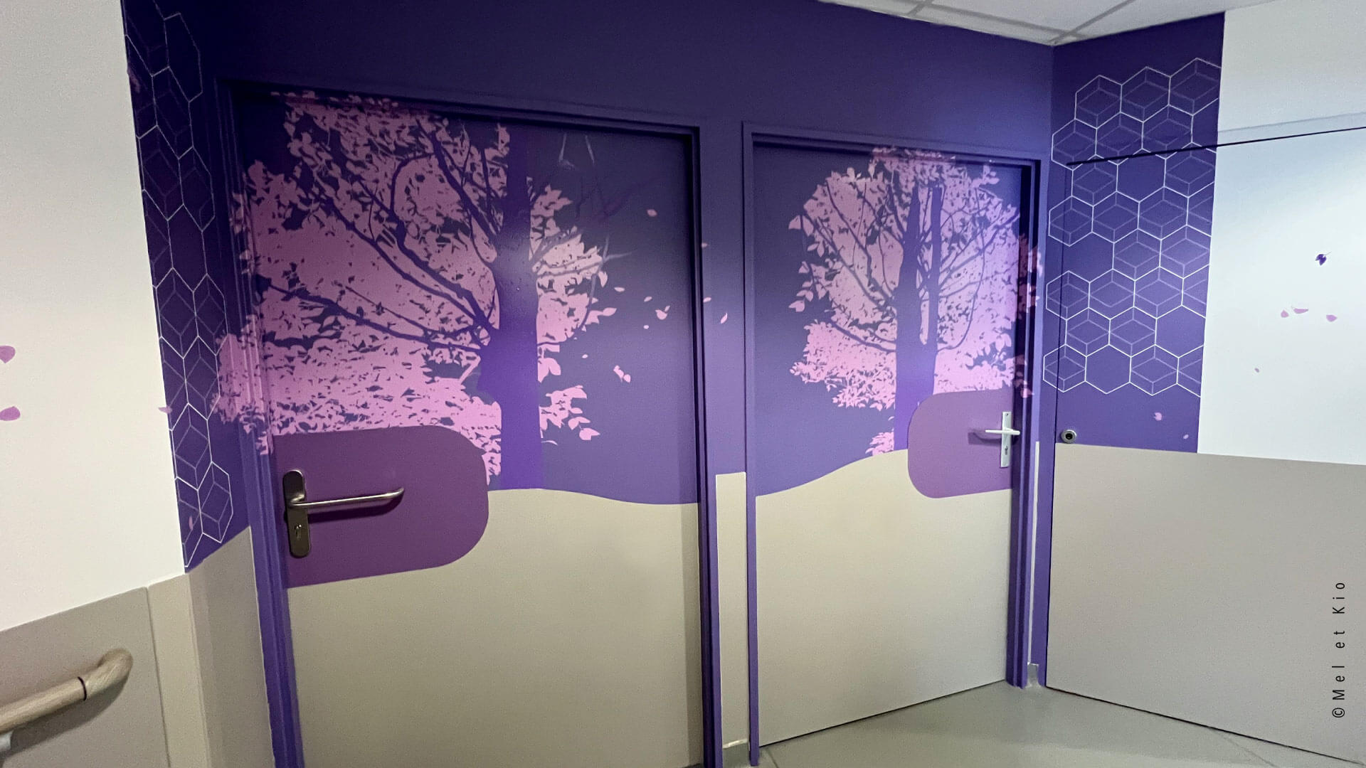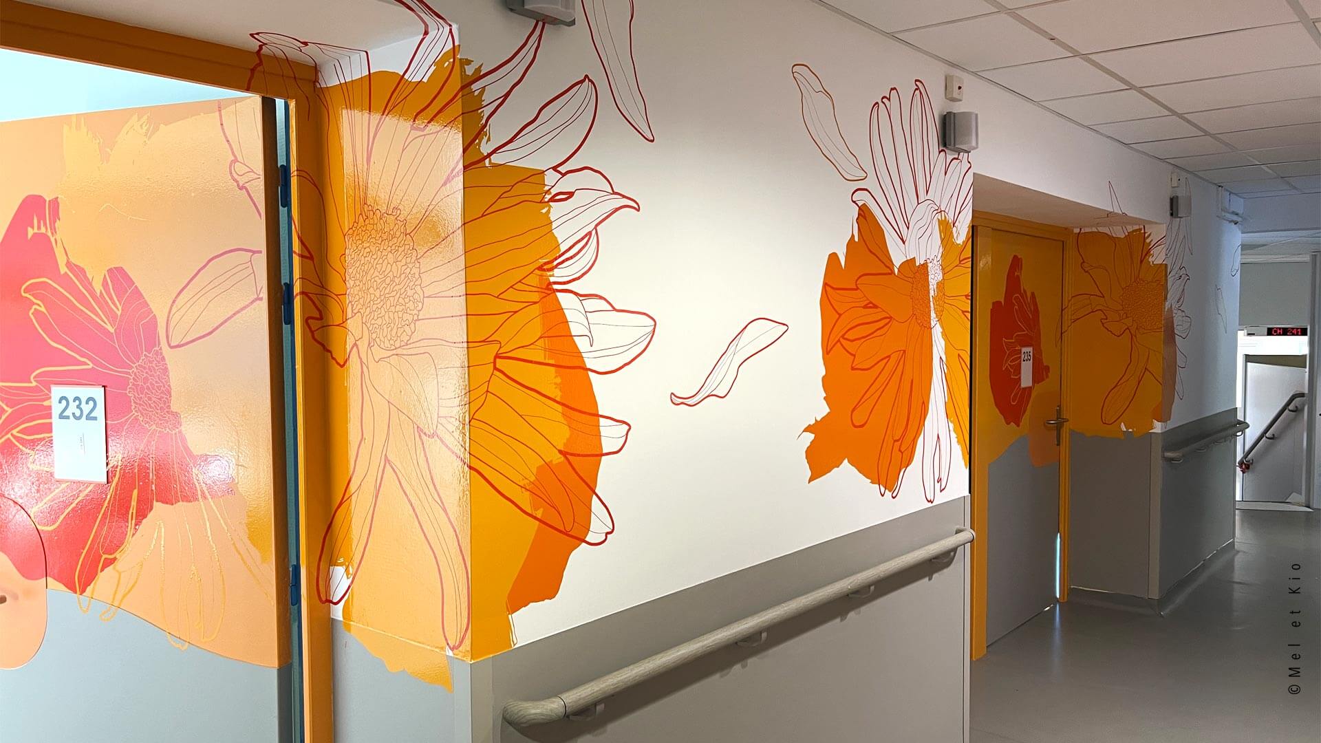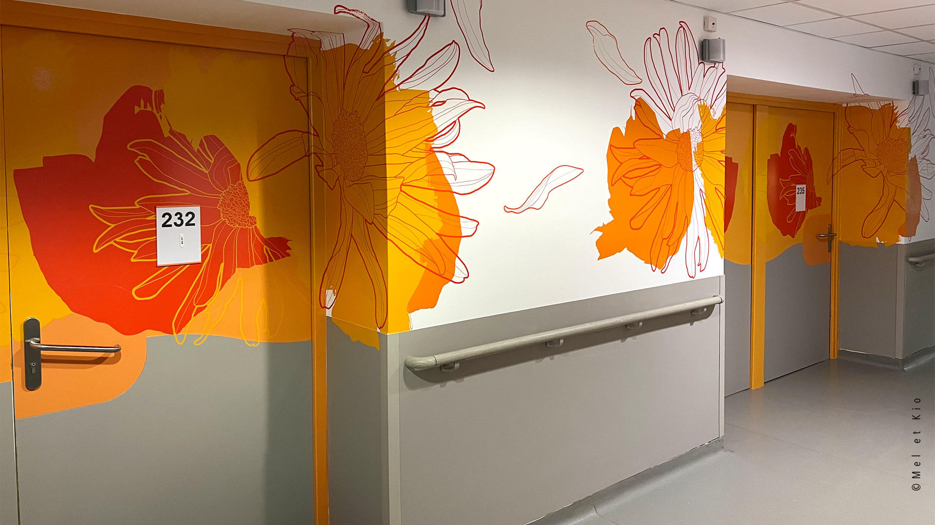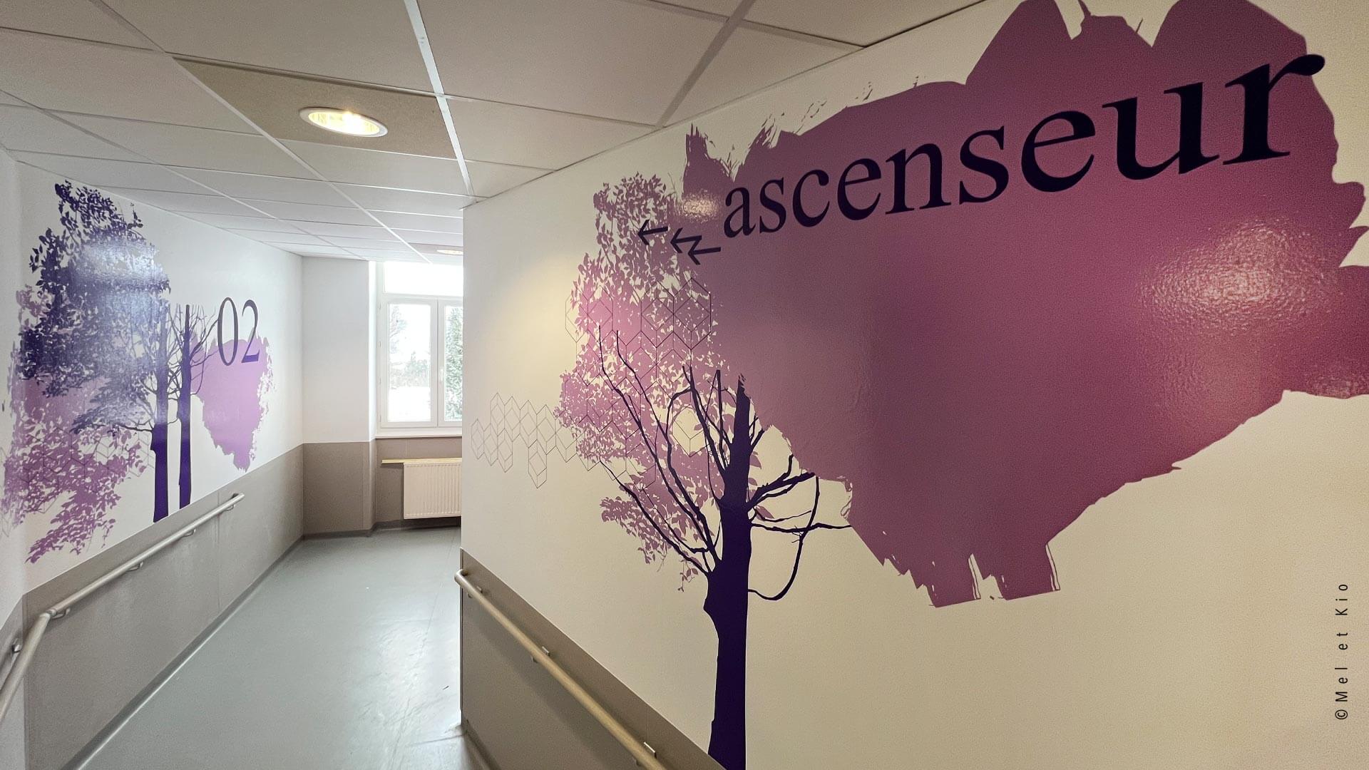 L’Orsac a commandé une scénographie murale au duo d’artistes Mel et Kio. La réhabilitation du bâtiment allait de paire avec une réflexion sur la lecture des services et l’identité murale. Les dessins sur murs et portes ré-enchantent l’espace. Les artistes wall art spécialistes de l’identité des lieux proposent des fresques originales qui permettent d’identifier les espaces en incluant la signalétique.