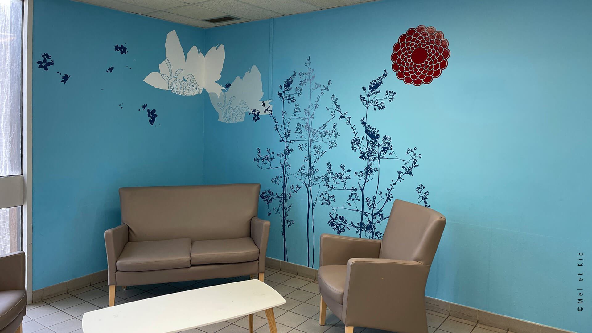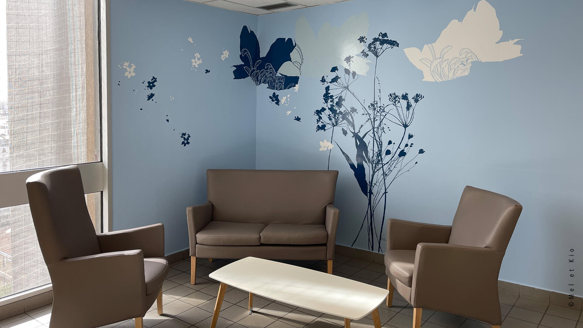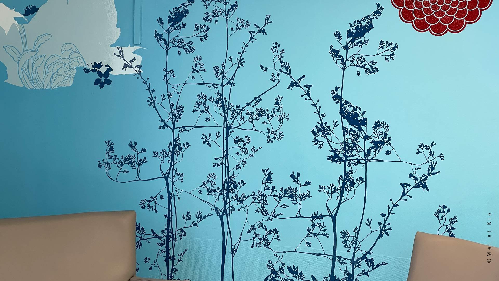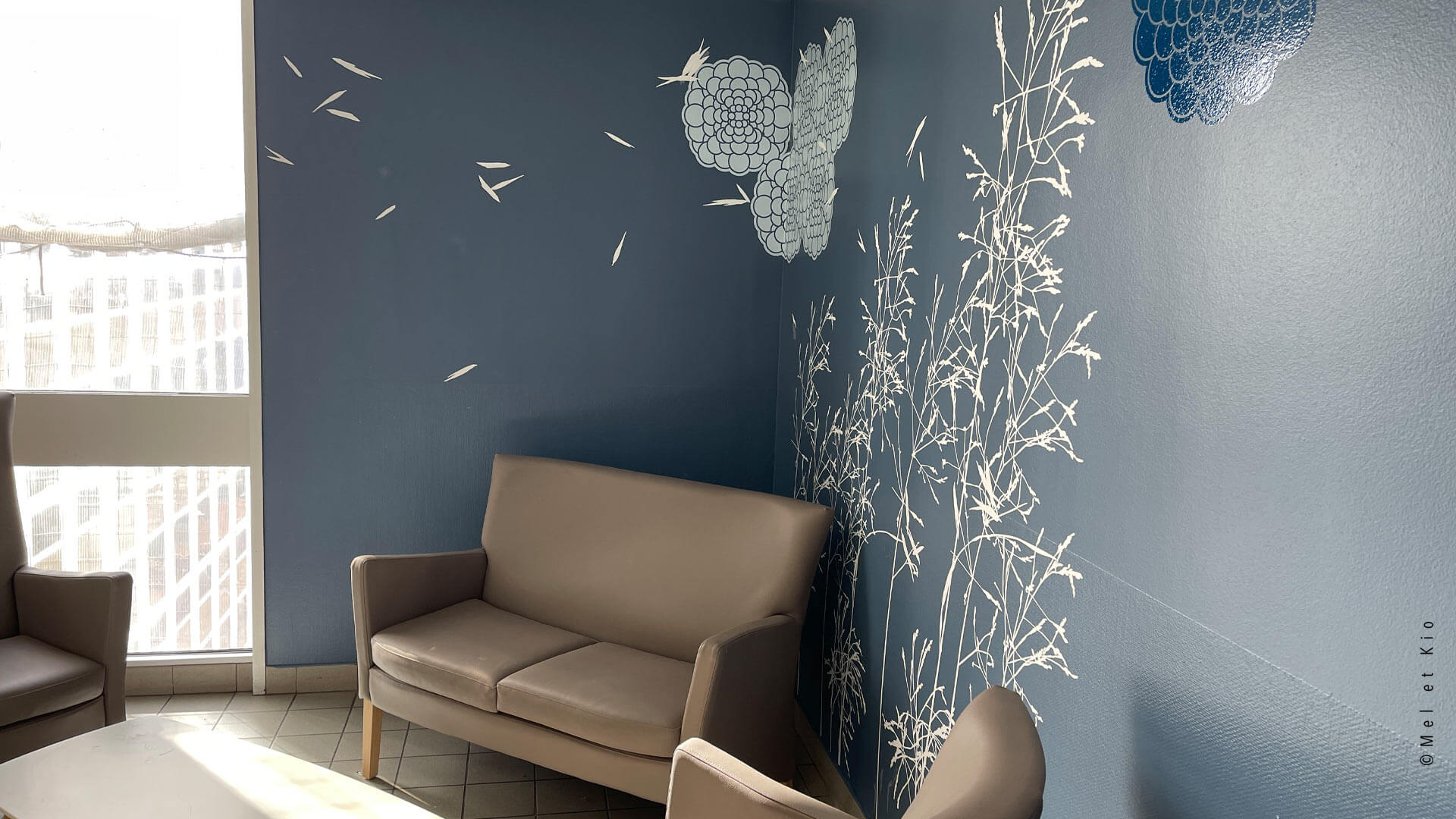 Les fresques murales issues de la gamme originale les ©Murmures dessinées par Mel et Kio viennent décorer les salons s’attente des 6 étages de l’hôpital. Cette gamme exclusive est à retrouver en vente en ligne sur le site https://poeticwall.fr