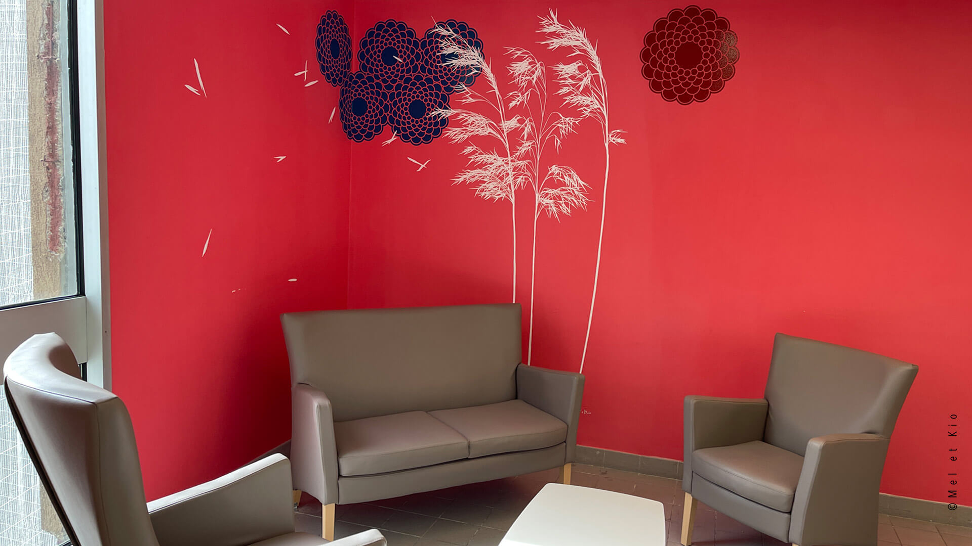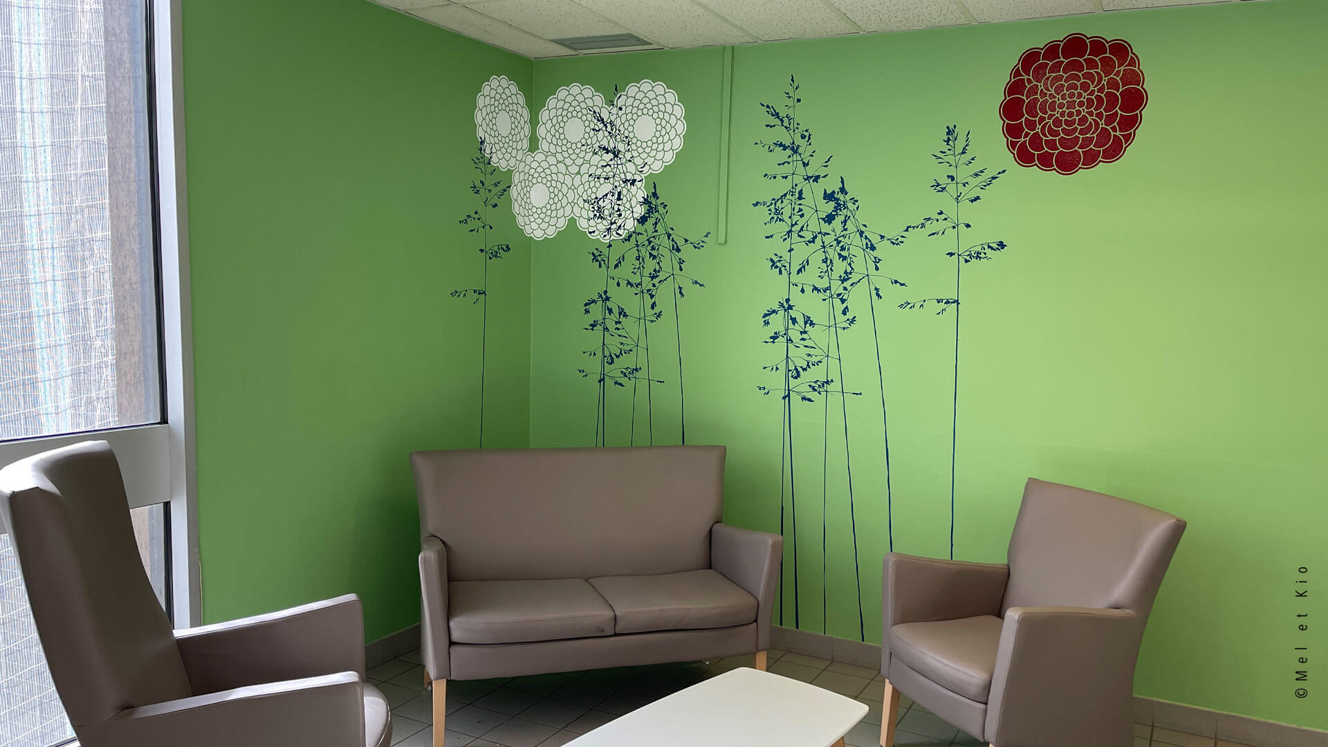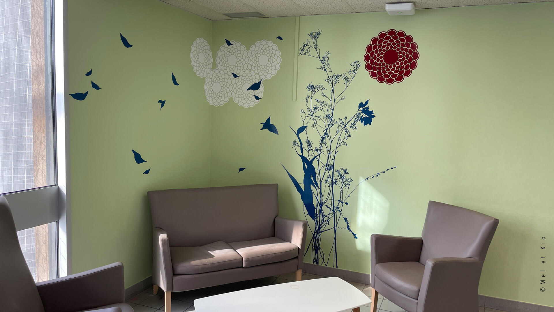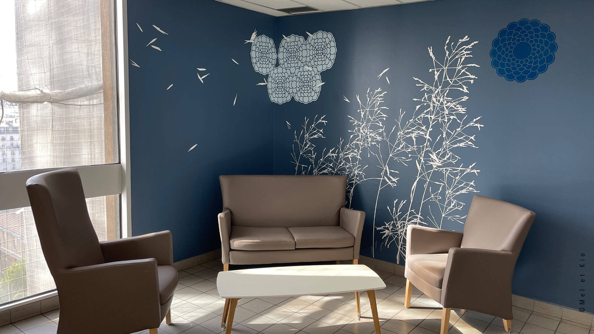 Les fresques murales issues de la gamme originale les ©Murmures dessinées par Mel et Kio viennent décorer les salons s’attente des 6 étages de l’hôpital. Cette gamme exclusive est à retrouver en vente en ligne sur le site https://poeticwall.fr