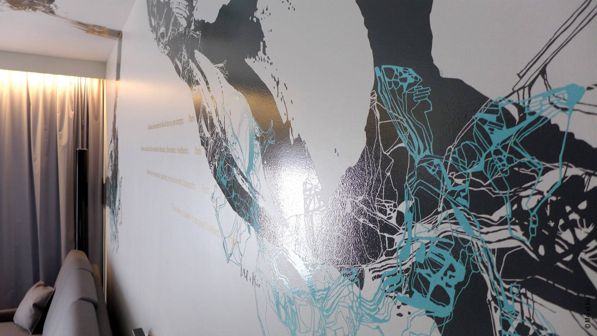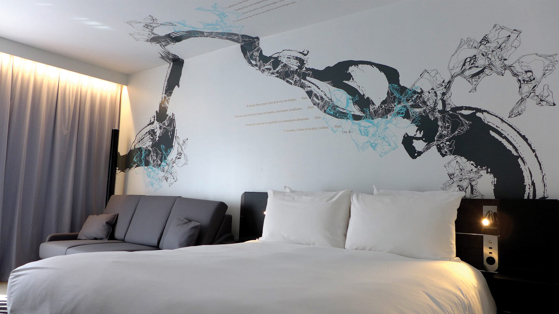 Les chambres d’hôtel ont à présent chacune leur décoration mural qui court même jusqu’au plafond. Les textes originaux sont écrits par Kio et le dessin de la fresque est de Mel. Ainsi, l’identité des lieux est originale et atypique en comparaison à tous les autres Novotel du groupe Accor.