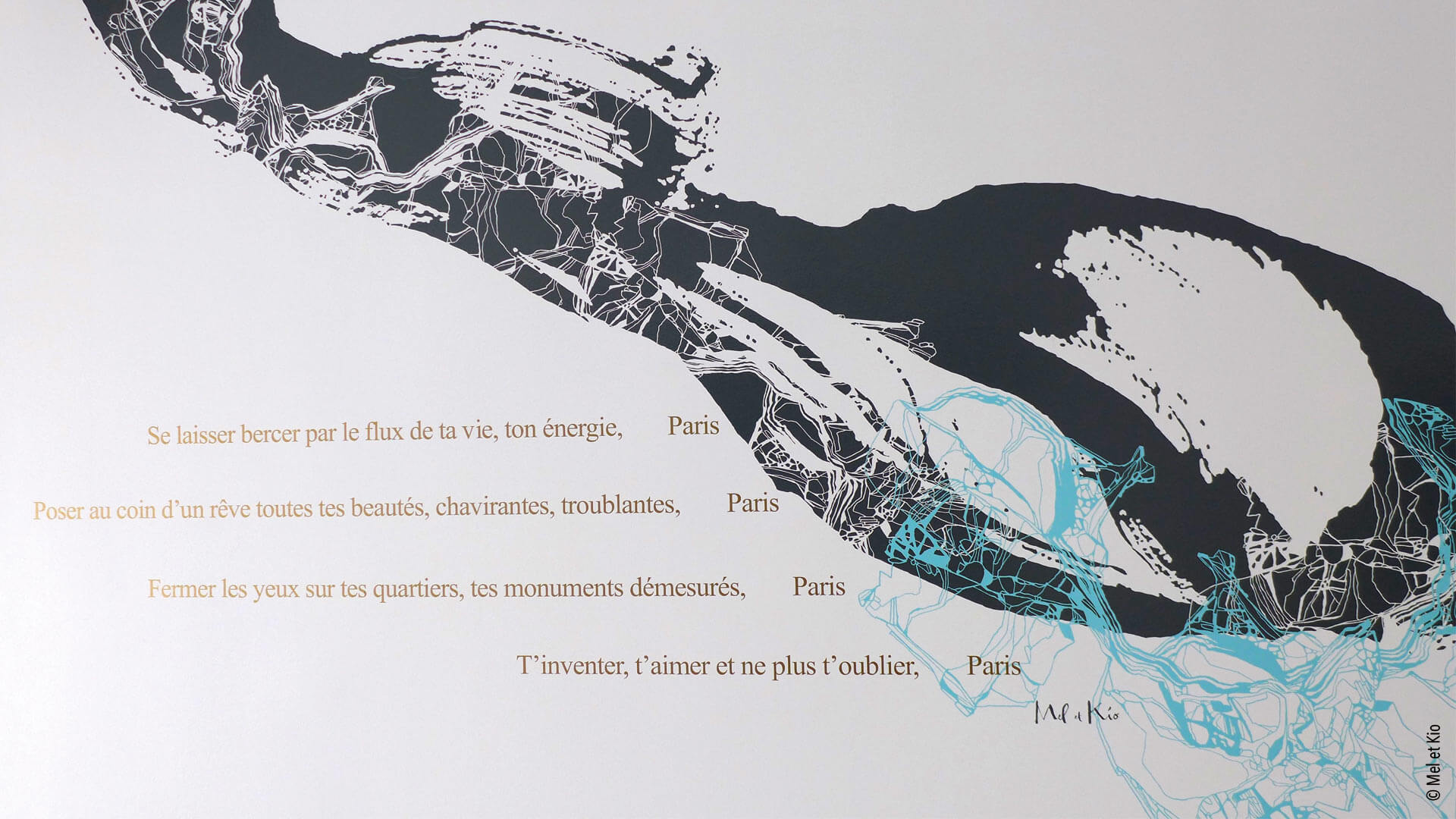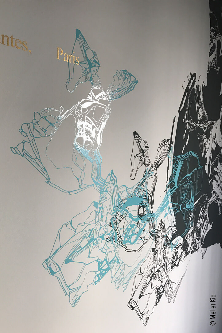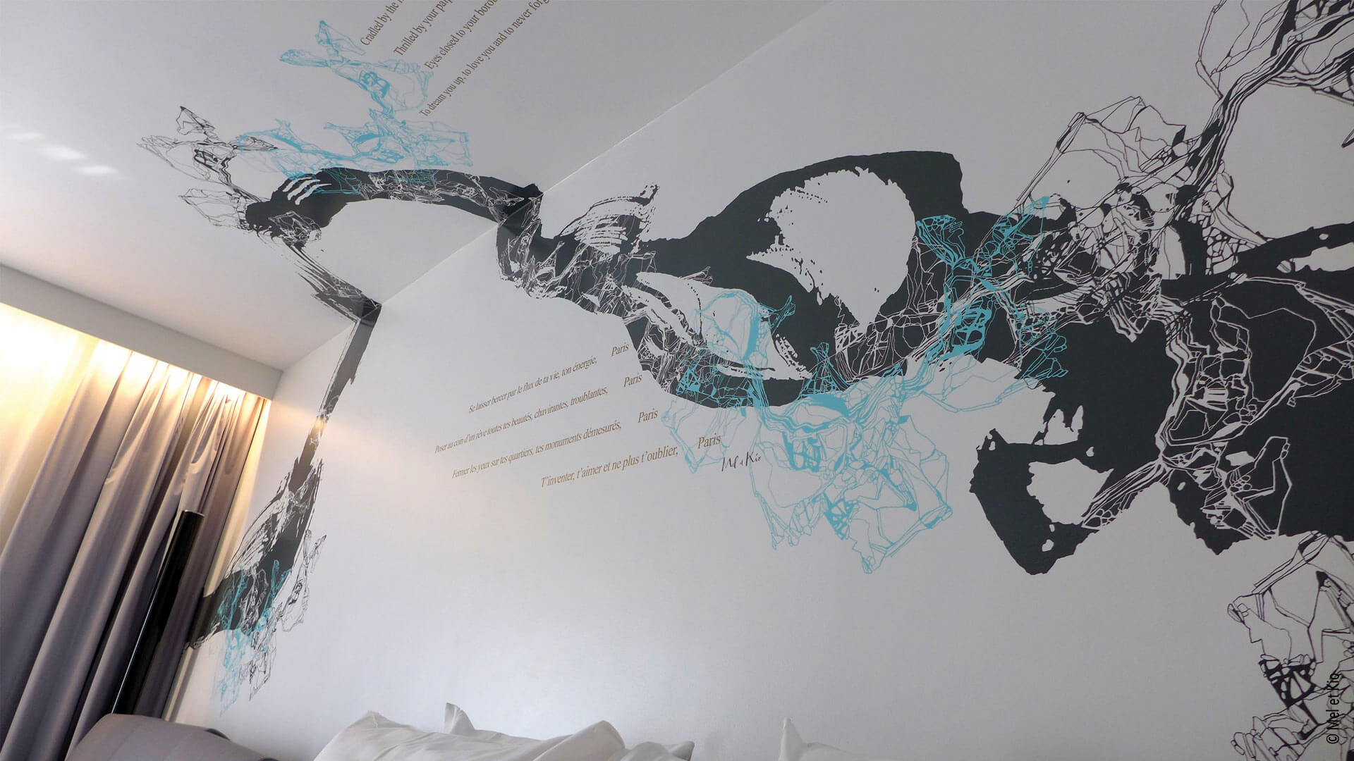 Identité murale et oeuvre sur mesure à l’encre de chine de 47 chambres pour l’hôtel Novotel les Halles. Mel et Kio signent d’une trace géante à l’encre de chine caractéristique du style des deux artistes specialistes en conseil d’identité des leiux.