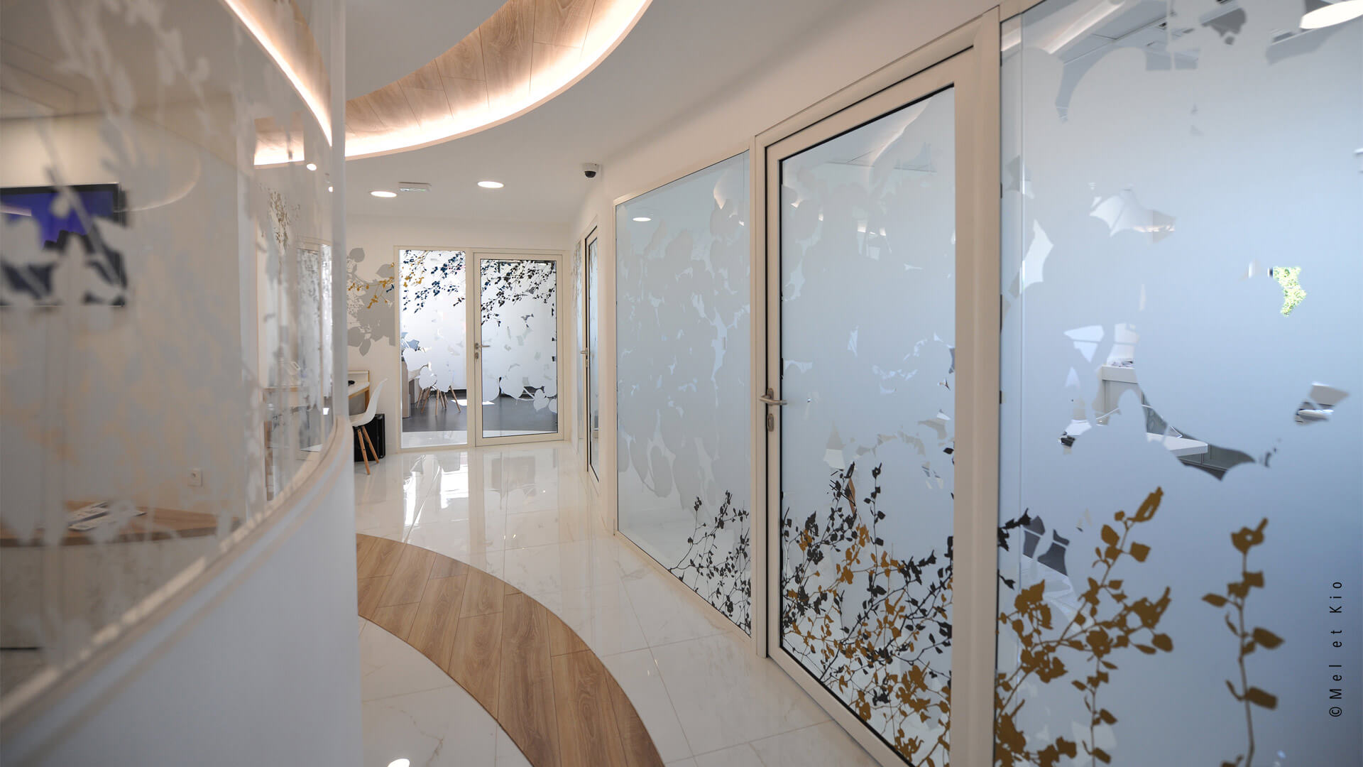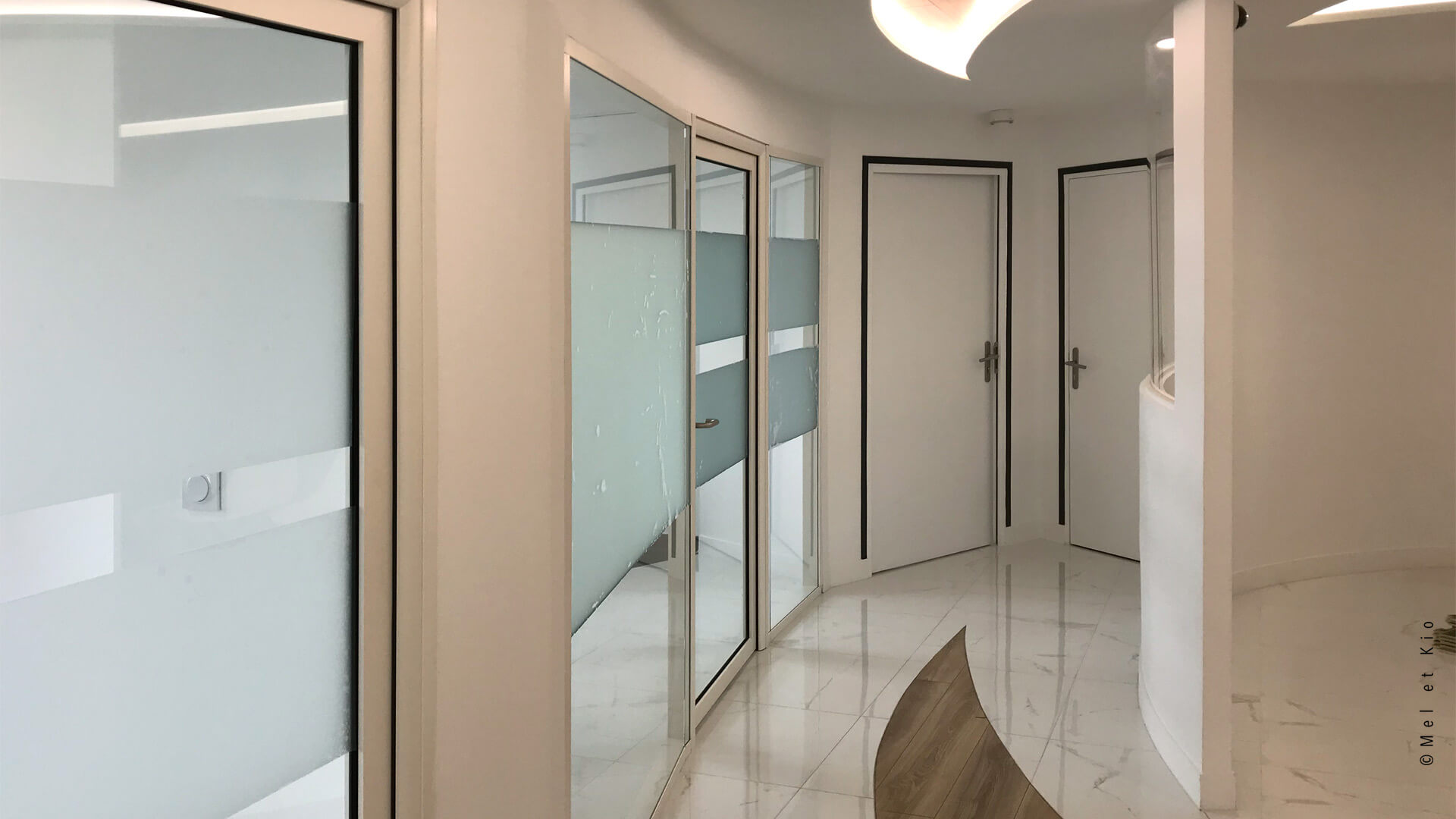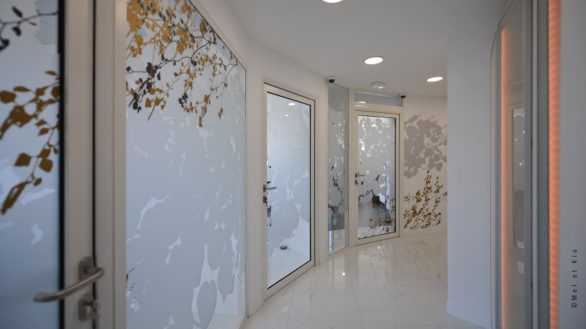 Vitrophanies sur cloisons vitrées dans un cabinet dentaire pour cacher la vue des salles de soins.