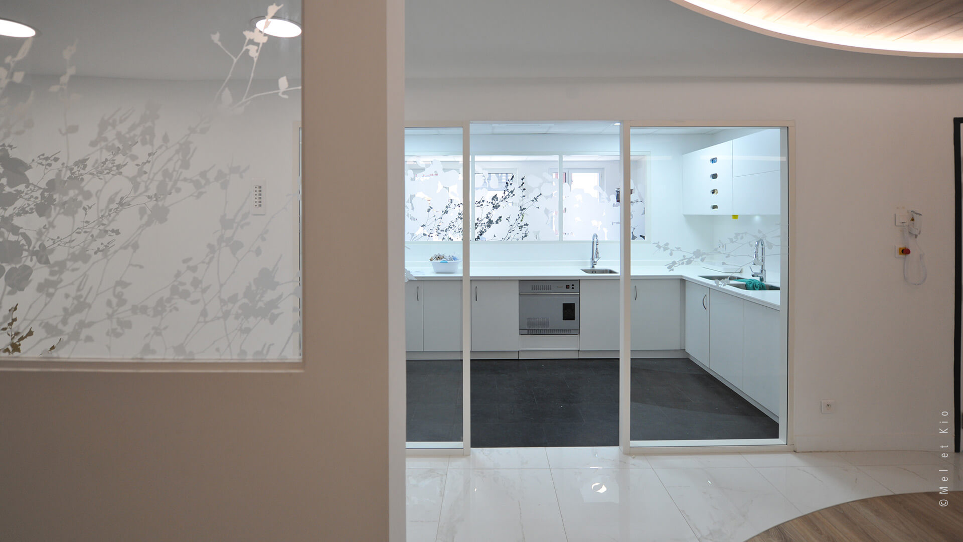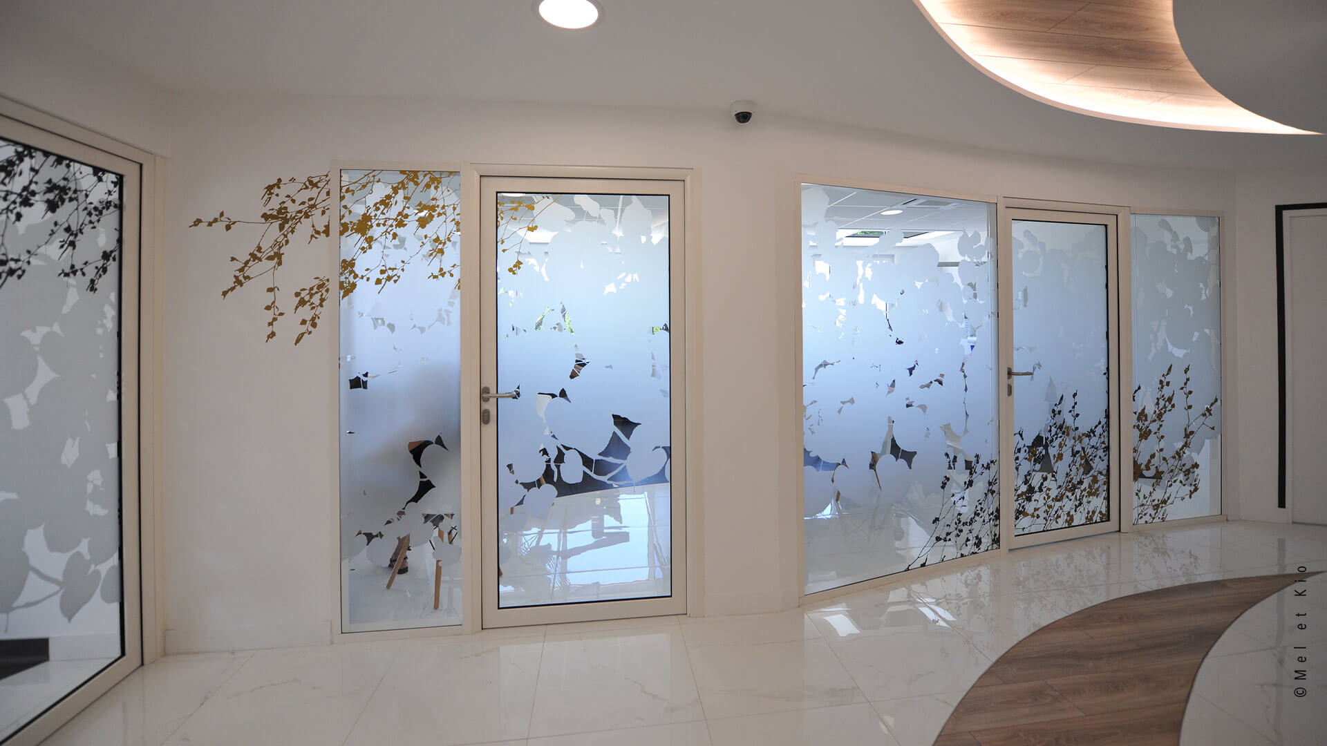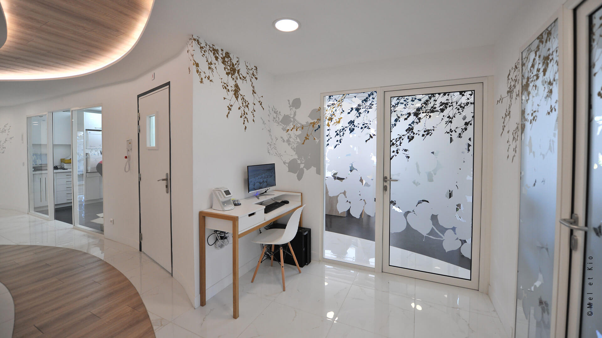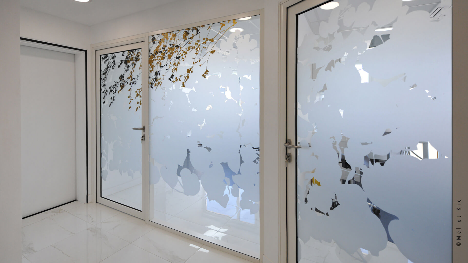Vitrophanies sur cloisons vitrées dans un cabinet dentaire pour cacher la vue des salles de soins.